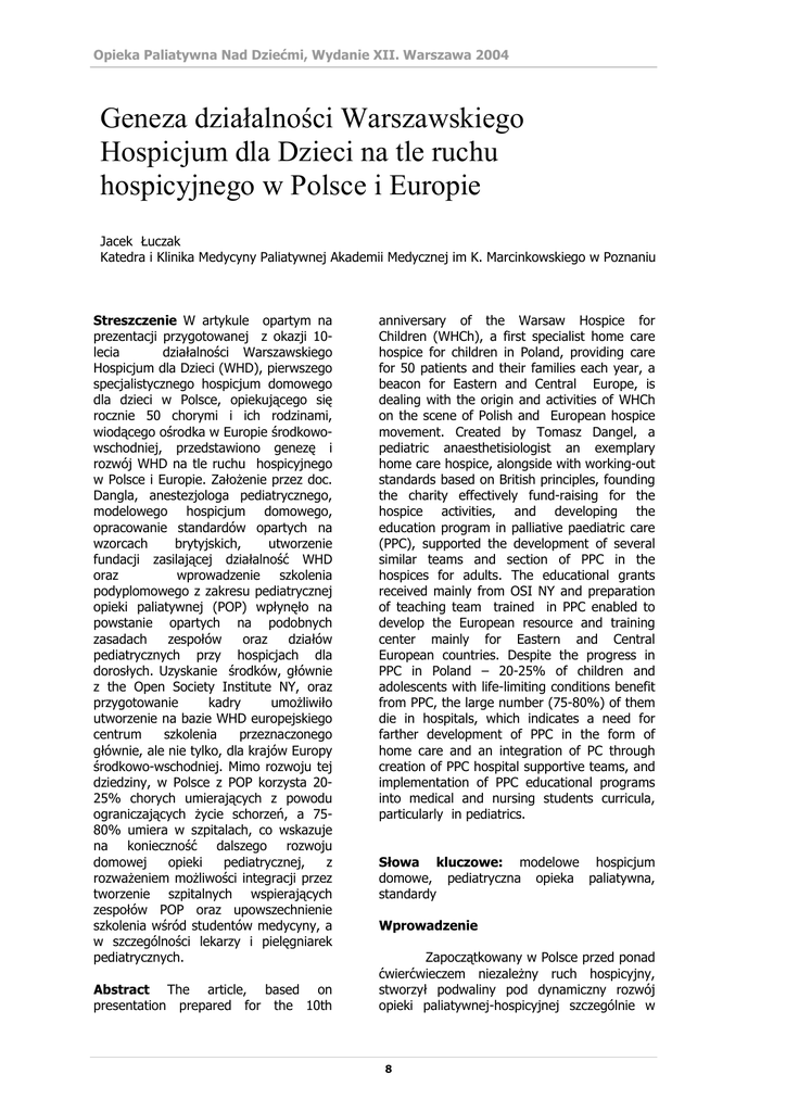 Opieka Paliatywna Nad Dziećmi, Wydanie XII. Warszawa 2004 Geneza działalności Warszawskiego Hospicjum dla Dzieci na tle ruchu hospicyjnego w Polsce i Europie Jacek Łuczak Katedra i Klinika Medycyny Paliatywnej Akademii Medycznej im K. Marcinkowskiego w Poznaniu Streszczenie W artykule opartym na prezentacji przygotowanej z okazji 10lecia działalności Warszawskiego Hospicjum dla Dzieci (WHD), pierwszego specjalistycznego hospicjum domowego dla dzieci w Polsce, opiekującego się rocznie 50 chorymi i ich rodzinami, wiodącego ośrodka w Europie środkowowschodniej, przedstawiono genezę i rozwój WHD na tle ruchu hospicyjnego w Polsce i Europie. Założenie przez doc. Dangla, anestezjologa pediatrycznego, modelowego hospicjum domowego, opracowanie standardów opartych na wzorcach brytyjskich, utworzenie fundacji zasilającej działalność WHD oraz wprowadzenie szkolenia podyplomowego z zakresu pediatrycznej opieki paliatywnej (POP) wpłynęło na powstanie opartych na podobnych zasadach zespołów oraz działów pediatrycznych przy hospicjach dla dorosłych. Uzyskanie środków, głównie z the Open Society Institute NY, oraz przygotowanie kadry umożliwiło utworzenie na bazie WHD europejskiego centrum szkolenia przeznaczonego głównie, ale nie tylko, dla krajów Europy środkowo-wschodniej. Mimo rozwoju tej dziedziny, w Polsce z POP korzysta 2025% chorych umierających z powodu ograniczających życie schorzeń, a 7580% umiera w szpitalach, co wskazuje na konieczność dalszego rozwoju domowej opieki pediatrycznej, z rozważeniem możliwości integracji przez tworzenie szpitalnych wspierających zespołów POP oraz upowszechnienie szkolenia wśród studentów medycyny, a w szczególności lekarzy i pielęgniarek pediatrycznych. Abstract The article, based on presentation prepared for the 10th anniversary of the Warsaw Hospice for Children (WHCh), a first specialist home care hospice for children in Poland, providing care for 50 patients and their families each year, a beacon for Eastern and Central Europe, is dealing with the origin and activities of WHCh on the scene of Polish and European hospice movement. Created by Tomasz Dangel, a pediatric anaesthetisiologist an exemplary home care hospice, alongside with working-out standards based on British principles, founding the charity effectively fund-raising for the hospice activities, and developing the education program in palliative paediatric care (PPC), supported the development of several similar teams and section of PPC in the hospices for adults. The educational grants received mainly from OSI NY and preparation of teaching team trained in PPC enabled to develop the European resource and training center mainly for Eastern and Central European countries. Despite the progress in PPC in Poland – 20-25% of children and adolescents with life-limiting conditions benefit from PPC, the large number (75-80%) of them die in hospitals, which indicates a need for farther development of PPC in the form of home care and an integration of PC through creation of PPC hospital supportive teams, and implementation of PPC educational programs into medical and nursing students curricula, particularly in pediatrics. Słowa kluczowe: modelowe hospicjum domowe, pediatryczna opieka paliatywna, standardy Wprowadzenie Zapoczątkowany w Polsce przed ponad ćwierćwieczem niezależny ruch hospicyjny, stworzył podwaliny pod dynamiczny rozwój opieki paliatywnej-hospicyjnej szczególnie w 8 Opieka Paliatywna Nad Dziećmi, Wydanie XII. Warszawa 2004 Hospice International (CHI) opracowała standardy opieki paliatywnej nad dziećmi. W 1996 roku w Wielkiej Brytanii Królewskie Towarzystwo Pediatryczne (RCPCH) oraz Stowarzyszenie opieki nad dziećmi z zagrażającymi życiu schorzeniami oraz chorobami terminalnymi (ACT) wyłoniły grupę roboczą, która w oparciu o kartę ATC opracowaną w 1993 roku (informację o tym ważnym dokumencie zostały udostępnione po raz pierwszy przez doc. Dangla uczestnikom kursu opieki paliatywnej – pod kierunkiem R. Twycross i J. Łuczaka: Symptom control in terminal illness w Olczy 30 maja - 1 czerwca 1994 roku) wyodrębniła cztery grupy dzieci z ograniczającymi życie schorzeniami, kwalifikującymi się do objęcia opieką paliatywną. [3] Na następnym tego typu kursie w Puszczykowie, doc. Dangel przedstawił zasady opieki domowej nad umierającymi dziećmi po raz pierwszy zapoznając uczestników z kartą ATC oraz doświadczeniami niedawno założonego WHD. [2] W okresie gdy powstawało WHD, w Europie, szczególnie w Wielkiej Brytanii, oraz w Stanach Zjednoczonych i Kanadzie istniały w tym czasie wyodrębnione hospicja dziecięce. Poza opieką domową i wsparciem dla osieroconych część z nich zapewniała również opiekę stacjonarną, rzadziej dzienną. Równolegle z WHD pierwsze kroki stawiało domowe hospicjum dla dzieci w Mińsku [4] kierowane przez dr psychologii Annę Gorczakową oraz dziecięce hospicjum domowe w Moskwie (dr Marina Bialik informacja od założycielki). latach 1993-2003, wspomagany od 1991 roku przez Ministerstwo Zdrowia regulacjami prawnymi z tego zakresu, w tym radykalnymi zmianami poprawiającymi dostępność analgetyków opioidowych, oraz środkami finansowymi przekazywanymi głównie na edukację i sprzęt medyczny, środki transportu, a także utworzeniem specjalizacji z zakresu medycyny paliatywnej (1999). Program Rozwoju Opieki PaliatywnejHospicyjnej MZ (1998) ujął w założeniach programowych upowszechnienie i rozwój opieki paliatywnej u dzieci w oparciu o Warszawskie Hospicjum dla Dzieci (WHD). [1] Do roku 1994, kiedy powstało WHD jako pierwsze w Europie środkowo-wschodniej specjalistyczne pediatryczne hospicjum domowe, ośrodki opieki paliatywnej-hospicyjnej w Polsce przygotowane do opieki nad osobami dorosłymi, głównie z zaawansowaną chorobą nowotworową, jedynie sporadycznie opiekowały się umierającymi dziećmi i młodocianymi. Nie było również z reguły wyos