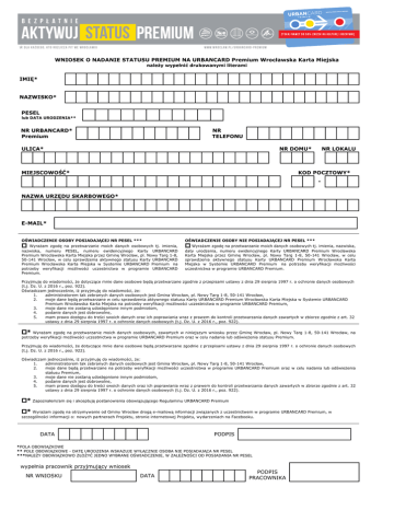 b e z p ł a t n i e * D L A K A ŻD E G O, K T O R O Z L I C Z A P I T W E W R O C Ł A W I U aktywuj premium Z ys k a j n aw e t d o 5 0 % z n i ż e k n a k u lt u r ę i r o z ry w k ę w w w.w r o c l aw. p l / u r b a n c a r d - p r e m i u m WNIOSEK O NADANIE STATUSU PREMIUM NA URBANCARD Premium Wrocáawska Karta Miejska naleĪy wypeániü drukowanymi literami IMIĉ* NAZWISKO* PESEL lub DATA URODZENIA** NR URBANCARD* Premium NR TELEFONU ULICA* NR DOMU* MIEJSCOWOĝû* NR LOKALU KOD POCZTOWY* - NAZWA URZĉDU SKARBOWEGO* E-MAIL* OĝWIADCZENIE OSOBY POSIADAJĄCEJ NR PESEL *** WyraĪam zgodĊ na przetwarzanie moich danych osobowych tj. imienia, nazwiska, numeru PESEL, numeru ewidencyjnego Karty URBANCARD Premium Wrocáawska Karta Miejska przez GminĊ Wrocáaw, pl. Nowy Targ 1-8, 50-141 Wrocáaw, w celu sprawdzenia aktywnego statusu Karty URBANCARD Premium Wrocáawska Karta Miejska w Systemie URBANCARD Premium na potrzeby weryfikacji moĪliwoĞci uczestnictwa w programie URBANCARD Premium. OĝWIADCZENIE OSOBY NIE POSIADAJĄCEJ NR PESEL *** WyraĪam zgodĊ na przetwarzanie moich danych osobowych tj. imienia, nazwiska, daty urodzenia, numeru ewidencyjnego Karty URBANCARD Premium Wrocáawska Karta Miejska przez GminĊ Wrocáaw, pl. Nowy Targ 1-8, 50-141 Wrocáaw, w celu sprawdzenia aktywnego statusu Karty URBANCARD Premium Wrocáawska Karta Miejska w Systemie URBANCARD Premium na potrzeby weryfikacji moĪliwoĞci uczestnictwa w programie URBANCARD Premium. PrzyjmujĊ do wiadomoĞci, Īe dotyczące mnie dane osobowe bĊdą przetwarzane zgodnie z przepisami ustawy z dnia 29 sierpnia 1997 r. o ochronie danych osobowych (t.j. Dz. U. z 2016 r., poz. 922). OĞwiadczam jednoczeĞnie, iĪ przyjmujĊ do wiadomoĞci, Īe: 1. administratorem tak zebranych danych osobowych jest Gmina Wrocáaw, pl. Nowy Targ 1-8, 50-141 Wrocáaw, 2. moje dane bĊdą przetwarzane w celu sprawdzenia aktywnego statusu Karty URBANCARD Premium Wrocáawska Karta Miejska w Systemie URBANCARD Premium Wrocáawska Karta Miejska na potrzeby weryfikacji moĪliwoĞci uczestnictwa w programie URBANCARD Premium, 3. moje dane nie zostaną udostĊpnione innym podmiotom, 4. podanie danych jest dobrowolne, 5. mam prawo dostĊpu do treĞci swoich danych oraz ich poprawiania wraz z prawem do kontroli przetwarzania danych zawartych w zbiorze zgodnie z art. 32 ustawy z dnia 29 sierpnia 1997 r. o ochronie danych osobowych (t.j. Dz. U. z 2016 r., poz. 922). * WyraĪam zgodĊ na przetwarzanie moich danych osobowych, zawartych w niniejszym wniosku przez GminĊ Wrocáaw, pl. Nowy Targ 1-8, 50-141 Wrocáaw, na potrzeby weryfikacji moĪliwoĞci uczestnictwa w programie URBANCARD Premium oraz w celu nadania lub odĞwieĪenia statusu Premium. PrzyjmujĊ do wiadomoĞci, Īe dotyczące mnie dane osobowe bĊdą przetwarzane zgodnie z przepisami ustawy z dnia 29 sierpnia 1997 r. o ochronie danych osobowych (t.j. Dz. U. z 2016 r., poz. 922). OĞwiadczam jednoczeĞnie, iĪ przyjmujĊ do wiadomoĞci, Īe: 1. administratorem tak zebranych danych osobowych jest Gmina Wrocáaw, pl. Nowy Targ 1-8, 50-141 Wrocáaw, 2. moje dane bĊdą przetwarzane na potrzeby weryfikacji moĪliwoĞci uczestnictwa w programie URBANCARD Premium oraz w celu nadania lub odĞwieĪenia statusu Premium, 3. moje dane nie zostaną udostĊpnione innym podmiotom, 4. podanie danych jest dobrowolne, 5. mam prawo dostĊpu do treĞci swoich danych oraz ich poprawiania wraz z prawem do kontroli przetwarzania danych zawartych w zbiorze zgodnie z art. 32 ustawy z dnia 29 sierpnia 1997 r. o ochronie danych osobowych (t.j. Dz. U. z 2016 r., poz. 922). * Zapoznaáem/am siĊ i akceptujĊ postanowienia obowiązującego Regulaminu URBANCARD Premium * WyraĪam zgodĊ na otrzymywanie od Gminy Wrocáaw drogą e-mailową informacji związanych z uczestnictwem w programie URBANCARD Premium, w szczególnoĞci informacji o: nowych partnerach Projektu, stronie internetowej Projektu, wydarzeniach na Facebooku. DATA PODPIS *POLA OBOWIĄZKOWE ** POLE OBOWIĄZKOWE - DATĉ URODZENIA WSKAZUJE WYàĄCZNIE OSOBA NIE POSIADAJĄCA NR PESEL ***NALEĩY OBOWIĄZKOWO ZàOĩYû JEDNO WYBRANE OĝWIADCZENIE, W ZALEĩNOĝCI OD POSIADANIA NR PESEL wypeánia pracownik przyjmujący wniosek NR WNIOSKU DATA PODPIS PRACOWNIKA
