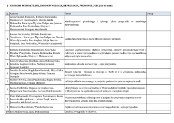 I CHOROBY WEWNĘTRZNE, ENDOKRYNOLOGIA, NEFROLOGIA, PULMONOLOGIA (1h 40 min) Lp. Autorzy Alicja Skuriat-Pośpiech, Elżbieta BandurskaStankiewicz, Ewa Kuglarz, Dorota Wiatr1 Bykowska, Katarzyna Myszka-Podgórska, Joanna Rutkowska, Ewa Poskrobko, Wojciech Matuszewski, Grzegorz Wasilewski Temat Niedoczynność przedniego i tylnego płata przysadki w przebiegu neuroinfekcji. Joanna Rutkowska, Elżbieta BandurskaStankiewicz, Katarzyna Myszka-Podgórska, Dorota 2 Ciężka hiponatremia u pacjentki po operacji tarczycy. Wiatr-Bykowska, Ewa Kuglarz, Alicja SkuriatPośpiech, Ewa Poskrobko, Wojciech Matuszewski Elżbieta Bandurska Stankiewicz, Katarzyna 3 Myszka- Podgórska, Joanna Rutkowska, Dorota Wiatr Bykowska, Wojciech Matuszewski Luiza Grabowska-Skudlarz, Anna Doboszyńska, 4 Jarosław Bogdan Ćwikła, Andrzej Jasiński, Zygmunt Kozielec Zenobia Diaków, Magdalena Koziatek, Alicja Całka, 5 Grzegorz Wasilewski, Jerzy Górny, Tomasz Stompór Norbert Kwella, Anna Pawłowska, Bogna Kwella, 6 Monika Kubiak, Tomasz Stompór 7 Iwona Podlińska, Magdalena Czajkowska, Małgorzata Braczkowska, Dariusz Onichimowski Częstość występowania otyłości brzusznej, stanów przedcukrzycowych i cukrzycy u osób z przypadkowo wykrytymi guzami nadnerczy z prawidłową aktywnością hormonalną. Sarkoidoza układu nerwowego – opis przypadku. Zespół Churga - Strauss u chorego z PChN st V z wrodzoną nefropatią, leczonego hemodializami. Infekcja układu moczowego u pacjenta po trzecim przeszczepieniu nerki. Identyfikacja dawców narządów w Wojewódzkim Szpitalu Specjalistycznym w Olsztynie na tle ogólnokrajowych potrzeb transplantologii. Piotr Malinowski, Przemysław Puszkiewicz, Beata Wczesne powikłania chirurgiczne u pacjentów po przeszczepieniu nerki 8 Januszko-Giergielewicz, Łukasz Smyk, Marta doświadczenia własne ośrodka olsztyńskiego. Jaworska, Wioletta Łuczak 9 Hanna Mańko-Glińska, Wanda Badowska Ciężka wrodzona neurotropenia u rocznego dziecka - opis przypadku. 10 Ewa Malinowska, Anna Doboszyńska Gruźlica. Przypadki 4 chorych. Uwagi II UROLOGIA DZIECIĘCA, CHIRURGIA DZIECIĘCA (2h 20 min) Lp. Autorzy 1 Adam Szendorowicz, Tomasz Janowicz 2 Anna Kujawska, Andrzej Wencław, Wojciech Choiński Temat Uwagi Wrodzona przepuklina przeponowa leczona metodą torakoskopową w okresie niemowlęcym. Tętniak rzekomy tętnicy śledzionowej u 16-letniego pacjenta po tępym urazie brzucha. 3 Tomasz Janowicz, Józef Matel, Wojciech Choiński Skręt jajnika na podłożu torbieli prostej u 8 letniej dziewczynki. 4 Tomasz Janowicz, Wojciech Choiński Leczenie ostrego zapalenia wyrostka robaczkowego u dzieci w latach 2007 2013. 5 6 7 8 9 10 11 12 13 14 Tomasz Janowicz, Michał Puliński, Wojciech Choiński Wojciech Choiński, Maciej Fedoniuk, Michał Puliński, Tomasz Janowicz Bartosz Kotkowicz, Adriana Machalińska, Wojciech Choiński Anna Kujawska, Józef Matel, Halina Zielenkiewicz, Wojciech Choiński Wojciech Choiński, Adam Szendorowicz, Michał Puliński, Grażyna Poniatowska-Broniek, Tomasz Siwko, Anna Kujawska Michał Puliński, Wojciech Choiński, Tomasz Janowicz, Adam Daukszewicz Michał Puliński, Wojciech Choiński, Anna Kujawska Hanna Nosek, Małgorzata Śniadecka, Elżbieta Jarocka-Cyrta Ewa Cichocka-Kurowska, Małgorzata Mroczkowska, Elżbieta Jarocka-Cyrta Jarosław Karowiec, Daria Kozak, Krzysztof Dowgierd Nawrotowa przepuklina przeponowa u rocznej dziewczynki. Leczenie kamicy moczowodowej u dzieci za pomocą ureteroskopii Zbyt późne leczenie wgłobienia krętniczo-kątniczo-okrężniczego przyczyną zespołu krótkiego jelita. Analiza wyników leczenia noworodków z wytrzewieniem wrodzonym. Rzadka lokalizacja potworniaka we wnęce wątroby – laparoskopowy sposób leczenia u dwojga dzieci. Pourazowa torbiel rzekoma trzustki – leczenie drenażem z wykorzystaniem wizualizacji gastroskopem. Zastosowanie kleju tkankowego do mocowania przeszczepu skóry w operacyjnym leczeniu oparzeń u dzieci. Niewydolność oddechowa w przebiegu rabdomiolizy - opis przypadku 16letniego pacjenta. Ostre zapalenie trzustki w przebiegu infekcji rotawirusowej u 9-letniej dziewczynki - opis przypadku. Zmiany morfologiczne dróg oddechowych u pacjentów po operacjach dwuszczękowych: analiza cefalometryczna. III STOMATOLOGIA, CHIRURGIA SZCZĘKOWO-TWARZOWA, DERMATOLOGIA (1h 10 min) Lp. Autorzy Krzysztof Dowgierd, Martyna Dowgierd, Maciej 1 Borowiec, Daria Kozak, Grzegorz Kot, Arkadiusz Zduńczyk, Dawid Larysz 2 Piotr Chomik, Krzysztof Dowgierd 3 4 5 6 7 Temat Wielospecjalistyczne leczenie zespołowych kraniosynostoz zastosowaniu osteogenezy dystrakcyjnej środkowego piętra twarzy. Uwagi przy Zastosowanie rekonstrukcji mikrochirurgicznych w leczeniu ubytków twarzoczaszki u pacjentów pediatrycznych. Maciej Borowiec, Grzegorz Kot, Daria Kozak, Piotr Dystrakcja noworodkowa żuchwy na przykładzie pacjentów. Chomik Wykorzystanie tomografii stożkowej (CBCT) w trudnych przypadkach Grzegorz Kot, Zofia Annusewicz-Kot endodontycznych. Zofia Annusewicz-Kot, Małgorzata Yusufali, Współpraca interdyscyplinarna w leczeniu stomatologicznym. Grzegorz Kot Dorota Wilamowska, Agnieszka OwczarczykBielactwo nabyte (vitiligo) jako choroba autoimmunologiczna – opis Saczonek, Waldemar Placek przypadku. Ewa Wygonowska, Agnieszka OwczarczykToksyczna nekroliza naskórka sprowokowana lamotryginą. Saczonek, Waldemar Placek IV UROLOGIA (1h) Lp. Autorzy 4 Robert Liss 5 Zbigniew Purpurowicz, Marek Żabiński Temat Uwagi Małoinwazyjne leczenie raka nerki. Radykalna laparoskopowa nefrektomia przezotrzewnowa. Skrzywienie prącia – opis przypadku oraz metody operacyjnej w modyfikacji własnej. Przerzutowy czerniak złośliwy w pęcherzu moczowym – przypadek kliniczny. Olbrzymi guz jądra - opis przypadku. 10 lat leczenia kamicy moczowodowej laserem holmowym. 6 Wojciech Lewandowski, Zbigniew Purpurowicz Gruczolak metanefryczny - rzadki, łagodny guz nerki - opis przypadku. 1 Mirosław Łesiów 2 Mirosław Łesiów, Roman Łesiów