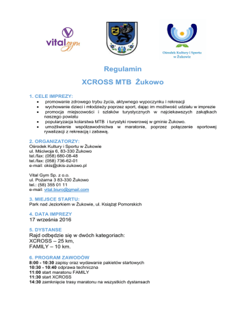Regulamin XCROSS MTB Żukowo 1. CELE IMPREZY: promowanie zdrowego trybu życia, aktywnego wypoczynku i rekreacji wychowanie dzieci i młodzieży poprzez sport, dając im możliwość udziału w imprezie promocja miejscowości i szlaków turystycznych w najciekawszych zakątkach naszego powiatu popularyzacja kolarstwa MTB i turystyki rowerowej w gminie Żukowo. umożliwienie współzawodnictwa w maratonie, poprzez połączenie sportowej rywalizacji z rekreacją i zabawą. 2. ORGANIZATORZY: Ośrodek Kultury i Sportu w Żukowie ul. Mściwoja 6, 83-330 Żukowo tel./fax: (058) 680-08-48 tel./fax: (058) 736-62-01 e-mail: [email protected] Vital Gym Sp. z o.o. ul. Pożarna 3 83-330 Żukowo tel.: (58) 355 01 11 e-mail: [email protected] 3. MIEJSCE STARTU: Park nad Jeziorkiem w Żukowie, ul. Książąt Pomorskich 4. DATA IMPREZY 17 września 2016 5. DYSTANSE Rajd odbędzie się w dwóch kategoriach: XCROSS – 25 km, FAMILY – 10 km. 6. PROGRAM ZAWODÓW 8:00 - 10:30 zapisy oraz wydawanie pakietów startowych 10:30 - 10:40 odprawa techniczna 11:00 start maratonu FAMILY 11:30 start XCROSS 14:30 zamknięcie trasy maratonu na wszystkich dystansach Dekoracje sportowców: 14:30 - dekoracja w kategorii FAMILY, 15:00 - dekoracja w kategorii XCROSS, 16:00 – losowanie nagród 7. KATEGORIE Family: OPEN: kat. dziewcząt kat. chłopców Xcross: kobiety – 16 - 29 lat, kobiety – 30 – 39 lat, kobiety – 40 – 49 lat, kobiety – powyżej 49 lat, mężczyźni – 16- 29 lat, mężczyźni – 30 – 39 lat, mężczyźni – 40 – 49 lat, mężczyźni – powyżej 49 lat, 8. NAGRODY Każdy kto przekroczy linie mety otrzyma pamiątkowe odlewane medale. Za zajęcie trzech pierwszych miejsc w każdej kategorii zawodnicy otrzymają puchary. Prowadzona będzie również klasyfikacja OPEN w kategoriach kobiet i mężczyzn na trasie XCROSS, w której przewidziane są bony na sprzęt sportowy. Po zakończeniu dekoracji odbędzie się losowanie nagród, m.in. sprzęt RTV, wśród wszystkich uczestników, którzy wzięli udział w maratonie. 9. ZAPISY I OPŁATY - Xcross MTB 2016 to impreza sportowo-rekreacyjna rozgrywana na dowolnym typie rowerów. - Uczestnikiem może być osoba, która spełni poniższe warunki: a) ukończyły 18 lat, b) jest w przedziale wieku od 16-18 lat, ale tylko z pisemną zgodą rodzica lub opiekuna prawnego(patrz załączniki), jeśli chodzi o start w trasie XCROSS oraz FAMILY, c) ma poniżej 16 lat wraz z pisemną zgodą rodzica lub opiekuna prawnego (patrz załączniki), start wyłącznie w kat. FAMILY. - Opłaty: 30 zł – XCROSS, dla osób powyżej 18 wieku, 20 zł – XCROSS, dla osób od 16-18 wieku. 10 zł – Family, dla osób poniżej 18 wieku, 20 zł – Family, dla dwóch rodziców z dzieckiem, 15 zł – Family, dla jednego rodzica z dzieckiem. - W dniu zawodów ( 17 września 2016 ) wszystkie ceny wzrastają o kwotę 5 zł, - zapisy odbywają się za pośrednictwem serwisu www.elektronicznezapisy.pl, - opłata pobierana jest za pośrednictwem przelewu, formularz wpłaty wyświetla się po dokonaniu zapisów on-line, - każdy uczestnik w dniu imprezy musi posiadać dowód wpłaty, - istnieje możliwość zapisu i dokonaniu opłaty w biurze zawodów w dniu imprezy, - uiszczona opłata nie podlega zwrotowi. 10. PRZEPROWADZENIE ZAWODÓW - Podczas Xcross MTB będzie funkcjonował elektroniczny system identyfikacji i pomiaru czasu na dystansie Family i Xcross. - Każdy zawodnik startujący na dystansie Family i Xcross zobowiązany jest do posiadania przymocowania do kierownicy sztywnego numeru startowego, który otrzyma wraz z pakietem startowym. - Rajd zostanie przeprowadzony zgodnie z mapą zamieszczoną na profilu społecznościowym Xcross MTB, stronach internetowych organizatorów www.okis-zukowo.pl, www.vitalgym.pl i w biurze zawodów w dniu imprezy. - Na trasie będą zlokalizowane punkty kontrolne. Ominięcie punktu kontrolnego będzie karane dyskwalifikacją. - Zawodnik, który nie dojedzie do mety maratonu do godziny 14:30 nie zostanie sklasyfikowany. - Wszelkie zmiany trasy przez zawodników będą traktowane jako skrót trasy i zawodnik zostanie zdyskwalifikowany. - W czasie trwania maratonu zawodnik jadący wolniej powinien ustąpić miejsca zawodnikowi osiągającemu większą prędkość, zjeżdżając na prawą stronę trasy. - Uczestnicy powinni zachować szczególną ostrożność, w momencie gdy trasa jest trudna technicznie lub gdy zbliżają się do skrzyżowania. - Zawodnicy muszą przestrzegać przepisów ruchu drogowego. - Każda naprawa roweru powinna być przeprowadzona w bezpiecznym miejscu, umożliwiając swobodny przejazd pozostałym zawodnikom. - Podczas sprintu finiszowego zawodnik musi utrzymywać się na swoim torze jazdy. - Zawodnicy muszą zachować szczególną ostrożność mając na uwadze możliwość wyjechania innych pojazdów. - Komisja sędziowska w porozumieniu z Organizatorem może zastosować następujące kary: upomnienie uczestnika, doliczenie czasu karnego, dyskwalifikacja uczestnika. - Uczestnicy nie mogą zanieczyszczać terenu i pozostawiać śmieci na trasie wyścigu. Zabrania się używania szklanych pojemników w pobliżu i na trasie wyścigu. W przypadku naruszania tego przepisu, uczestnicy edycji będą ukarani dyskwalifikacją. - Każdy uczestnik jest zobowiązany do jazdy na rowerze w kasku. Nieposiadanie kasku w czasie jazdy będzie karane dyskwalifikacją. 11. POSTANOWIENIA KOŃCOWE - uczestnicy poprzez zgłoszenie do imprezy wyrażają zgodę na przetwarzanie danych osobowych oraz wykorzystanie wizerunku w materiałach promocyjnych organizatora zgodnie z ustawą z dnia 29.08.1997 r. o Ochronie Danych Osobowych, tekst jednolity: Dz. U. z 2002 r., Nr 101, poz. 926 z późniejszymi zmianami. - Każdy uczestnik bierze udział w zawodach na własną odpowiedzialność (w przypadku uczestników niepełnoletnich na wyłączną odpowiedzialność rodziców lub opiekunów). - Organizator nie ponosi odpowiedzialności za szkody 
