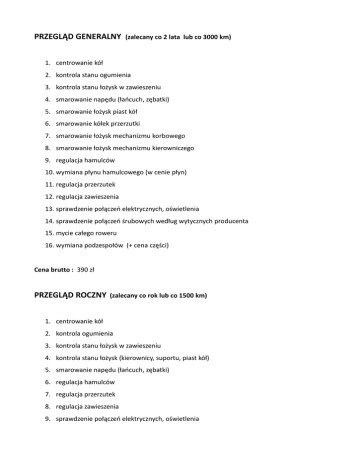 PRZEGLĄD GENERALNY (zalecany co 2 lata lub co 3000 km) 1. centrowanie kół 2. kontrola stanu ogumienia 3. kontrola stanu łożysk w zawieszeniu 4. smarowanie napędu (łańcuch, zębatki) 5. smarowanie łożysk piast kół 6. smarowanie kółek przerzutki 7. smarowanie łożysk mechanizmu korbowego 8. smarowanie łożysk mechanizmu kierowniczego 9. regulacja hamulców 10. wymiana płynu hamulcowego (w cenie płyn) 11. regulacja przerzutek 12. regulacja zawieszenia 13. sprawdzenie połączeń elektrycznych, oświetlenia 14. sprawdzenie połączeń śrubowych według wytycznych producenta 15. mycie całego roweru 16. wymiana podzespołów (+ cena części) Cena brutto : 390 zł PRZEGLĄD ROCZNY (zalecany co rok lub co 1500 km) 1. centrowanie kół 2. kontrola ogumienia 3. kontrola stanu łożysk w zawieszeniu 4. kontrola stanu łożysk (kierownicy, suportu, piast kół) 5. smarowanie napędu (łańcuch, zębatki) 6. regulacja hamulców 7. regulacja przerzutek 8. regulacja zawieszenia 9. sprawdzenie połączeń elektrycznych, oświetlenia 10. sprawdzenie połączeń śrubowych według wytycznych producenta 11. wymiana podzespołów (+ cena części ) 12. mycie całego roweru Cena brutto : 200 zł (wariant bez mycia całego roweru: 150 zł) PRZEGLAD GWARANCYJNY (do 3 miesięcy od daty zakupu lub do 300 km) 1. centrowanie kół 2. kontrola ciśnienia w ogumieniu 3. smarowanie napędu (łańcuch, zębatki) 4. regulacja hamulców 5. regulacja przerzutek 6. regulacja zawieszenia 7. sprawdzenie połączeń elektrycznych, oświetlenia 8. sprawdzenie połączeń śrubowych według wytycznych producenta 9. wpis do książki gwarancyjnej Rower zakupiony w sklepach Wysepka Cena brutto : 50 zł Rower zakupiony w innym sklepie Cena brutto: 150 zł