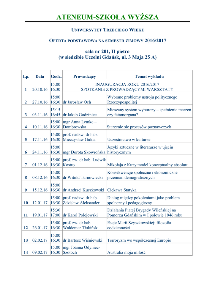 Oferta wykładów - Ateneum Szkoła Wyższa