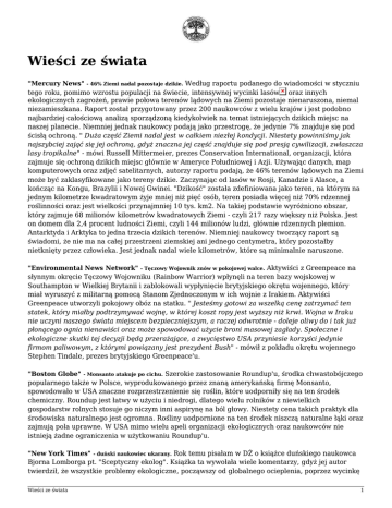 Wieści ze świata "Mercury News" - 46% Ziemi nadal pozostaje dzikie. Według raportu podanego do wiadomości w styczniu tego roku, pomimo wzrostu populacji na świecie, intensywnej wycinki lasów oraz innych ekologicznych zagrożeń, prawie połowa terenów lądowych na Ziemi pozostaje nienaruszona, niemal niezamieszkana. Raport został przygotowany przez 200 naukowców z wielu krajów i jest podobno najbardziej całościową analizą sporządzoną kiedykolwiek na temat istniejących dzikich miejsc na naszej planecie. Niemniej jednak naukowcy podają jako przestrogę, że jedynie 7% znajduje się pod ścisłą ochroną. " Duża część Ziemi nadal jest w całkiem niezłej kondycji. Niestety powinniśmy jak najszybciej zająć się jej ochroną, gdyż znaczna jej część znajduje się pod presją cywilizacji, zwłaszcza lasy tropikalne" - mówi Russell Mittermeier, prezes Conservation International, organizacji, która zajmuje się ochroną dzikich miejsc głównie w Ameryce Południowej i Azji. Używając danych, map komputerowych oraz zdjęć satelitarnych, autorzy raportu podają, że 46% terenów lądowych na Ziemi może być zaklasyfikowane jako tereny dzikie. Zaczynając od lasów w Rosji, Kanadzie i Alasce, a kończąc na Kongu, Brazylii i Nowej Gwinei. "Dzikość" została zdefiniowana jako teren, na którym na jednym kilometrze kwadratowym żyje mniej niż pięć osób, teren posiada więcej niż 70% rdzennej roślinności oraz jest wielkości przynajmniej 10 tys. km2. Na takiej podstawie wyróżniono obszar, który zajmuje 68 milionów kilometrów kwadratowych Ziemi - czyli 217 razy większy niż Polska. Jest on domem dla 2,4 procent ludności Ziemi, czyli 144 milionów ludzi, głównie rdzennych plemion. Antarktyda i Arktyka to jedna trzecia dzikich terenów. Niemniej naukowcy tworzący raport są świadomi, że nie ma na całej przestrzeni ziemskiej ani jednego centymetra, który pozostałby nietknięty przez człowieka. Jest jednak nadal wiele kilometrów, które są minimalnie naruszone. "Environmental News Network" - Tęczowy Wojownik znów w pokojowej walce. Aktywiści z Greenpeace na słynnym okręcie Tęczowy Wojowniku (Rainbow Warrior) wpłynęli na teren bazy wojskowej w Southampton w Wielkiej Brytanii i zablokowali wypłynięcie brytyjskiego okrętu wojennego, który miał wyruszyć z militarną pomocą Stanom Zjednoczonym w ich wojnie z Irakiem. Aktywiści Greenpeace utworzyli pokojowy obóz na statku. " Jesteśmy gotowi za wszelką cenę zatrzymać ten statek, który miałby podtrzymywać wojnę, w której koszt ropy jest wyższy niż krwi. Wojna w Iraku nie uczyni naszego świata miejscem bezpieczniejszym, a raczej odwrotnie - doleje oliwy do i tak już płonącego ognia nienawiści oraz może spowodować użycie broni masowej zagłady. Społeczne i ekologiczne skutki tej decyzji będą przerażające, a zwycięstwo USA przyniesie korzyści jedynie firmom paliwowym, z którymi powiązany jest prezydent Bush" - mówił z pokładu okrętu wojennego Stephen Tindale, prezes brytyjskiego Greenpeace'u. "Boston Globe" - Monsanto atakuje po cichu. Szerokie zastosowanie Roundup'u, środka chwastobójczego popularnego także w Polsce, wyprodukowanego przez znaną amerykańską firmę Monsanto, spowodowało w USA znaczne rozprzestrzenienie się roślin, które uodporniły się na ten środek chemiczny. Roundup jest łatwy w użyciu i niedrogi, dlatego wielu rolników z niewielkich gospodarstw rolnych stosuje go niczym inni aspirynę na ból głowy. Niestety cena takich praktyk dla środowiska naturalnego jest ogromna. Rośliny uodpornione na ten środek niszczą naturalne łąki oraz zajmują pola uprawne. W USA mimo wielu apeli organizacji ekologicznych oraz naukowców nie istnieją żadne ograniczenia w użytkowaniu Roundup'u. "New York Times" - duński naukowiec ukarany. Rok temu pisałam w DŻ o książce duńskiego naukowca Bjorna Lomborga pt. "Sceptyczny ekolog". Książka ta wywołała wiele komentarzy, gdyż jej autor twierdził, że wszystkie problemy ekologiczne, począwszy od globalnego ocieplenia, poprzez wycinkę Wieści ze świata 1 lasów, wymieranie gatunków, a na zatruwaniu rzek i oceanów kończąc, są jedynie wymysłem ekologicznych aktywistów. Po licznych krytycznych komentarzach naukowców i specjalistów wobec tez Lomborga, Duńska Agencja Naukowa potępiła go za "naukową nieuczciwość", argumentując, że jego publikacja "jasno zaprzecza standardom rzetelnej naukowej praktyki", czyli, mówiąc krótko, jest jednostronna. Duński Komitet do spraw Naukowej Nierzetelności (Danish Committee on Scietific Dishonesty), przeprowadził sześciomiesięczne badania, po tym, jak kilku naukowców złożyło oficjalne skargi do komisji. Lomborg zaprzecza tym zarzutom i nadal pozostaje na stanowisku dyrektora Duńskiego Instytutu ds. Badań nad Środowiskiem Naturalnym. "Sydney News" - misie koala szukają wody Po jedenastu miesiącach suszy w Australii, znane i powszechnie lubiane misie koala porzucają swoje młode i udają się w poszukiwaniu wody w stronę terenów zamieszkanych przez ludzi. Zdarzają się coraz częściej przypadki, że odwodnione koala opuszczają wysuszone drzewa eukaliptusowe i wprowadzają się do miast, pijąc wodę z ulicznych hydrantów i fontann. Australia jest jednym z najsuchszych kontynentów, a w tym roku doświadcza najdłuższego okresu suszy, jaki się zdarzył w przeciągu ostatniego stulecia. Australijczycy mieszkający na przedmieściach wystawiają miski z wodą dla spragnionych misiów. Wszyscy czekają na upragniony deszcz. "San Jose Mercury News" - ryby potrzebują wody Administracja Georga Busha jest obwiniana o spowodowanie śmierci 33 tys. łososi, żyjących w rzece Klamath w północnej Kalifornii (zach. USA). Ten największy kiedykolwiek notowany spadek populacji ryby miał miejsce na skutek decyzji administracji obecnego prezydenta USA. Decyzją tą zmieniono kierunek rzeki, by jej wody skierować na tereny 