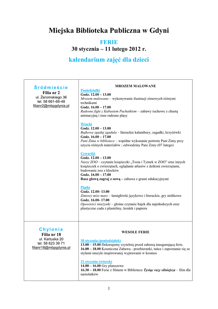 Miejska Biblioteka Publiczna w Gdyni FERIE 30 stycznia – 11 lutego