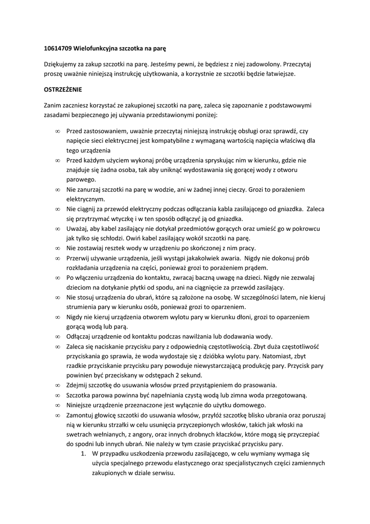 10614709 Wielofunkcyjna szczotka na parę Dziękujemy za zakup szczotki na parę. Jesteśmy pewni, że będziesz z niej zadowolony. Przeczytaj proszę uważnie niniejszą instrukcję użytkowania, a korzystnie ze szczotki będzie łatwiejsze. OSTRZEŻENIE Zanim zaczniesz korzystać ze zakupionej szczotki na parę, zaleca się zapoznanie z podstawowymi zasadami bezpiecznego jej używania przedstawionymi poniżej: • • • • • • • • • • • • • • • • Przed zastosowaniem, uważnie przeczytaj niniejszą instrukcję obsługi oraz sprawdź, czy napięcie sieci elektrycznej jest kompatybilne z wymaganą wartością napięcia właściwą dla tego urządzenia Przed każdym użyciem wykonaj próbę urządzenia spryskując nim w kierunku, gdzie nie znajduje się żadna osoba, tak aby uniknąć wydostawania się gorącej wody z otworu parowego. Nie zanurzaj szczotki na parę w wodzie, ani w żadnej innej cieczy. Grozi to porażeniem elektrycznym. Nie ciągnij za przewód elektryczny podczas odłączania kabla zasilającego od gniazdka. Zaleca się przytrzymać wtyczkę i w ten sposób odłączyć ją od gniazdka. Uważaj, aby kabel zasilający nie dotykał przedmiotów gorących oraz umieść go w pokrowcu jak tylko się schłodzi. Owiń kabel zasilający wokół szczotki na parę. Nie zostawiaj resztek wody w urządzeniu po skończonej z nim pracy. Przerwij używanie urządzenia, jeśli wystąpi jakakolwiek awaria. Nigdy nie dokonuj prób rozkładania urządzenia na części, ponieważ grozi to porażeniem prądem. Po włączeniu urządzenia do kontaktu, zwracaj baczną uwagę na dzieci. Nigdy nie zezwalaj dzieciom na dotykanie płytki od spodu, ani na ciągnięcie za przewód zasilający. Nie stosuj urządzenia do ubrań, które są założone na osobę. W szczególności latem, nie kieruj strumienia pary w kierunku osób, ponieważ grozi to oparzeniem. Nigdy nie kieruj urządzenia otworem wylotu pary w kierunku dłoni, grozi to oparzeniem gorącą wodą lub parą. Odłączaj urządzenie od kontaktu podczas nawilżania lub dodawania wody. Zaleca się naciskanie przycisku pary z odpowiednią częstotliwością. Zbyt duża częstotliwość przyciskania go sprawia, że woda wydostaje się z dzióbka wylotu pary. Natomiast, zbyt rzadkie przyciskanie przycisku pary powoduje niewystarczającą produkcję pary. Przycisk pary powinien być przeciskany w odstępach 2 sekund. Zdejmij szczotkę do usuwania włosów przed przystąpieniem do prasowania. Szczotka parowa powinna być napełniania czystą wodą lub zimna woda przegotowaną. Niniejsze urządzenie przeznaczone jest wyłącznie do użytku domowego. Zamontuj głowicę szczotki do usuwania włosów, przyłóż szczotkę blisko ubrania oraz poruszaj nią w kierunku strzałki w celu usunięcia przyczepionych włosków, takich jak włoski na swetrach wełnianych, z angory, oraz innych drobnych kłaczków, które mogą się przyczepiać do spodni lub innych ubrań. Nie należy w tym czasie przyciskać przycisku pary. 1. W przypadku uszkodzenia przewodu zasilającego, w celu wymiany wymaga się użycia specjalnego przewodu elastycznego oraz specjalistycznych części zamiennych zakupionych w dziale serwisu. • 2. W momencie włączenia urządzenia do prądu, wymaga jest stały nad nim nadzór. Zamontuj specjalny uchwyt do skutecznego prasowania kołnierzy garniturów, kantów spodni, oraz krawatów. CZYSZCZENIE ORAZ KONSERWACJA 1. Przypadki wystąpienia blokady wyrzutu pary, bądź też zatrzymania funkcji pary odkrytych podczas użytkowania mogą być wywołane nieczystą wodą. Nie wyłączaj od razu wtyczki od gniazdka, ale pozwól urządzeniu ochłodzić się, a następnie, kiedy już jest chłodne, włóż szpilkę w otwór wyrzutu pary w celu oczyszczenia go przed następnym użyciem. 2. Po prasowaniu, wytrzyj powłokę urządzenia ręcznikiem. Nie zanurzaj urządzenia w wodzie. PARAMETRY TECHNICZNE Model produktu: FM-2018 Napięcie znamionowe: 220V ~ Moc znamionowa: 1000W Częstotliwość znamionowa: 50Hz – 60Hz Typ ochrony przed porażeniem prądem elektrycznym: I NAZWA KAŻDEJ CZĘŚCI 1. Przycisk pary 2. Przycisk zwalniający zbiornik na wodę 3. Zbiornik na wodę 4. Haczyk do zawieszania 5. Okienko sprawdzania poziomu wody 6. Przewód zasilający 7. Głowica szczotki do usuwania włosów 8. Szczotka wełniana 9. Otwór wyrzutu pary 10. Uchwyt do prasowania spodni WSTĘP Zakupiony przez Państwa produkt jest wysoce skutecznym oraz przyjaznym środowisku urządzeniem do czyszczenia i prasowania przeznaczonym do użytku domowego. Połączenie wysokiej temperatury oraz pary o wysokim ciśnieniu ułatwiają prasowanie, sterylizację, czyszczenie itp. Urządzenie jest szczególnie przydatne w rodzinie, pobytach wakacyjnych w hotelach, oraz podczas wycieczek. PRZYDATNE FUNKCJE Uzyskanie wysokiej temperatury oraz pary o wysokim ciśnieniu jest możliwe w ciągu 2 minut od włączenia urządzenia do zasilania. Niniejsze urządzenie zostało zaprojektowane do czyszczenia w warunkach domowych oraz do prasowania ubrań. Prasowanie: Połączenie wysokiej temperatury oraz wyrzutu pary o wysokim ciśnieniu umożliwia łatwe prasowanie ubrań, zasłon, powłoczek na poduszki, itp. Urządzenie jest szczególnie przydatne do prasowania ubrań wymagających położenia w pionie (takich jak garnitury i tym podobnych). Do urządzenia dołączona jest wełniana szczotka, która pomoże zdezynfekować oraz odkazić ubrania, jak również usunąć z nich nieprzyjemny zapach. Dezynfekcja oraz sterylizacja: Potężny wyrzut pary o wysokiej temperaturze natychmiastowo zabija wszelkie zarazki, zapewniając tym samym czystość i higienę. Czyszczenie: Potężny wyrzut pary o wysokiej temperaturze łatwo rozpuszcza oraz usuwa wszelkie plamy, zabrudzenia oraz zacieki powstałe z wilgoci, znajdujące się zarówno na powierzchni, jak i w szczelinach ubrań. Co więcej, dołączona głowica wełnianej szczotki oraz szczotki do czyszczenia okien na