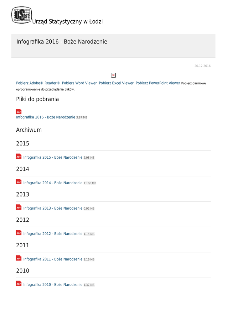 Urząd Statystyczny w Łodzi Infografika 2016 - Boże Narodzenie 20.12.2016 Pobierz Adobe® Reader® Pobierz Word Viewer Pobierz Excel Viewer Pobierz PowerPoint Viewer Pobierz darmowe oprogramowanie do przeglądania plików: Pliki do pobrania Infografika 2016 - Boże Narodzenie 3.87 MB Archiwum 2015 Infografika 2015 - Boże Narodzenie 2.98 MB 2014 Infografika 2014 - Boże Narodzenie 11.68 MB 2013 Infografika 2013 - Boże Narodzenie 0.92 MB 2012 Infografika 2012 - Boże Narodzenie 1.15 MB 2011 Infografika 2011 - Boże Narodzenie 1.16 MB 2010 Infografika 2010 - Boże Narodzenie 1.37 MB
