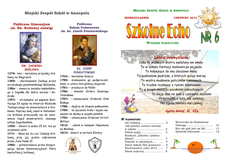 Miejski Zespół Szkół w Annopolu MIEJSKI ZESPÓŁ SZKÓŁ NIEREGULARNIK Publiczne Gimnazjum im. Św. Królowej Jadwigi W ANNOPOLU CZERWIEC 2012 Publiczna Szkoła Podstawowa im. ks. Józefa Poniatowskiego WYDANIE WAKACYJNE Letnie rozmyślanie ŚW. JADWIGA KRÓLOWA 1374r. luty – narodziny przyszłej królowej na Węgrzech 1384r. – ukoronowanie Jadwigi przez arcybiskupa gnieźnieńskiego Bodzankę 1386r. – zawarcie związku małżeńskiego z Jagiełłą dla dobra narodu i Kościoła 1397r. - otrzymanie od papieża Bonifacego IX zgody na otwarcie Wydziału Teologicznego na uniwersytecie w Krakowie. Poprzez swój zapis w testamencie królowa przyczyniła się do odnowienia tegoż uniwersytetu, zwanego odtąd Jagiellońskim. 1399r. – śmierć w wieku 25 lat, tuż po urodzeniu córki 1979r. - Msza św. ku czci Jadwigi Królowej przy jej grobie odprawiona przez Jana Pawła II 1986r. - potwierdzenie przez Kongregację Spraw Kanonizacyjnych faktu beatyfikacji królowej KS. JÓZEF PONIATOWSKI 1763r. – narodziny Księcia 1780r. –mianowanie go podporucznikiem, a cztery lata później majorem. 1781r. – przybycie do Polski 1786r. - kawaler Orderu Świętego Stanisława 1787r. – odznaczenie Orderem Orła Białego 1788r. – dojście do stopnia pułkownika 1789r. - na życzenie króla i sejmu wezwanie do służby w wojsku polskim 1792r. - odznaczenie Orderem Virtuti Militari 1812r. - udział w kampani Napoleona na Moskwę. 1813r.- śmierć w nurtach Elstery Lato to podmuch wiatru wplątany we włosy To w obłoku fantazji malownicze pejzaże To kołyszące do snu zbożowe kłosy To podniebne podróże, o których wciąż marzę To wiatru muskanie policzków rumianych To trudne rozmowy z rybimi niemowami To w kropli deszczu pocałunki zakochanych To moje sam na sam z czarnymi myślami Przychodź, o lato, nie zwlekaj Na zgodę Natury nie czekaj Agata Gniaź, kl. VIa W numerze: Od redakcji …………….....…... Jak przeżyć ostatni miesiąc w szkole ……………………….. Połam język ………………….. Konkurs „Zdrowa i piękna Mama” …………………………. Powieść w odcinkach … … Dzień Szkoły Bez przemocy .. Wychowawca roku 2012 …... Nasze sukcesy ……………….. 2 2 3 3 4 6 7 8 Wycieczka do Kazimierza Dolnego ……………………….. 10 Kto nie pali jest na fali …….. 11 Sylwetki Patronów ………….. 12 OD REDAKCJI Wakacje tuż, tuż… Piękna pogoda nieustannie nam o nich przypomina i trudniej jest koncentrować się na nauce. Coraz bardziej gorące dni sprawiły, że źle nam się pracuje. Dla większości lipiec i sierpień będą czasem odpoczynku, zabaw i zapomnienia o szkolnych obowiązkach. Na szczęście za nami już sprawdziany, kartkówki i odpowiedzi przy tablicy. Korzystając z okazji składamy Wam najserdeczniejsze życzenia z okazji minionego Dnia Dziecka, życzymy samych pozytywnych ocen na świadectwie i udanych letnich wojaży. Zachęcamy do spędzania dużej ilości czasu na świeżym powietrzu. Telewizory, komputery, konsole poczekają… Warto też sięgnąć po „Szkolne Echo”. Miłej lektury! Redaktorek: Michał Ścibura, kl. Va Czerwiec Nazwa tego miesiąca wiąże się z maleńkim owadem—czerwcem polskim. Kiedyś właśnie w czerwcu zbierano jego poczwarki, suszono je na słońcu i wyrabiano z nich czerwony barwnik purpurę - do farbowania płótna. Nazwa może wywodzić się też stąd, że wylegają się wtedy czerwie - larwy pszczele, czyli potomstwo pszczół. W czerwcu się pokaże, co nam Bóg da w darze. JAK PRZEŻYĆ OSTATNI MIESIĄC W SZKOLE - ZALECENIA: Godz. 645 - wstajemy z uśmiechem na ustach (koniecznie prawą nogą!). Myjąc zęby nucimy wesołą melodię (uwaga na pianę!); Godz. 730 - w czasie drogi do szkoły i po wejściu do niej uśmiechamy się do wszystkich (nawet do nauczycieli!); Godz. 800 - 1400 - w czasie pobytu w szkole staramy się nie rzucać w oczy nauczycielom (co będzie trudne - ale ćwiczenie czyni mistrza). Może nawet spróbować świecić, jak ten księżyc, całkiem przyzwoitym przykładem; W czasie godzin popołudniowych, spędzanych z rodziną, nadużywamy wręcz słów "proszę - dziękuję przepraszam" i stwarzamy wrażenie, że się w pocie czoła uczymy (wskazane szczególnie dla osób, których średnia ocen na świadectwie nie jest zbyt wysoka); Wieczorem skreślamy miniony dzień w kalendarzu, a kładąc się do łóżka wspominamy najpiękniejsze chwile ubiegłego lata (ale niech wspomnienia nie spędzają nam snu z powiek!); Zasypiamy z myślą: czucia estetyki i piękna. W Kamienicy Celejowskiej należącej do najcenniejszych budowli zabytkowych w Polsce, poza ekspozycją malarstwa i fotografii z plenerów kazimierskich obejrzeliśmy makietę miasta według jego stanu z około 1910 roku. Ważnym dopełnieniem turystycznego przedpołudnia był spacer po Rynku Kazimierza i zakup pamiątek, które wydają się być jedynym towarem, który można tu nabyć. Czas na zjedzenie gofrów i lodów sprawił, że jeszcze bardziej wzrosło poczucie zadowolenia w grupie. O godzinie 13.00 uczestnicy i organizatorzy „Wielkiego Kazimierskiego Rysowania” spotkali się na Rynku, by podsumować akcję i wykonać „rodzinną” fotografię. Swoją obecnością zaszczycił nas także Burmistrz Pan Grzegorz Dunia. Nadmienić należy, iż Urząd Miasta w Kazimierzu Dolnym zadbał o drobne upominki dla dzieci i młodzieży oraz bezpłatne wejścia do Oddziałów Muzeum Nadwiślańskiego. Każdy uczestnik otrzymał także imienny dyplom potwierdzający udział w akcji rysowania. Mimo iż od pogody w takich działaniach wiele zależy, to tym razem niesprzyjająca aura nie miała decydującego znaczenia. Wróciliśmy zadowoleni i … tylko trochę zmoknięci. Jolanta Mochol „Kto nie pali jest na fali” pod takim hasłem uczniowie z nauczycielami Miejskiego Zespołu Szkół w Annopolu wyszli na ulicę w ramach kampanii „Rzuć palenie razem z nami”. Problem palenia ni