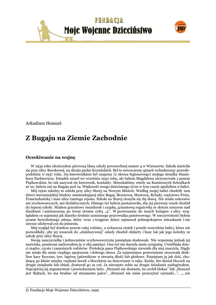 Arkadiusz Henszel Z Bugaju na Ziemie Zachodnie Oczekiwanie na wojnę W 1939 roku ukończyłem pierwszą klasę szkoły powszechnej numer 4 w Warszawie. Szkoła mieściła się przy ulicy Barokowej, na skraju parku Krasińskich. Był to nowoczesny gmach wybudowany prawdopodobnie w 1937 roku. Jej kierownikiem był znajomy (z okresu legionowego) mojego dziadka Stanisława Narkiewicza. Dziadek umarł we wrześniu 1932 roku, ale babcia Magdalena utrzymywała z panem Piątkowskim, bo tak nazywał się kierownik, kontakty. Mieszkaliśmy wtedy na Kamiennych Schodkach nr 10, babcia zaś na Bugaju pod 19. Większość swego dziecinnego życia w tym czasie spędziłem u babci. Mój rejon szkolny to szkoła przy ulicy Starej na Nowym Mieście. Według mojej babci chodziły tam dzieci staromiejskiej biedoty zamieszkującej ulice Bugaj, Brzozową, Mostową, Rybaki, częściowo Freta, Franciszkańską i inne ulice tamtego rejonu. Szkoła na Starej cieszyła się złą sławą. Nie miała sukcesów ani wychowawczych, ani dydaktycznych. Dlatego też babcia postanowiła, aby jej pierwszy wnuk chodził do lepszej szkoły. Miałem granatowy mundurek i czapkę, granatową rogatywkę ze złotym sznurem nad daszkiem i umieszczoną po lewej stronie cyfrą „4”. W porównaniu do moich kolegów z ulicy wyglądałem co najmniej jak dziecko średnio zamożnego pracownika państwowego. W rzeczywistości byłem synem bezrobotnego zduna, który wraz z trojgiem dzieci zajmował jednopokojowe mieszkanie i nie zawsze zdobywał coś do jedzenia. Mój wygląd był dziełem prawie całej rodziny, a zwłaszcza ciotek i przede wszystkim babci, która nie pozwoliłaby, aby jej wnuczek do „ekskluzywnej” szkoły chodził obdarty i bosy tak jak jego koledzy ze szkoły przy ulicy Starej. Swoją nauczycielkę i jednocześnie wychowawczynię pamiętam doskonale. Nie wspomnę jednak jej nazwiska, ponieważ zachowałem ją w złej pamięci. Ona też nie darzyła mnie sympatią. Uwielbiała dzieci mądre, czyste i zamożnych rodziców. Protekcja pana Piątkowskiego niewiele dla niej znaczyła. Nigdy nie miała dla mnie ciepłego spojrzenia i dobrego słowa. Za najmniejsze przewinienie stosowała dotkliwe kary fizyczne, tzw. łapówę (piórnikiem w otwartą dłoń) lub głodowe. Pamiętam ją jak dziś, chodzącą po klasie między rzędami ławek z bloczkiem na dożywianie w ręku. Każdy, kto dostał bloczek na drugie śniadanie lub obiad, dostawał go za coś. Ja nieczęsto sobie na drugie śniadanie zasługiwałem. Najczęściej jej argumentem i powiedzeniem było: „Henszel nie dostanie, bo zrobił kleksa” lub „Henszel jest flejtuch, bo ma brudne od atramentu palce”, „Henszel nie umie przeczytać czytanki...”, „...nie © Fundacja Moje Wojenne Dzieciństwo, 1999 Arkadiusz Henszel, Z Bugaju na Ziemie Zachodnie 2 nauczył się wiersza...”, „...wylał atrament”, „...nie ma zeszytu”. Takich jak ja było w klasie jeszcze dwóch lub trzech. Dziś przypuszczam, że jej stosunek uczuciowy do mnie jako ucznia negatywnie wpłynął na moją postawę wobec szkoły i nauki, zwłaszcza w pierwszych latach edukacji. O możliwości wybuchu wojny mówiło się u nas w domu. Wujkowie i rodzice w czasie wspólnych wieczorów opowiadali o wojnie (I wojnie światowej). Siedziałem na kufrze obok drzwi i słuchałem. Mówili o bombardowaniach artyleryjskich, o użyciu gazów trujących, o walkach na bagnety. Syn sąsiadki, Władek Sulak, który na jesieni 1938 roku powrócił z wojska, demonstrował różne ćwiczenia z szermierki karabinowej. Z opowieści wiało grozą i okrucieństwem. Wspominano, kto z wojny powrócił okaleczony, a kto cały. Wspominano euforię rozbrajania Niemców w 1918 roku i postawę ludzi wobec zagrożenia Warszawy w wojnie polsko-rosyjskiej w 1920 roku. Przeklinano Piłsudskiego za przewrót majowy. Okazało się, że wśród ofiar byli liczni znajomi mojej rodziny, a zwłaszcza wujka Stefana Zuchowicza – męża ciotki Janki – rodzonej siostry mojej matki. W szkole zaczęto uczyć nas samoobrony. Wyjaśniono nam, co to jest gaz, jak go rozpoznać i jak się przed nim bronić. Na jednej z lekcji robiliśmy tak zwane tampony czyli maseczki przeciwgazowe. Tampon był zrobiony z waty i gazy. Miał cztery troki do zawiązywania wokół głowy. Nosiło się go w pudełku. Ja wykorzystałem do tego celu metalowe pudełko po papierosach „mewa”. Były to okrągłe pojemniki mieszczące 100 sztuk pachnących papierosów. Przymocowałem do niego tasiemkę tak, aby można go było nosić przez ramię. Pamiętam, że za ten twór zostałem nagrodzony przez „panią” talonem na drugie śniadanie. Gdy każdy miał już swój tampon, to wprawialiśmy się w szybkim zakładaniu go na nos tak, by zasłaniał usta i nos. Po kilku takich treningach byliśmy przekonani, że żaden niemiecki gaz nic nam nie zrobi. Zawsze w poniedziałek cała szkoła zbierała się w sali gimnastycznej. Siedzieliśmy klasami na parkiecie (po turecku) i słuchaliśmy przemówień. Kilka poniedziałków poświęconych było nauce rozpoznawania sygnałów alarmowych. Pamiętam, że na jednym z ostatnich przed wakacjami spotkań pan Piątkowski mówił o dywersantach. Wyrobiło się we mnie przekonanie, że dywersanci kryją się za każdym drewnianym parkanem. Dlatego nie należy budować parkanów zwartych, tylko ze sztachet, tak aby było widać, kto za płotem siedzi. Do szkoły chodziłem z Bugaja 19 ulicami Mostową i Długą, przecinając po drodze Freta i Miodową. Na „baniach”, tak nazywano okrągłe słupy do rozwieszania plakatów, pojawiały się co jakiś czas różne plakaty. Oglądałem te, na których były jakieś rysunki... Pamiętam plakat z wizerunkiem marszałka Rydza-Śmigłego i napis „Silni – zwarci – gotowi”. Były też plakaty, zachęcające do dawania pieniędzy na zakup broni dla wojska. W szkole były organizowane zbiórki pieniędzy na ten cel. Pamiętam, że po takiej zbiórce też do
