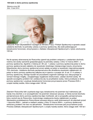 100-latek w domu pomocy społecznej Wpisany przez BS Sob, 13 paź 2012 Rzecznik Praw Obywatelskich wystąpił do Ministra Pracy i Polityki Społecznej w sprawie zasad ustalania dochodu na potrzeby ustawy o pomocy społecznej, dla osób pobierających świadczenie honorowe, otrzymywane z Zakładu Ubezpieczeń Społecznych z tytułu ukończenia 100 lat. Na tle sprawy skierowanej do Rzecznika ujawnił się problem związany z ustalaniem dochodu rodziny lub osoby samotnie gospodarującej na potrzeby ustawy z dnia 12 marca 2004 r. o pomocy społecznej. Zgodnie z treścią art. 60 ust. 1 ustawy o pomocy społecznej pobyt w domu pomocy społecznej jest odpłatny do wysokości średniego miesięcznego kosztu utrzymania. Mieszkaniec domu pomocy społecznej wnosi opłatę za pobyt w wysokości nieprzekraczającej 70% dochodu. Ustalanie dochodu pensjonariusza dla określenia wysokości odpłatności za pobyt w domu pomocy społecznej odbywa się w oparciu o przepis art. 8 ust. 3 i 4 ustawy o pomocy społecznej, którego kształt nie pozostawia organowi żadnego luzu decyzyjnego w ramach którego mógłby, uwzględniając wyjątkowe okoliczności, ustalać dochód osoby. W sposób szczególny problem ten uwidacznia się na przykładzie osoby, która przebywa w domu pomocy społecznej i uzyskuje świadczenie honorowe przyznawane przez Prezesa ZUS z urzędu każdej osobie, która osiąga wiek 100 lat. Zdaniem Rzecznika fakt uzyskania tego typu świadczenia nie powinien być traktowany jak każdy inny dochód, a w szczególności nie powinien stwarzać sytuacji, w której wzrost dochodu pensjonariusza domu pomocy społecznej daje możliwość, jak w przypadku pensjonariusza, który zwrócił się do Rzecznika, trzykrotnego zwiększenia kwoty odpłatności za pobyt. Wprawdzie przedstawiona Rzecznikowi sytuacja dotyczy osób skierowanych do placówki przed 1 stycznia 2004 r., jednak w realiach ustawy z dnia 12 marca 2004 r. o pomocy społecznej wskazany problem nie traci na aktualności. Świadczenie honorowe jest przyznawane przez Prezesa Zakładu Ubezpieczeń Społecznych z urzędu każdej osobie, która osiąga wiek 100 lat i 1/2 100-latek w domu pomocy społecznej Wpisany przez BS Sob, 13 paź 2012 aktualnie wynosi 2974,69 zł brutto. Jest to swoista gratyfikacja, którą otrzymują nieliczni obywatele. Wliczanie świadczenia honorowego do dochodu na potrzeby ustawy o pomocy społecznej rodzi, zdaniem Rzecznika, uzasadnione poczucie niesprawiedliwości. Świadczenie takie zatraca swój wyjątkowy charakter, gdyż faktycznie jest ono znacznie obniżane z racji zwiększenia odpłatności za pobyt w domu pomocy społecznej. Wystąpienie z dnia 11 września 2012 r. sygn. sygnatura: RPO/699910/12/III/322.3 RZ Źródło: www.rpo.gov.pl Komentarz Redakcji: Celem świadczenia honorowego dla 100-latków jest zapewnienie osobom w podeszłym wieku odpowiedniej opieki. Małżonek oraz dzieci takich osób, na których ciąży obowiazek alimentacyjny, często są w wkieku, w którym rówież wymagają pomocy osób trzecich i z powodów finansowych czy zdrowotnych nie są już w stanie zapewnić odpowiedniej osobistej opieki 100-latkowi. W przypadku gdy dana osoba przebywa w domu pomocy społecznej opieka takiej osobie zostaje zapewniona. Ustawa o pomocy społecznej określa kolejność ponoszenia opłat z tytułu pobytu pennscjonariusza w domu pomocy społecznej. Może się zatem okazać, że nowelizacja, o którą wnosi Rzecznik Praw Obywatelskich uderzy przede wszystkim w osoby, które w drugiej kolejności zobowiązane są do ponoszenia kosztów pobytu pensjonariusza w domu pomocy społeczej pomimo tego, iż osoba ta posiada dochody na przynajmniej częściowe pokrycie kosztów swojego utrzymania w placówce. Należy również przypomnieć, że mieszkanic domu opłaca swój pobyt do wysokości 70% swoich dochodów. Zatem w najgorszym wypadku osobie uprawnionej do otrzymania świadczenia honorowego przysługuje do dysozycji kwota blisko 900 zł i to w sytuacji gdy dom pomocy społecznej świadczy na jej rzecz usługi w zakresie potrzeb bytowych (w tym wyżywienie, odzież i obuwie) usługi opiekuńcze oraz szereg usług wspmagających. W mojej ocenie do propozycji Rzecznika należy podchodzić z dużą rezerwą. 2/2