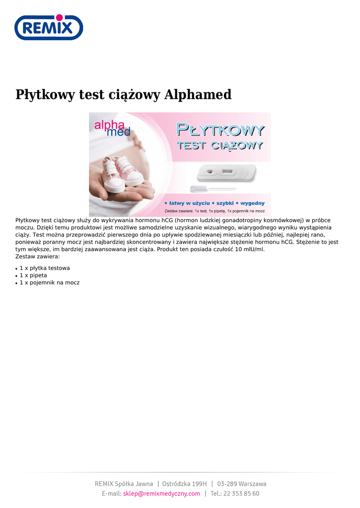 Płytkowy test ciążowy Alphamed Płytkowy test ciążowy służy do wykrywania hormonu hCG (hormon ludzkiej gonadotropiny kosmówkowej) w próbce moczu. Dzięki temu produktowi jest możliwe samodzielne uzyskanie wizualnego, wiarygodnego wyniku wystąpienia ciąży. Test można przeprowadzić pierwszego dnia po upływie spodziewanej miesiączki lub później, najlepiej rano, ponieważ poranny mocz jest najbardziej skoncentrowany i zawiera największe stężenie hormonu hCG. Stężenie to jest tym większe, im bardziej zaawansowana jest ciąża. Produkt ten posiada czułość 10 mlU/ml. Zestaw zawiera: ● ● ● 1 x płytka testowa 1 x pipeta 1 x pojemnik na mocz