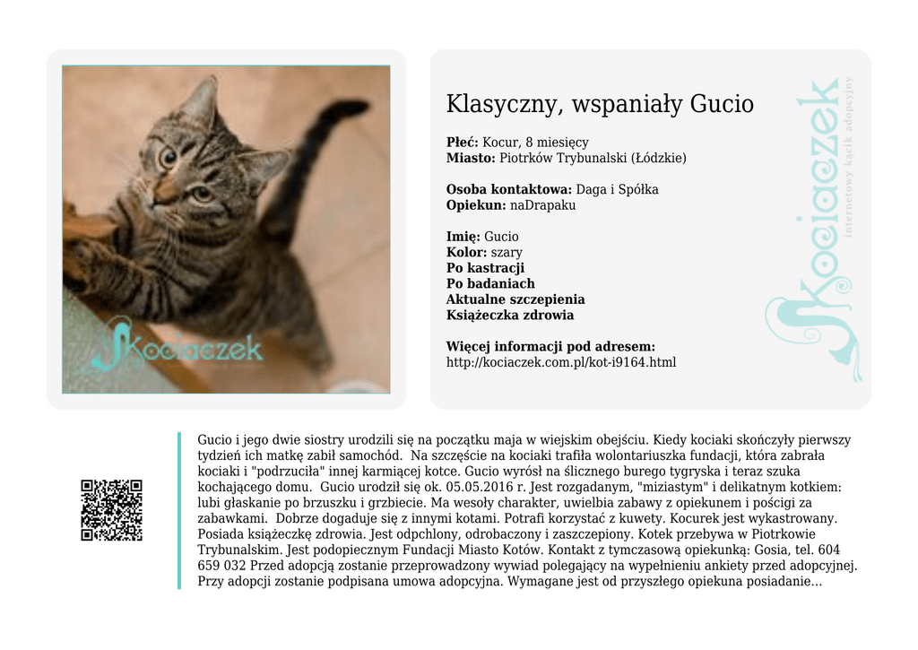 Klasyczny, wspaniały Gucio Płeć: Kocur, 8 miesięcy Miasto: Piotrków Trybunalski (Łódzkie) Osoba kontaktowa: Daga i Spółka Opiekun: naDrapaku Imię: Gucio Kolor: szary Po kastracji Po badaniach Aktualne szczepienia Książeczka zdrowia Więcej informacji pod adresem: http://kociaczek.com.pl/kot-i9164.html Gucio i jego dwie siostry urodzili się na początku maja w wiejskim obejściu. Kiedy kociaki skończyły pierwszy tydzień ich matkę zabił samochód. Na szczęście na kociaki trafiła wolontariuszka fundacji, która zabrała kociaki i "podrzuciła" innej karmiącej kotce. Gucio wyrósł na ślicznego burego tygryska i teraz szuka kochającego domu. Gucio urodził się ok. 05.05.2016 r. Jest rozgadanym, "miziastym" i delikatnym kotkiem: lubi głaskanie po brzuszku i grzbiecie. Ma wesoły charakter, uwielbia zabawy z opiekunem i pościgi za zabawkami. Dobrze dogaduje się z innymi kotami. Potrafi korzystać z kuwety. Kocurek jest wykastrowany. Posiada książeczkę zdrowia. Jest odpchlony, odrobaczony i zaszczepiony. Kotek przebywa w Piotrkowie Trybunalskim. Jest podopiecznym Fundacji Miasto Kotów. Kontakt z tymczasową opiekunką: Gosia, tel. 604 659 032 Przed adopcją zostanie przeprowadzony wywiad polegający na wypełnieniu ankiety przed adopcyjnej. Przy adopcji zostanie podpisana umowa adopcyjna. Wymagane jest od przyszłego opiekuna posiadanie…