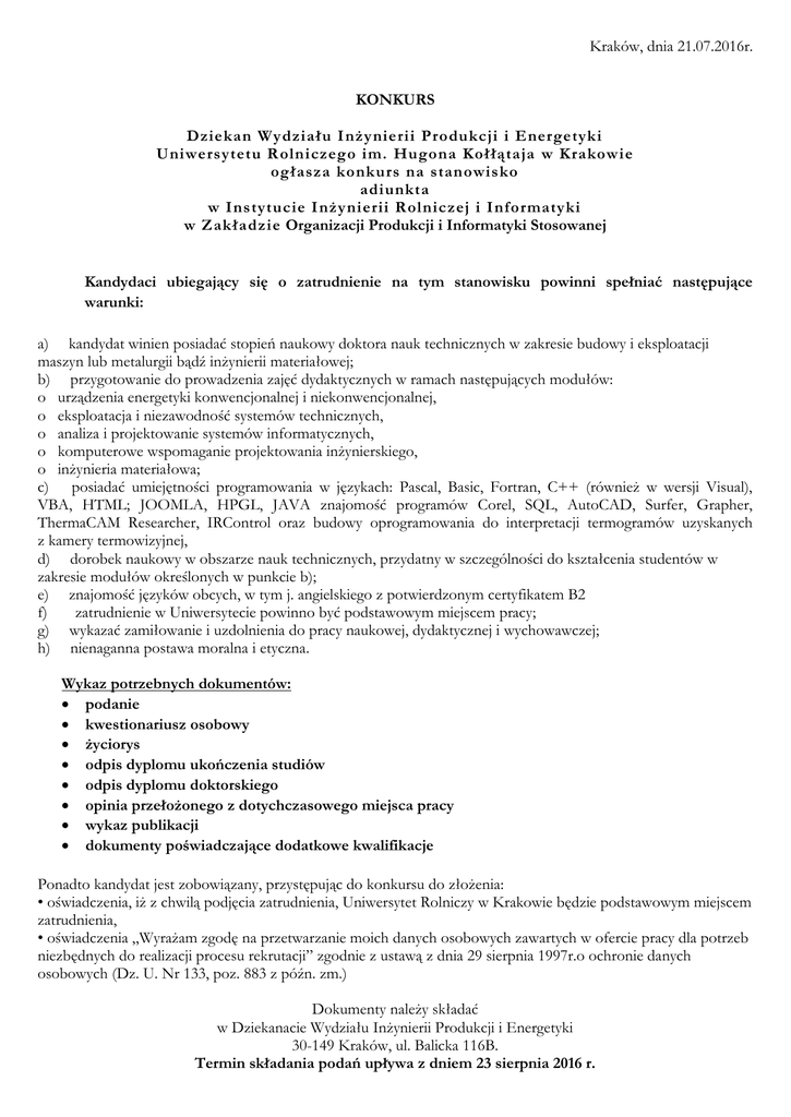 Kraków, dnia 21.07.2016r. KONKURS Dziekan Wydziału Inżynierii Produkcji i Energetyki Uniwersytetu R olniczego im. Hugona Kołłątaja w Krakowie ogłasza konkurs na stanowisko adiunkta w Instytucie Inżynierii Rolniczej i Informatyki w Zakładzie Organizacji Produkcji i Informatyki Stosowanej Kandydaci ubiegający się o zatrudnienie na tym stanowisku powinni spełniać następujące warunki: a) kandydat winien posiadać stopień naukowy doktora nauk technicznych w zakresie budowy i eksploatacji maszyn lub metalurgii bądź inżynierii materiałowej; b) przygotowanie do prowadzenia zajęć dydaktycznych w ramach następujących modułów: o urządzenia energetyki konwencjonalnej i niekonwencjonalnej, o eksploatacja i niezawodność systemów technicznych, o analiza i projektowanie systemów informatycznych, o komputerowe wspomaganie projektowania inżynierskiego, o inżynieria materiałowa; c) posiadać umiejętności programowania w językach: Pascal, Basic, Fortran, C++ (również w wersji Visual), VBA, HTML; JOOMLA, HPGL, JAVA znajomość programów Corel, SQL, AutoCAD, Surfer, Grapher, ThermaCAM Researcher, IRControl oraz budowy oprogramowania do interpretacji termogramów uzyskanych z kamery termowizyjnej, d) dorobek naukowy w obszarze nauk technicznych, przydatny w szczególności do kształcenia studentów w zakresie modułów określonych w punkcie b); e) znajomość języków obcych, w tym j. angielskiego z potwierdzonym certyfikatem B2 f) zatrudnienie w Uniwersytecie powinno być podstawowym miejscem pracy; g) wykazać zamiłowanie i uzdolnienia do pracy naukowej, dydaktycznej i wychowawczej; h) nienaganna postawa moralna i etyczna. Wykaz potrzebnych dokumentów: podanie kwestionariusz osobowy życiorys odpis dyplomu ukończenia studiów odpis dyplomu doktorskiego opinia przełożonego z dotychczasowego miejsca pracy wykaz publikacji dokumenty poświadczające dodatkowe kwalifikacje Ponadto kandydat jest zobowiązany, przystępując do konkursu do złożenia: • oświadczenia, iż z chwilą podjęcia zatrudnienia, Uniwersytet Rolniczy w Krakowie będzie podstawowym miejscem zatrudnienia, • oświadczenia „Wyrażam zgodę na przetwarzanie moich danych osobowych zawartych w ofercie pracy dla potrzeb niezbędnych do realizacji procesu rekrutacji” zgodnie z ustawą z dnia 29 sierpnia 1997r.o ochronie danych osobowych (Dz. U. Nr 133, poz. 883 z późn. zm.) Dokumenty należy składać w Dziekanacie Wydziału Inżynierii Produkcji i Energetyki 30-149 Kraków, ul. Balicka 116B. Termin składania podań upływa z dniem 23 sierpnia 2016 r.
