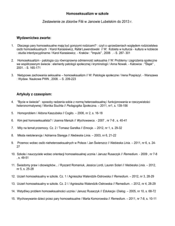 Homoseksualizm w szkole Zestawienie ze zbiorów Filii w Janowie Lubelskim do 2013 r. Wydawnictwa zwarte: 1. Dlaczego pary homoseksualne mają być gorszymi rodzicami? : czyli o uprzedzeniach względem rodzicielstwa osób homoseksualnych / Karol Karasiewicz, Rafał Lawendowski // W: Kobieta w kulturze - kultura w kobiecie : studia interdyscyplinarne / Karol Karasiewicz. - Kraków : "Impuls" , 2006 . - S. 287- 301 2. Homoseksualizm - patologia czy równoprawna odmienność seksualna // W: Problemy i zagrożenia społeczne we współczesnym świecie : elementy patologii społecznej i kryminologii / Anna Nowak. - Katowice : "Śląsk" , 2001. - S. 165-171 3. Nietypowe zachowania seksualne – homoseksualizm // W: Patologie społeczne / Irena Pospiszyl. - Warszawa : Wydaw. Naukowe PWN , 2008. – S. 209-223 Artykuły z czasopism: 4. "Bycie w świecie" : sposoby radzenia sobie z normą heteroseksualną i funkcjonowania w rzeczywistości heteronormatywnej / Monika Siuchta // Pedagogika Społeczna. – 2011, nr1, s. 139-156 5. Homoproblem / Aldona Kaszubska // Cogito. – 2006, nr 2, s. 16-18 6. Kim jest homoseksualista? / Joanna Marszk // Wychowawca. - 2007 , nr 7-8 , s. 40-41 7. Mity na temat przemocy. Cz. 2 / Tomasz Garstka // Emocje. – 2012, nr 1, s. 29-32 8. Młoda nietolerancja / Adrianna Staręga // Niebieska Linia. – 2003, nr 6, 21-22 9. Przemoc wobec osób nieheteroseksualnych w Polsce / Jan Świerszcz // Niebieska Linia. – 2011, nr 6, s. 2427 10. Szkoła i nauczyciele wobec orientacji homoseksualnej ucznia / Janusz Rusaczyk // Remedium. - 2009 , nr 7-8 , s. 49-51 11. Świadomy praw i obowiązków... / Ryszard Romaniuk, Jessica Lordi, Lauren Solari // Niebieska Linia. – 2012, nr 5, s. 25-28 12. Uczeń homoseksualny w szkole. Cz. 1 / Agnieszka Walendzik-Ostrowska // Remedium. – 2012, nr 3, 28-29 13. Uczeń homoseksualny w szkole. Cz. 2 / / Agnieszka Walendzik-Ostrowska // Remedium. – 2012, nr 4, 28-29 14. Wstydliwy problem homoseksualności ucznia / Janusz Rusaczyk // Edukacja i Dialog. – 2005, nr 10, s. 68-72 15. Wychowywanie dzieci przez pary homoseksualne / Marta Komorowska // Remedium. – 2011, nr 7-8, s. 10-11 16. Wychowanie dzieci w związkach homoseksualnych - kilka refleksji / Karolina Kmiecik –Jusięga // Remedium. – 2011, nr 12, s. 28-29 17. Za murem milczenia : niepełnosprawni homoseksualni (esej) / Sandra Tworkowska // Niepełnosprawność i Rehabilitacja. - 2010, nr 4, s. 83-86 18. Zbrodnie nienawiści / Tomasz Kasprzak // Niebieska Linia. – 2003, nr 6, s. 9-12 19. Z wyboru? / Ryszard Romaniuk // Niebieska Linia. – 2010, nr 5, s. 23-25 Oprac. A. Leśnik-Lewandowska