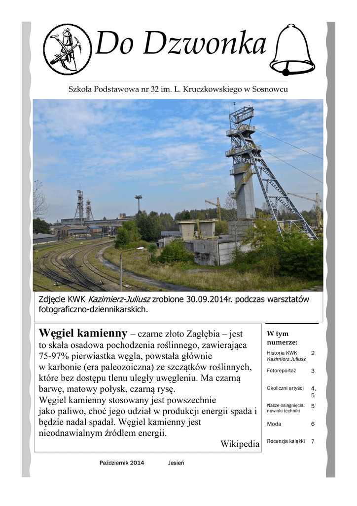 Do Dzwonka Szkoła Podstawowa nr 32 im. L. Kruczkowskiego w Sosnowcu Zdjęcie KWK Kazimierz-Juliusz zrobione 30.09.2014r. podczas warsztatów fotograficzno-dziennikarskich. Węgiel kamienny – czarne złoto Zagłębia – jest to skała osadowa pochodzenia roślinnego, zawierająca 75-97% pierwiastka węgla, powstała głównie w karbonie (era paleozoiczna) ze szczątków roślinnych, które bez dostępu tlenu uległy uwęgleniu. Ma czarną barwę, matowy połysk, czarną rysę. Węgiel kamienny stosowany jest powszechnie jako paliwo, choć jego udział w produkcji energii spada i będzie nadal spadał. Węgiel kamienny jest nieodnawialnym źródłem energii. Wikipedia Październik 2014 Jesień W tym numerze: Historia KWK 2 Kazimierz Juliusz Fotoreportaż 3 Okoliczni artyści 4, 5 Nasze osiągnięcia; nowinki techniki 5 Moda 6 Recenzja książki 7 Smutna historia ostatniej kopalni węgla kamiennego w Zagłębiu Początki działalności górniczej na terenie obszaru górniczego Kopalni KazimierzJuliusz sięgają XIX wieku. W roku 1814 bowiem, w pobliżu Kazimierza Górniczego, na terenach osiedla Ostrowy Górnicze, uruchomiono odkrywkową kopalnię węgla Feliks, która w 1823 roku stała się kopalnią głębinową. W 1884 roku towarzystwo akcyjne p.n. Warszawskie Towarzystwo Kopalń i Zakładów Hutniczych powstałe z zadaniem rozszerzania działalności górniczej, w związku ze stale wzrastającym zapotrzebowaniem na węgiel, oddało do eksploatacji nową, większą kopalnię o nazwie Kazimierz leżącą przy trasie intensywnie rozwijającej się Kolei Warszawsko-Wiedeńskiej. Szyby nowej kopalni Kazimierz głębiono w latach 1879-1883 a w 1884 roku rozpoczęto regularną eksploatację. Kopalnię Juliusz rozpoczęto budować w 1902 roku. W 1914 roku uzyskano z niej pierwsze tony urobku węglowego. Po wykonaniu wyrobisk górniczych łączących Kopalnię Kazimierz z Kopalnią Juliusz, w 1938 roku, Kopalnie te zostały połączone organizacyjnie w jedno przedsiębiorstwo pod nazwą Kopalnia Kazimierz - Juliusz, która to nazwa przetrwała do chwili obecnej. W okresie powojennym dokonano rozbudowy Kopalni głębiąc dwa szyby peryferyjne Maczki i Bory. W latach siedemdziesiątych przeprowadzono modernizację urządzeń wyStr. 2 dobywczo-przeróbczych w Ruchu Juliusz oraz urządzeń wyciągowych w Ruchu Kazimierz, wraz z budową nowego zakładu przeróbki mechanicznej węgla. Pierwsze kombajny ścianowe zaczęto stosować w kopalni już w 1959 roku, zaś kombajny chodnikowe i obudowy zmechanizowane stosuje się od 1972 roku. W 1974 roku przeprowadzono pierwsze w resorcie próby odprężenia pokładu w III stopniu zagrożenia tąpaniami przez wybierkę warstwy podstropowej na zawał z zastosowaniem specjalnie skonstruowanej do tych warunków obudowy zmechanizowanej. Niestety, nasza kopalnia zostanie zamknięta w 2015 r. Będzie to koniec długiej historii przemysłu wydobywczego w naszym regionie. Szkoda, że nasi ojcowie- górnicy muszą szukać pracy daleko od Kazimierza. wg. WikiZagłębie i wykładu p. A. Faracik Do Dzwonka Fotoreportaż - nasza kopalnia oczami dziewczyn z 6a Kolej wąskotorowa na hałdzie, w tle widok na osiedle Wagowa. Staw z hałdą w tle, między Kazimierzem a Pekinem Na górze po lewej: zwały węgla za kopalnią. Na górze po prawej: wieża wyciągowa i budynki Zakładu przeróbczego na terenie KWK Kazimierz Juliusz Po prawej: autorki zdjęć na tle kopalni. (Julia Bochenek, Julia Mikucka, Sara Warzyńska, Natalia Różewicz, Olga Rospondek, Dagmara Cebula, Emilia Masłowska. Zdjęcia uczestniczek i p. J. Widurskiej Str. 3 Do Dzwonka “Biesczadowe anioły” - poznajmy młodą artystkę z Sosnowca W piątek 12.09.2014r. w Miejskim Domu Kultury „Kazimierz” w Sosnowcu odbył się wernisaż wystawy rękodzielnictwa pt. Biesczadowe Anioły. Autorką glinianych rzeźb jest Pani Agnieszka Chróścicka - Kaczmarek. Pani Agnieszka ceramiką zajmuje się od roku. Wcześniej wykonywała dzieła z masy solnej. W swojej pracowni na Czarnym Morzu w Kazimierzu Górniczym posiada wszystkie urządzenia, narzędzia i materiały potrzebne do wykonywania rzeźb ceramicznych m.in. koło garncarskie, piec do wypalania, zapasy gliny. Wyrabianie jednej rzeźby zajmuje około 2 tygodni. Na początku pracy należy naszkicować projekt, potem wyrobić glinę i ukształtować figurkę, którą chcemy zrobić. Wykonana ceramika wypalana jest w piecu w temperaturze ponad 1000 stopni C, następnie malowana szkliwem, którego kolor dopiero zobaczymy po ponownym wypaleniu. Rękodzieła Pani Agnieszki są niepowtarzalne, mają charakter dekoracyjny i użytkowy. Pod koniec spotkania z autorką Str. 4 wystawy, każdy uczestnik wernisażu mógł pomalować na swój własny sposób aniołka oraz dostać ceramiczne serduszko (zielone lub czerwone ) z autografem artystki. Niektóre dzieła Pani Agnieszki niosą ze sobą różne przesłania – świadczą o tym dowcipne, ale mądre tytuły np. „ TAM DOM TWÓJ, GDZIE KAPCIE TWOJE ”. Nazwa „Biesczadownia” powstała ku czci Bieszczad, które są dla Pani Agnieszki majestatycznym miejscem i którymi jest zafascynowana. A przedrostek biesy - no cóż, diałby są wszędzie... Mamy nadzieję, że ta młoda artystka z Sosnowca jeszcze nie raz pokaże nam swoje piękne prace. Życzymy sukcesów. Wszystkie dostępne informacje na temat pracowni oraz dzieł artystki można zobaczyć na stronie internetowej www.biesczadownia.pl. Emilia Masłowska, Natalia Różewicz, klasa VIa Zdjęcia: A. Rospondek Do Dzwonka Artysta z Zaglębia - Dawid Podsiadło Dawid Podsiadło urodził się 23 maja 1993 r w Dąbrowie Górniczej. Jest on młodym i bardzo zdolnym piosenkarzem, już udało mu się zrobić w kraju wielką karierę. Ukończył I Liceum Ogólnokształcące im. Waleriana Łukasińskiego w Dąbrowie Górniczej, a także szkołę muzyczną I stopnia w klasie puzonu. Karierę muzyczną rozpoczął dzięki programowi X-Factor, którego był laureatem. W f