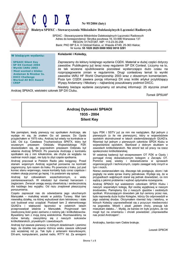 CQDX Nr 95/2004 (luty) Biuletyn SPDXC - Stowarzyszenia Mi ników Dalekosi nych czno ci Radiowych SPDXC - Stowarzyszenie Mi ników Dalekosi nych czno ci Radiowych Adres do korespondencji: Skrytka pocztowa 19, 03-996 Warszawa 131 REGON: 017437287, NIP: 113-23-35-258 Bank: PKO BP S.A. II Oddzia Kielce, ul. Weso a 47/49, 25-363 Kielce; Nr konta: 55 1020 2629 0000 9502 0010 3291 W bie cym wydaniu: Kole anki i Koledzy, - SP6AOI Silent Key - SP DX Contest 2004 - Wyniki IARU 2003 - Most wanted z bliska: Andaman & Nicobar Is. - DXCC Challenge - Worked All BCC Award - CRSP Zapraszamy do lektury kolejnego wydania CQDX. Materia w du ej cz ci dotyczy zawodów. Publikujemy ju teraz nowy regulamin SP DX Contest. Liczymy na to, e tak wczesne opublikowanie pozostawi wystarczaj co du o czasu na rozpropagowanie zmian w regulaminie. Drugi contestowy temat to wyniki zawodów IARU HF World Championship 2003 wraz z obszernym komentarzem. Poza tym CQDX zawiera porcj informacji DX oraz krótki artyku przybli aj cy Wyspy Andamany i Nikobary – najbardziej poszukiwany podmiot DXCC. Niestety bie ce wydanie zaczynamy od smutnej informacji: 25 stycznia zmar Andrzej SP6AOI, wieloletni cz onek SP DX Clubu. Tomek SP5UAF Andrzej Dybowski SP6AOI 1935 - 2004 Silent Key Nie pami tam, kiedy pierwszy raz spotka em Andrzeja, ale wydaje mi si , e zna em Go od zawsze. Do Opola przyjecha em w 1975 roku. Andrzej by wtedy na kontrakcie w Libii. Od .p. Czes awa Truchanowicza SP6TX, który by wczesnym prezesem Oddzia u Wojewódzkiego PZK dowiedzia em si , e poprzednim prezesem Oddzia u by nie Andrzej SP6AOI. Po powrocie Andrzeja z kontraktu spotka em si z nim kilkakrotnie, ale chyba ze wzgl du na nadmiar moich zaj , nie by y to zbyt cz ste spotkania. Andrzej pracowa w Polskim Radio jako ksi gowy. Przed stanem wojennym Andrzej wyjecha ponownie na kontrakt zagraniczny, tym razem do Iraku. Po powrocie z Iraku, ju pod koniec stanu wojennego, nasze kontakty by y coraz cz stsze i mia em okazj pozna go lepiej. I to postaram si opisa . Andrzej by cz owiekiem wszechstronnym, o wielu zainteresowaniach. W m odo ci by równie harcerzem i eglarzem. Zwraca uwag swoj otwarto ci i serdeczno ci dla ka dego bez wyj tku. Od razu znajdowa p aszczyzn porozumienia. Cz sto zaprasza nas do odwiedzenia jego ukochanych Marsza ek – malutkiej wioski w pobli u Turawy. Mia tam niewielk dzia , na której wybudowa dom letniskowy i stale co budowa oraz urz dza . Postawi tam 2 elementowego QUAD’a i wi kszo czno ci w ostatnich latach przeprowadza w nie z Marsza ek. Przyjmowa tam niezliczon ilo go ci zarówno z rodziny jak i krótkofalowców. Bywali my tam z moj on wielokrotnie. Rozmawiali my na ró ne tematy, cieszyli my si z naszych sukcesów krótkofalarskich, prywatnych i zawodowych. Andrzej by zawsze pierwszy w ró nych dziedzinach i pomimo tego, e dzieli a nas pewna ró nica wieku zawsze odkrywa co wcze niej ni ja. Tak by o z antenami kierunkowymi, DX-ami, komputerami, packet radio, RTTY itd. Za emisjami typu PSK i SSTV ju za nim nie nad em. By jednym z pierwszych (o ile nie pierwszym), który w województwie opolskim skonstruowa w latach siedemdziesi tych QUAD’a. Równie by jednym z pierwszych cz onków SPDX Klubu w województwie opolskim. Startowa z dobrym skutkiem w zawodach krótkofalarskich. Nie stroni te od pracy na rzecz spo eczno ci krótkofalarskiej. W ostatniej kadencji by wiceprezesem OT PZK w Opolu i pomaga mniej do wiadczonym kolegom z Zarz du OT. Pomimo swej wiedzy i do wiadczenia w sprawach organizacyjnych i technicznych, cz sto zasi ga rady innych w tym i moich. Nieraz zastanawia em si , dlaczego tak post puje, skoro i tak pogl dy na wiele spraw mamy jednakowe. Wydaje si , e w przypadkach w tpliwych stara si jednak dowiedzie , co inni dz o jakim problemie i wybra optymalne rozwi zanie. Andrzej SP6AOI by wieloletnim cz onkiem SPDX Klubu i naszym wspania ym koleg . By osob wyj tkow w naszym rodowisku. Pami tamy Go z naszych zjazdów i osobistych spotka . Wzruszaj cym dowodem jak by ceniony przez nas, by a naprawd du a liczba Kolegów, którzy Go odprowadzili w jego ostatniej drodze. Otrzyma em równie listy i telefony, w których Koledzy usprawiedliwiali si z przyczyn nieobecno ci na pogrzebie. Mówili i pisali „jestem chory, pracuj lub mieszkam daleko...”. My , e bardzo im by o przykro, e nie mogli by na cmentarzu i chcieli powiedzie „Usprawiedliw nas przed Andrzejem”. Andrzejku, bardzo nam Ciebie brakuje. Strona 1 z 8 Leszek SP6CIK SP DX Contest Na ostatnim Zje dzie SP DX Clubu zapad a decyzja o wprowadzeniu zmian w zawodach SP DX Contest. Zjazd zasugerowa pewne zmiany, pozostawiaj c ich dopracowanie zespo owi do wiadczonych osób: do wiadczonych zarówno pod wzgl dem contestowym, jak te i pod wzgl dem umiej tno ci tworzenia formalnych dokumentów. W pracy nad opracowaniem regulaminu wzi li udzia (alfabetycznie wg. znaków): Jan SP2B, Kazimierz SP2FAX, Czes aw SP2UKB, Henryk SP3FYM, Bogdan SP3RBR, Zygmunt SP5ELA, Leszek SP6CIK, Marek SP7DQR i Krzysztof SP7GIQ. Z ramienia ZG PZK w pracach uczestniczyli SP2B (Wiceprezes ds. Sportowych PZK) oraz SP2UKB (Sekretarz PZK). Z ramienia SP DX Clubu w pracach uczestniczy SP5ELA. Nad formalnym przebiegiem prac nadzor mia tak e Tomek SP5CCC. Opracowanie tre ci zmienionego regulaminu nie by o atw prac . Chyba najbardziej tre ciwym zobrazowaniem tej pracy jest krótki opis autorstwa Zygmunta SP5ELA: Cz onkowie Komisji wykazywali aktywno od s abej do niezwykle intensywnej. Wyst powa y okresy niezwyk ej aktywno ci i okresy przerw. Ka dy co wniós do prac nad regulaminem. Rodzi on si w wielkich bólach. Ten pozornie prosty dokument, tylko pozornie by prosty. Ka dy jego zapis, ka de zdanie i ka de s owo by y optymalizowane przez 30 lat. Naruszenie b zmiana jakiegokolwiek zapisu, implikowa y konieczno kolejnych zmian. Ostatecznie uzyskano kompromis w momencie, kiedy Komisja by a u progu za amania. Niektórzy jej cz onkowie na przestrzeni okresu pracy mieli "powa ne za amania nerwowe" i rezygnowali z pr