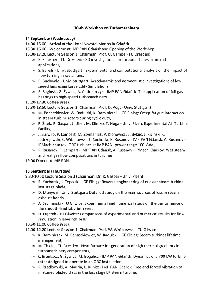 30-th Workshop on Turbomachinery 14 September (Wednesday) 14.00-15.00 - Arrival at the Hotel Novotel Marina in Gdańsk 15.30-16.00 - Welcome at IMP PAN Gdańsk and Opening of the Workshop 16.00-17.20 Lecture Session 1 (Chairman: Prof. U. Gampe - TU Dresden) • E. Klausner - TU Dresden: CFD investigations for turbomachines in aircraft applications, • S. Bareiß - Univ. Stuttgart: Experimental and computational analysis on the impact of flow turning in radial fans, • P. Buchwald - Univ. Stuttgart: Aerodynamic and aeroacoustic investigations of low speed fans using Large Eddy Simulations, • P. Bagiński, G. Żywica, A. Andrearczyk - IMP PAN Gdańsk: The application of foil gas bearings to high-speed turbomachinery 17.20-17.30 Coffee Break 17.30-18.50 Lecture Session 2 (Chairman: Prof. D. Vogt - Univ. Stuttgart) • M. Banaszkiewicz, W. Radulski, K. Dominiczak – GE Elbląg: Creep-fatigue interaction in steam turbine rotors during cyclic duty, • P. Žitek, R. Gaspar, J. Uher, M. Klimko, T. Noga - Univ. Plzen: Experimental Air Turbine Facility, • J. Surwiło, P. Lampart, M. Szymaniak, P. Klonowicz, S. Bykuć, J. Kiciński, Ł. Jędrzejewski, Ł. Witanowski, T. Suchocki, R. Rusanov - IMP PAN Gdańsk, A. Rusanov IPMach Kharkov: ORC turbines at IMP PAN (power range 100 kWe), • R. Rusanov, P. Lampart - IMP PAN Gdańsk, A. Rusanov - IPMach Kharkov: Wet steam and real gas flow computations in turbines 19.00 Dinner at IMP PAN 15 September (Thursday) 9.30-10.50 Lecture Session 3 (Chairman: Dr. R. Gaspar - Univ. Plzen) • R. Kucharski, J. Topolski – GE Elbląg: Reverse enginneering of nuclear steam turbine last stage blade, • D. Munyoki - Univ. Stuttgart: Detailed study on the main sources of loss in steam exhaust hoods, • A. Szymański - TU Gliwice: Experimental and numerical study on the performance of the smooth-land labyrinth seal, • D. Frączek - TU Gliwice: Comparisons of experimental and numerical results for flow simulation in labyrinth seals 10.50-11.00 Coffee Break 11.00-12.20 Lecture Session 4 (Chairman: Prof. W. Wróblewski - TU Gliwice) • K. Dominiczak, M. Banaszkiewicz, W. Radulski – GE Elbląg: Steam turbines lifetime management, • M. Thiele - TU Dresden: Heat furnace for generation of high thermal gradients in turbomachinery components, • Ł. Breńkacz, G. Żywica, M. Bogulicz - IMP PAN Gdańsk: Dynamics of a 700 kW turbine rotor designed to operate in an ORC installation, • R. Rzadkowski, A. Maurin, L. Kubitz - IMP PAN Gdańsk: Free and forced vibration of mistuned bladed discs in the last stage LP steam turbine, 12.20-12.30 Coffee Break 12.30-13.50 Visit at Labs 14.00 Lunch at IMP PAN 15.00-16.20 Lecture Session 5 (Chairman: Prof. P. Lampart - IMP PAN Gdańsk) • K. Smołka - TU Gliwice: Analysis of the steam condensing flow in de Laval nozzle and linear blade cascade, • Ł. Jędrzejewski P. Lampart, M. Szymaniak, S. Bykuć, J. Surwiło, Ł. Witanowski, P. Klonowicz, G. Żywica - IMP PAN Gdańsk: Gas/steam (ORC) cycle for small-scale cogereration, • M. Lackowski, H. Nowakowska - IMP PAN Gdańsk: Flow control by means of dielectroforesis • F. Tejero, P. Flaszyński, R. Szwaba, J. Telega – IMP PAN Gdańsk: Unsteady conjugate heat transfer analysis for impinging jet cooling 16.20-16.30 Coffee Break 16.30-18.30 Jubilee Session of Prof. A. Gardzilewicz • P. Lampart - IMP PAN Gdańsk: Prof. A. Gardzilewicz on his 77-th birthday and 55 years in work, • Congratulations & Greetings, • Prof. A. Gardzilewicz - IMP PAN Gdańsk: Wet steam flow in turbines, • K. Jesionek, W. Pospolita - TU Wrocław, J. Badur, P. Ziółkowski - IMP PAN Gdańsk: Analysis of the Baumann stage operation, • J. Głuch - TU Gdańsk: Diagnostics of large power units, 19.00 Dinner in the City 16 September (Friday) 8.00 Departure to Jabłonna (near Warsaw) 11.50-12.00 Coffee Break 12.00-13.45 Visit in KEZO (IMP PAN Research Centre for Renewable Energies) 14.00 Lunch at Jabłonna Palace 15.00 Return home or alternatively back to Gdańsk (arrival at 19.00)