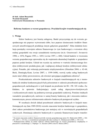 4 Adam Baszyński dr hab. Adam Baszyński Wydział Ekonomii Uniwersytet Ekonomiczny w Poznaniu Reformy bankowe a wzrost gospodarczy. Przykład krajów transformujących się 1. Wstęp Sektor bankowy jest branżą usługową. Banki przyczyniają się do wzrostu gospodarczego nie poprzez wytwarzanie dóbr, lecz poprzez dostarczanie środków finansowych umożliwiających produkcję innym gałęziom gospodarki1. Silna dodatnia korelacja pomiędzy rozwojem sektora finansowego (w tym bankowego) a wzrostem sfery realnej gospodarki ma swoje uzasadnienie teoretyczne (m.in. Greenwood i Jovanovic 1990, s. 1076; Pagano 1993, s. 1693; Levine 1997, s. 688). Udział banków w tworzeniu wzrostu gospodarczego sprowadza się do wspierania akumulacji kapitału w gospodarce poprzez podaż kredytu. Udział ten wyraża się zarówno w wartości dostarczonego kredytu (efektywność produkcyjna), jak i najlepszej alokacji kredytu (efektywność alokacyjna). Ponadto, jak wskazują porównania międzynarodowe (Honohan 2004, s. 43-44; Beck, Demirgüç-Kunt, Levine 2007, s. 1599-1600), rozwój rynku usług bankowych może mieć efekty prowzrostowe, ale również sprzyjające pogłębianiu ubóstwa2. Przekształcenia sektorów bankowych w krajach transformujących się z monobanku do struktur konkurencyjnych były priorytetem w zakresie przeobrażeń społecznogospodarczych zachodzących w tych krajach na przełomie lat 80. i 90. XX wieku. Zakładano, że sprawnie funkcjonujący rynek usług depozytowo-kredytowych i rozliczeniowych stanie się podstawą rozwoju gospodarki rynkowej. Pomimo trudnych warunków początkowych, zarówno w samej branży bankowej, jak i otoczeniu makroekonomicznym, proces reformowania sektorów bankowych postępował szybko. W rezultacie dwóch dekad przeobrażeń sektorów bankowych w krajach transformujących się (lata 1989-2010) wzrosło znaczenie kredytu bankowego w gospodarce, choć zakres pośrednictwa bankowego jest mniejszy niż w rozwiniętych gospodarkach rynkowych. Dominacja sektorów bankowych w systemie finansowym krajów transfor1 Na temat znaczenia rynków finansowych dla wzrostu gospodarczego pisze S.I. Bukowski (2009, s. 186191; 2011, s. 25-32), a o neutralności pieniądza dla sfery realnej J.L. Bednarczyk (2008, s. 105-113). 2 Podsumowanie debaty na temat wpływu sektora bankowego na wzrost gospodarczy znajdujemy w pracach R. Lucchettiego, L. Papiego i A. Zazzaro (2001) oraz R. Stulza (2001). Reformy bankowe a wzrost gospodarczy mujących się spowodowała, że kredyt bankowy stał się głównym źródłem zewnętrznego finansowania przedsięwzięć inwestycyjnych. Problem referatu sformułowano w postaci pytania, czy reformy sektorów bankowych w krajach transformujących się sprzyjały wzrostowi gospodarczemu? Celem badania przeprowadzonego dla 30 krajów transformujących się jest poszukiwanie współzależności pomiędzy reformami bankowymi a wielkościami takimi jak wzrost gospodarczy, poziom produktu krajowego brutto per capita, relacja inwestycji do PKB, czy dostępność kredytu. Sformułowano hipotezę, że sektory bankowe w krajach transformujących się były beneficjentami procesu wzrostu gospodarczego. Badaniu poddano dane na temat funkcjonowania 30 krajów transformujących się (TC, ang. transition countries). Wydzielono przy tym cztery grupy terytorialne krajów: Europę Środkowo-Wschodnią i kraje bałtyckie (CEB, ang. Central-Eastern Europe and the Baltic states), Europę Południowo-Wschodnią (SEE, ang. South-Eastern Europe), Europę Wschodnią i Kaukaz (EEC, ang. Eastern Europe and Caucasus) oraz Azję Centralną (CA, ang. Central Asia)3. Dane pochodzą z raportów i baz danych EBRD i obejmują lata 1989-2010. 2. Reformy bankowe w krajach transformujących się Trójkąt postępu reform bankowych (TRB) jest modelem zastosowanym w pracy S. Friesa i A. Taci (2002, s. 4-8), będącym próbą określenia kryteriów oceny reform bankowych. TRB to diagram w postaci wykresu radarowego użyty do zilustrowania postępu reform bankowych w oparciu o trzy zmienne: dwa – publikowane przez EBOR – indeksy reform bankowych i reform przedsiębiorstw oraz – publikowany przez Bank Światowy – udział sektora prywatnego w aktywach banków. Wierzchołki trójkąta wskazują skrajne wartości mierników. Foremność trójkąta wskazuje na równomierność przebiegu reform, tzn. im trójkąt bardziej zbliżony do równobocznego, tym bardziej zrównoważony przebieg reform bankowych. Natomiast pole powierzchni tak otrzymanego trójkąta stanowić będzie relatywną miarę postępu reform rynku usług bankowych. 3 Do grupy CEB zaliczono: Chorwację (HRV), Czechy (CZE), Estonię (EST), Litwę (LTU), Łotwę (LVA), Polskę (POL), Słowację (SVK), Słowenię (SVN) i Węgry (HUN). W skład SEE wchodzą: Albania (ALB), Bułgaria (BGR), Bośnia i Hercegowina (BiH), Czarnogóra (MNE), Macedonia (MKD), Rumunia (ROM), Serbia (SRB) i Turcja (TUR). EEC stanowią: Armenia (ARM), Azerbejdżan (AZE), Białoruś (BLR), Gruzja (GEO), Mołdawia (MDA), Rosja (RUS), i Ukraina (UKR). Do krajów CA zaliczono: Kazachstan (KAZ), Kirgistan (KGZ), Mongolię (MNG), Tadżykistan (TJK), Turkmenistan (TKM) i Uzbekistan (UZB). W badaniu pominięto Kosowo (KSV) ze względu na brak wiarygodnych danych. Dla uproszczenia zapisu w dalszej części opracowania posłużono się trzyliterowymi kodami poszczególnych krajów. 5 6 Adam Baszyński Powiększanie się pola powierzchni trójkąta oznacza postęp w zakresie reform, zmniejszanie odpowiednio regres. Rysunek 1 ilustruje hipotetyczny trójkąt reform bankowych dla kraju charakteryzującego się zrównoważonym postępem przeobrażeń. Rysunek 1. Trójkąt reform bankowych (TRB) Indeks reform przedsiębiors tw 4,00 3,00 Udział sektora prywatnego w aktywach banków 2,00 1989 1,00 2000 0,00 2010 Indeks reform bankowych Źródło: opracowanie własne na podstawie pomysłu S. Friesa i A. Taci (2002, s. 4-8). Rysunek 2 przedstawia pole powierzchn