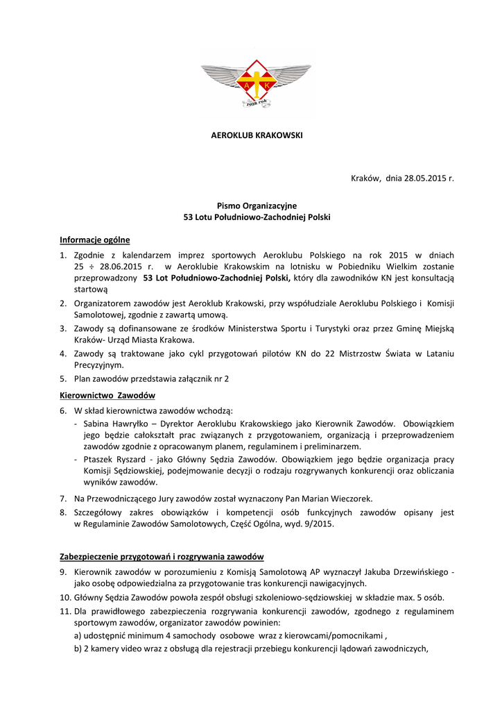 AEROKLUB KRAKOWSKI Kraków, dnia 28.05.2015 r. Pismo Organizacyjne 53 Lotu Południowo-Zachodniej Polski Informacje ogólne 1. Zgodnie z kalendarzem imprez sportowych Aeroklubu Polskiego na rok 2015 w dniach 25 ÷ 28.06.2015 r. w Aeroklubie Krakowskim na lotnisku w Pobiedniku Wielkim zostanie przeprowadzony 53 Lot Południowo-Zachodniej Polski, który dla zawodników KN jest konsultacją startową 2. Organizatorem zawodów jest Aeroklub Krakowski, przy współudziale Aeroklubu Polskiego i Komisji Samolotowej, zgodnie z zawartą umową. 3. Zawody są dofinansowane ze środków Ministerstwa Sportu i Turystyki oraz przez Gminę Miejską Kraków- Urząd Miasta Krakowa. 4. Zawody są traktowane jako cykl przygotowań pilotów KN do 22 Mistrzostw Świata w Lataniu Precyzyjnym. 5. Plan zawodów przedstawia załącznik nr 2 Kierownictwo Zawodów 6. W skład kierownictwa zawodów wchodzą: - Sabina Hawryłko – Dyrektor Aeroklubu Krakowskiego jako Kierownik Zawodów. Obowiązkiem jego będzie całokształt prac związanych z przygotowaniem, organizacją i przeprowadzeniem zawodów zgodnie z opracowanym planem, regulaminem i preliminarzem. - Ptaszek Ryszard - jako Główny Sędzia Zawodów. Obowiązkiem jego będzie organizacja pracy Komisji Sędziowskiej, podejmowanie decyzji o rodzaju rozgrywanych konkurencji oraz obliczania wyników zawodów. 7. Na Przewodniczącego Jury zawodów został wyznaczony Pan Marian Wieczorek. 8. Szczegółowy zakres obowiązków i kompetencji osób funkcyjnych zawodów opisany jest w Regulaminie Zawodów Samolotowych, Część Ogólna, wyd. 9/2015. Zabezpieczenie przygotowań i rozgrywania zawodów 9. Kierownik zawodów w porozumieniu z Komisją Samolotową AP wyznaczył Jakuba Drzewińskiego jako osobę odpowiedzialna za przygotowanie tras konkurencji nawigacyjnych. 10. Główny Sędzia Zawodów powoła zespół obsługi szkoleniowo-sędziowskiej w składzie max. 5 osób. 11. Dla prawidłowego zabezpieczenia rozgrywania konkurencji zawodów, zgodnego z regulaminem sportowym zawodów, organizator zawodów powinien: a) udostępnić minimum 4 samochody osobowe wraz z kierowcami/pomocnikami , b) 2 kamery video wraz z obsługą dla rejestracji przebiegu konkurencji lądowań zawodniczych, c) zabezpieczyć odpowiednią ilość materiałów biurowych oraz kserokopiarkę. 12. Kierownik zawodów wyznaczył Pana Marcina Sikorę jako koordynatora technicznego zawodów, który będzie odpowiedzialny za organizację pracy w zakresie obsługi technicznej samolotów biorących udział w zawodach. 13. Dla prawidłowego zabezpieczenia ruchu lotniczego Kierownik zawodów obowiązkowo wyznaczy na czas zawodów osobę odpowiedzialną za nadzór nad ruchem lotniczym w trakcie zawodów, która wraz ze służbą startową będzie odpowiedzialna za prawidłowe przygotowanie i zabezpieczenie ruchu lotniczego na lotnisku i w jego rejonie, w tym rozłożenia pasa lądowań, jego obsługi podczas konkurencji i prawidłowej oceny lądowań. Regulamin zawodów, wyposażenie zawodnicze 14. Zawody będą rozgrywane według Regulaminu zawodów samolotowych – Cześć Ogólna, Wyd. 9/2015 oraz aktualny Regulamin Zawodów w Lataniu Precyzyjnym – 2015. 15. Wyniki zawodów wliczane są do Samolotowego Pucharu Polski. 16. Każdy pilot - zawodnik jest zobowiązany do posiadania urządzenia rejestrującego lot nawigacyjny. Warunki uczestnictwa, zgłoszenia 17. Zawodnik (pilot-dowódca) powinien posiadać: a) ważną licencję pilota samolotowego lub odpowiednio świadectwo kwalifikacji, b) ważne kwalifikacje do wykonywania lotów na danym statku powietrznym. c) ważne badania lotniczo-lekarskie d) aktualne KWT i KTP 18. Zawodnik musi posiadać ważną licencję sportową Aeroklubu Polskiego w sporcie samolotowym. 19. Wszyscy zawodnicy są zobowiązani do dnia 16.06.2015 r. dokonać zgłoszenia udziału w zawodach na druku zgłoszenia wg załącznika nr 1 Kierownikowi zawodów na adres: [email protected] lub tel/fax. 12 287 04 70. UWAGA! W przypadku nie odwołania swojego udziału do dnia 17.06.2015 r. organizator ma prawo obciążyć kosztami rezerwacji hotelu oraz bankietu nieobecnych uczestników. W przypadku braku pisemnego zgłoszenia we wskazanym terminie organizator nie zapewnia wejścia na bankiet, który odbędzie się podczas Małopolskiego Pikniku Lotniczego. 20. Piloci KN (precyzyjnej) zobowiązani są w terminie do dnia 16.06.2015 r. potwierdzić swój udział w zawodach Komisji Samolotowej - [email protected] 21. Zwolnienia z udziału w zawodach dla członków KN (precyzyjnej) może udzielić KS AP. 22. Koszty uczestnictwa w zawodach wynoszą: - koszty zakwaterowania 60zł.os/ doba - koszty wyżywienia pokrywane we własnym zakresie - opłata organizacyjna (koszt map, zdjęć nawigacyjnych i instrukcji na konkurencje, udział w zakończeniu zawodów, dokumentacja) 200zł. /pilot; - koszty paliwa wg zużytej ilości (przewidywana cena paliwa LL 100 z podatkiem VAT – ok. 6 zł./l) 23. Opłatę organizacyjną należy wnieść do 16.06.2015 r. na konto bankowe organizatora Nr 67 2030 0045 1110 0000 0398 1040 dopiskiem – „Zawody samolotowe 53 LPZP- imię i nazwisko uczestników" UWAGA ! 1. W przypadku wpłaty w późniejszych terminach opłata uczestnika będzie pobierana w wysokości powiększonej o 20%. 2. W przypadku pokrywania kosztów uczestnictwa pilota w zawodach przez jego klub sportowy, na zgłoszeniu wymagany jest podpis Dyrektora i Głównej Księgowej klubu. 24. Zasady uczestnictwa, w tym refundacji kosztów członków KN (precyzyjnej) w zawodach określone są w umowie zawartej pomiędzy Aeroklubem Polskim a organizatorem. str. 2 25. Piloci KN (precyzyjnej) zgodnie z umową pomiędzy Aeroklubem Polskim a organizatorem zawodów, korzystają bezpłatnie z: - zakwaterowania w Hotel Letni AWF; - samolotów KN i paliwa lotniczego na zaplanowane konkurencje nawigacyjne i lądowań; - materiałów na trasy nawigacyjne (mapy, zdjęcia, instrukcje) Pozostałe koszty piloci KN pokryw
