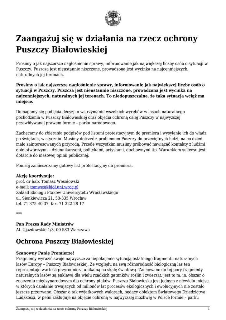 Zaangażuj się w działania na rzecz ochrony Puszczy Białowieskiej Prosimy o jak najszersze nagłośnienie sprawy, informowanie jak największej liczby osób o sytuacji w Puszczy. Puszcza jest nieustannie niszczone, prowadzona jest wycinka na najcenniejszych, naturalnych jej terenach. Prosimy o jak najszersze nagłośnienie sprawy, informowanie jak największej liczby osób o sytuacji w Puszczy. Puszcza jest nieustannie niszczone, prowadzona jest wycinka na najcenniejszych, naturalnych jej terenach. To niedopuszczalne, że taka sytuacja wciąż ma miejsce. Domagamy się podjęcia decyzji o wstrzymaniu wszelkich wyrębów w lasach naturalnego pochodzenia w Puszczy Białowieskiej oraz objęcia ochroną całej Puszczy w najwyższej przewidywanej prawem formie – parku narodowego. Zachęcamy do zbierania podpisów pod listami protestacyjnym do premiera i wysyłanie ich do władz po świętach, w styczniu. Musimy dotrzeć z problemem Puszczy do przeciętnych ludzi, na co dzień mało zainteresowanych przyrodą. Przede wszystkim musimy próbować nawiązać kontakty z ludźmi opiniotwórczymi – dziennikarzami, politykami, artystami, duchownymi itp. Warunkiem sukcesu jest dotarcie do masowej opinii publicznej. Poniżej zamieszczamy gotowy list protestacyjny do premiera. Akcję koordynuje: prof. dr hab. Tomasz Wesołowski e-mail: [email protected] Zakład Ekologii Ptaków Uniwersytetu Wrocławskiego ul. Sienkiewicza 21, 50-335 Wrocław tel. 71 375 40 37, fax. 71 322 28 17 *** Pan Prezes Rady Ministrów Al. Ujazdowskie 1/3, 00 583 Warszawa Ochrona Puszczy Białowieskiej Szanowny Panie Premierze! Pragniemy wyrazić swoje najwyższe zaniepokojenie sytuacją ostatniego fragmentu naturalnych lasów Europy – Puszczy Białowieskiej. Ze względu na swą różnorodność biologiczną las ten reprezentuje wartość przyrodniczą unikalną na skalę światową. Zachowane do tej pory fragmenty naturalnych lasów są enklawą dla wielu rzadkich gatunków roślin i zwierząt, jest to m. in. obszar o znaczeniu międzynarodowym dla ochrony ptaków. Puszcza Białowieska jest jednym z niewielu miejsc, w których działanie trwających od milionów lat procesów ekologicznych i ewolucyjnych nie zostało jeszcze przerwane. Obszar o tak wyjątkowych walorach, będący obiektem Światowego Dziedzictwa Ludzkości, w pełni zasługuje na objęcie ochroną w najwyższej możliwej w Polsce formie – parku Zaangażuj się w działania na rzecz ochrony Puszczy Białowieskiej 1 narodowego. 23 lutego 2000 roku Minister Środowiska przyjął projekt Rozporządzenia o powiększeniu Białowieskiego Parku Narodowego na cały obszar Puszczy z początkiem 2001. Termin ten nie został dotrzymany. Co gorsza, przyjęte w 2003 r. przez Ministra Środowiska plany gospodarowania w Puszczy Białowieskiej na najbliższe dziesięciolecie, nie dość, że nie przewidują powiększenia Parku Narodowego, to zlikwidowały nawet wcześniej obowiązujące moratorium na wycinanie ponad 100-letnich drzew i naturalnych drzewostanów. Traktowanie tego wyjątkowego obszaru leśnego jako źródła surowca drzewnego, kontynuacja niszczenia ostatniej pierwotnej puszczy Europy jest najbardziej dewastującym środowiskowo przedsięwzięciem w Europie, działaniem sprzecznym z obowiązującym w Polsce prawem, kompromitującym Polskę w świecie. My, podpisani, będąc obywatelami Rzeczpospolitej Polskiej i tym samym współwłaścicielami Puszczy Białowieskiej wyrażamy stanowczy protest przeciwko trwającemu niszczeniu Puszczy. Domagamy się od Rządu RP: ● ● podjęcia decyzji o wstrzymaniu wszelkich wyrębów w lasach naturalnego pochodzenia w Puszczy Białowieskiej objęcia ochroną całej Puszczy w najwyższej przewidywanej prawem formie – parku narodowego Zaangażuj się w działania na rzecz ochrony Puszczy Białowieskiej 2
