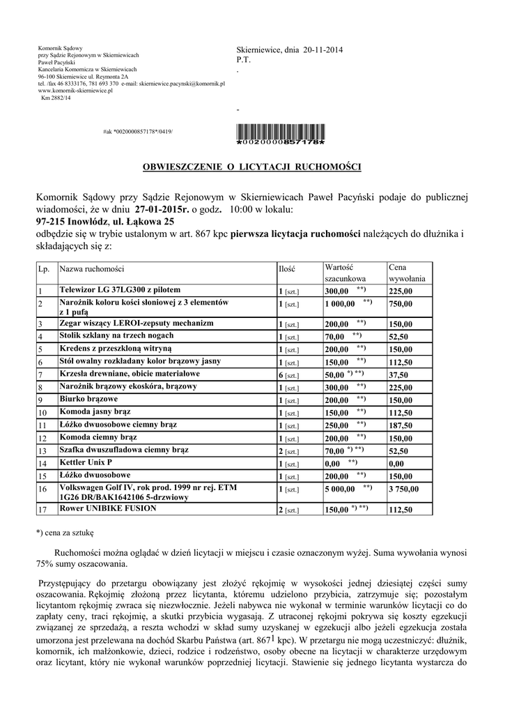 Komornik Sądowy przy Sądzie Rejonowym w Skierniewicach Paweł Pacyński Kancelaria Komornicza w Skierniewicach 96-100 Skierniewice ul. Reymonta 2A tel. /fax 46 8333176, 781 693 370 e-mail: [email protected] www.komornik-skierniewice.pl Km 2882/14 Skierniewice, dnia 20-11-2014 P.T. . #ak *0020000857178*/0419/ *0020000857178* OBWIESZCZENIE O LICYTACJI RUCHOMOŚCI Komornik Sądowy przy Sądzie Rejonowym w Skierniewicach Paweł Pacyński podaje do publicznej wiadomości, że w dniu 27-01-2015r. o godz. 10:00 w lokalu: 97-215 Inowłódz, ul. Łąkowa 25 odbędzie się w trybie ustalonym w art. 867 kpc pierwsza licytacja ruchomości należących do dłużnika i składających się z: 1 [szt.] 1 [szt.] Wartość szacunkowa 300,00 **) 1 000,00 **) Cena wywołania 225,00 750,00 1 [szt.] 1 [szt.] 1 [szt.] 1 [szt.] 6 [szt.] 1 [szt.] 1 [szt.] 1 [szt.] 1 [szt.] 1 [szt.] 2 [szt.] 1 [szt.] 1 [szt.] 1 [szt.] 200,00 **) 70,00 **) 200,00 **) 150,00 **) 50,00 *) **) 300,00 **) 200,00 **) 150,00 **) 250,00 **) 200,00 **) 70,00 *) **) 0,00 **) 200,00 **) 5 000,00 **) 150,00 52,50 150,00 112,50 37,50 225,00 150,00 112,50 187,50 150,00 52,50 0,00 150,00 3 750,00 2 [szt.] 150,00 Lp. Nazwa ruchomości Ilość 1 2 Telewizor LG 37LG300 z pilotem Narożnik koloru kości słoniowej z 3 elementów z 1 pufą Zegar wiszący LEROI-zepsuty mechanizm Stolik szklany na trzech nogach Kredens z przeszkloną witryną Stół owalny rozkładany kolor brązowy jasny Krzesła drewniane, obicie materiałowe Narożnik brązowy ekoskóra, brązowy Biurko brązowe Komoda jasny brąz Łóżko dwuosobowe ciemny brąz Komoda ciemny brąz Szafka dwuszufladowa ciemny brąz Kettler Unix P Łóżko dwuosobowe Volkswagen Golf IV, rok prod. 1999 nr rej. ETM 1G26 DR/BAK1642106 5-drzwiowy Rower UNIBIKE FUSION 3 4 5 6 7 8 9 10 11 12 13 14 15 16 17 *) **) 112,50 *) cena za sztukę Ruchomości można oglądać w dzień licytacji w miejscu i czasie oznaczonym wyżej. Suma wywołania wynosi 75% sumy oszacowania. Przystępujący do przetargu obowiązany jest złożyć rękojmię w wysokości jednej dziesiątej części sumy oszacowania. Rękojmię złożoną przez licytanta, któremu udzielono przybicia, zatrzymuje się; pozostałym licytantom rękojmię zwraca się niezwłocznie. Jeżeli nabywca nie wykonał w terminie warunków licytacji co do zapłaty ceny, traci rękojmię, a skutki przybicia wygasają. Z utraconej rękojmi pokrywa się koszty egzekucji związanej ze sprzedażą, a reszta wchodzi w skład sumy uzyskanej w egzekucji albo jeżeli egzekucja została umorzona jest przelewana na dochód Skarbu Państwa (art. 8671 kpc). W przetargu nie mogą uczestniczyć: dłużnik, komornik, ich małżonkowie, dzieci, rodzice i rodzeństwo, osoby obecne na licytacji w charakterze urzędowym oraz licytant, który nie wykonał warunków poprzedniej licytacji. Stawienie się jednego licytanta wystarcza do odbycia przetargu. Pełnomocnictwo do udziału w przetargu powinno być stwierdzone dokumentem z podpisem urzędowo poświadczonym, chyba że chodzi o pełnomocnictwo udzielone adwokatowi lub radcy prawnemu (art. 8672 kpc) UWAGA: Licytacja może się nie odbyć bez podania przyczyny. Jeżeli drzwi będą zamknięte, będą otwierane na koszt i odpowiedzialność obowiązanegodłużnika. Łukasz Mąkolski Bartłomiej Reczek Anna Bartczak-Lisik Paweł Pacyński aplikant komorniczy asesor komorniczy asesor komorniczy komornik sądowy Do wiadomości: 1. a/a
