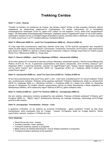 Trekking Cerdos Dzie? 1: Lima - Huaraz: Transfer na lotnisko, lot czarterowy do Huaraz. Na lotnisku czeka? b?dzie na Nas prywatny transport, którym pojedziemy do malowniczej miejscowo?ci Cashapampa. Po drodze zatrzymamy si? w kompleksie archeologicznym Hualcayán (3140 m), gdzie b?d? czeka? na nas tragarze i mu?y, które b?d? transportowa? baga?. Od stanowiska archeologicznego Hualcayán, pójdziemy typow? zygzakowat? drog? a? do 4.200 metrów, podziwiaj?c zachód s?o?ca w Cordillera Negra (Kordyliera Czarna), pierwszy obóz w Wishcash. Z obozu rozci?ga si? widok na pó?nocn? cz??? Cordillera Blanca.( Kordyliera Bia?a) Dzie? 2: Wishcash (4200 m) – prze??cz Toropishtanan (4850 m) - Osoruri (4300 m) W ci?gu tego dnia przemierzymy najwy?szy odcinek ca?ej trasy. Ci??ki wysi?ek wynagrodzi nam wspania?y widok na dwie laguny w kolorze zielonym i turkusowym -Yanacocha i Azulcocha, po?o?onych u stóp imponuj?cej góry Santa Cruz (6259 m). Zej?cie w okolice laguny Cullicocha, miejsca z którego rozpo?ciera si? widok na góry Santa Cruz i Milluacocha (5480 m) . Drugi obóz. Dzie? 3: Osoruri (4300m) – prze??cz Alpamayo (4750m) - Jancarurish (4200m) W tym dniu udamy si? na wschód w kierunku w?wozu Alpamayo, podziwiaj?c jezioro i ?nie?ny szczyt Milluacocha Pilanco (5.373 m). Po ok. 5 godzinach przyb?dziemy nad jezioro Jancarurish, sk?d mo?emy zobaczy? gór? Alpamayo (5947- o kszta?cie piramidy, uwa?an? za najpi?kniejsz? gór? ?wiata). Oprócz Alpamayo podziwia? mo?na tak?e równie? gór? Jancarurish (5578 m), Tayapampa (5.657 m) i Quitaraju (6036 m).Obóz nad przepi?knym lagun?. Dzie? 4: Jancarurish (4200 m) – prze??cz Cara Cara (4.830 m) - Huillca (4.000 m) W tym dniu przemierzymy dwie prze??cze, jedn? z nich - Cara Cara, charakteryzuj?c? si? silnymi wiatrami. Przed tym, przekroczymy lodowiec. Podczas ca?ej wyprawy podziwia? b?dziemy fantastyczny widok na Jancarurisch (5578 m), (Quitaraju 6036 m ), (Rinrihirca 5.810m.), ( Pucahirca 6050 m) i Santa Cruz (6259 m) .Wszystkie szczyty s? oblodzone. Po krótkim odcinku rozpoczniemy zej?cie do doliny Moyobamba z której wejdziemy na Mesapampa (4500m). St?d zobaczymy lagun? Safuna (4.000 m), gdzie rozbijemy obóz. Dzie? 5: Huillca (4.000 m) – prze???z Yanacon (4600 m) - Jancapampa (3600 m) Na tym odcinku zobaczymy kondory przelatuj?ce nad szlakiem. Podczas w?drówki podziwia? b?dziemy gór? Pucajirca (6050 m) . Mijaj?c lagun? Sactaycocha dotrzemy do naszego kempingu, pierwszego po?o?onego poni?ej 4.000 metrów. Dzie? 6: Jancapampa - Pomabamba - Huaraz - Lima. 6 godzinna w?drówka, a? do dotarcia do prowincji Pomabamba , gdzie oczekiwa? b?dzie na Nas firma transportowa, która przewiezie Nas do Yungay - Huaraz. Po?egnalny obiad po d?ugiej podró?y. Wolne popo?udnie i wieczór. Autobus z ?ó?kiem do Limy. Cena obejmuje: Wewn?trzne loty Lima - Huarez Transfery (lotnisko- hotel- lotnisko) Transport naziemny zawarty w programie Bilety wst?pu do Parków Narodowych i innych atrakcji zawartych w programie. Transport prywatny (podczas ca?ej wyprawy) page 1 / 2 Lokalny autobus (tylko) z Huaraz do Limy. Przewodnika turystycznego (j. angielski) Pe?ne wy?ywienie podczas trekkingu Sprz?t kempingowy Cena nie obejmuje: Jedzenia, przek?sek, wody mineralnej, biletów wej?cia na dyskoteki oraz napojów alkoholowych Biletu mi?dzynarodowego Osobistego sprz?tu Co zabra? ze sob??. Dobre buty, latark?, kapelusz, krem przeciws?oneczny, ró?norodn? odzie? Spiwór (opcjonalnie). Mo?liwo?? wypo?yczenia. page 2 / 2 Powered by TCPDF (www.tcpdf.org)