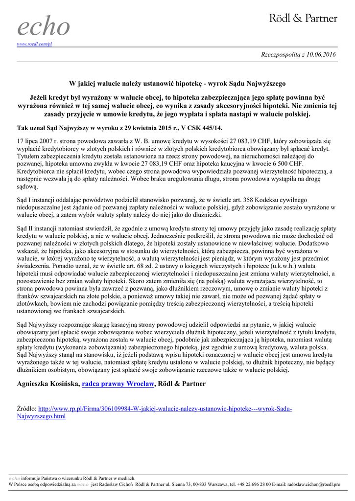 echo www.roedl.com/pl Rzeczpospolita z 10.06.2016 W jakiej walucie należy ustanowić hipotekę - wyrok Sądu Najwyższego Jeżeli kredyt był wyrażony w walucie obcej, to hipoteka zabezpieczająca jego spłatę powinna być wyrażona również w tej samej walucie obcej, co wynika z zasady akcesoryjności hipoteki. Nie zmienia tej zasady przyjęcie w umowie kredytu, że jego wypłata i spłata nastąpi w walucie polskiej. Tak uznał Sąd Najwyższy w wyroku z 29 kwietnia 2015 r., V CSK 445/14. 17 lipca 2007 r. strona powodowa zawarła z W. B. umowę kredytu w wysokości 27 083,19 CHF, który zobowiązała się wypłacić kredytobiorcy w złotych polskich i również w złotych polskich kredytobiorca obowiązany był spłacać kredyt. Tytułem zabezpieczenia kredytu została ustanowiona na rzecz strony powodowej, na nieruchomości należącej do pozwanej, hipoteka umowna zwykła w kwocie 27 083,19 CHF oraz hipoteka kaucyjna w kwocie 6 500 CHF. Kredytobiorca nie spłacił kredytu, wobec czego strona powodowa wypowiedziała pozwanej wierzytelność hipoteczną, a następnie wezwała ją do spłaty należności. Wobec braku uregulowania długu, strona powodowa wystąpiła na drogę sądową. Sąd I instancji oddalając powództwo podzielił stanowisko pozwanej, że w świetle art. 358 Kodeksu cywilnego niedopuszczalne jest żądanie od pozwanej zapłaty należności w walucie polskiej, gdyż zobowiązanie zostało wyrażone w walucie obcej, a zatem wybór waluty spłaty należy do niej jako do dłużniczki. Sąd II instancji natomiast stwierdził, że zgodnie z umową kredytu strony tej umowy przyjęły jako zasadę realizację spłaty kredytu w walucie polskiej, a nie w walucie obcej. Jednocześnie podkreślił, że strona powodowa nie może dochodzić od pozwanej należności w złotych polskich dlatego, że hipoteki zostały ustanowione w niewłaściwej walucie. Dodatkowo wskazał, że hipoteka, jako akcesoryjna w stosunku do wierzytelności, którą zabezpiecza, powinna być wyrażona w walucie, w której wyrażono tę wierzytelność, a walutą wierzytelności jest pieniądz, w którym wyrażony jest przedmiot świadczenia. Ponadto uznał, że w świetle art. 68 zd. 2 ustawy o księgach wieczystych i hipotece (u.k.w.h.) waluta hipoteki musi odpowiadać walucie zabezpieczonej wierzytelności i niedopuszczalna jest zmiana waluty wierzytelności, a pozostawienie bez zmian waluty hipoteki. Skoro zatem zmieniła się (na polską) waluta wyrażająca wierzytelność, to strona powodowa powinna była zawrzeć z pozwaną, jako dłużnikiem rzeczowym, umowę o zmianie waluty hipoteki z franków szwajcarskich na złote polskie, a ponieważ umowy takiej nie zawarł, nie może od pozwanej żądać spłaty w złotówkach, bowiem nie zachodzi powiązanie pomiędzy treścią zabezpieczonej wierzytelności, a treścią hipoteki ustanowionej we frankach szwajcarskich. Sąd Najwyższy rozpoznając skargę kasacyjną strony powodowej udzielił odpowiedzi na pytanie, w jakiej walucie obowiązany jest spłacić swoje zobowiązanie wobec wierzyciela dłużnik hipoteczny, jeżeli wierzytelność z tytułu kredytu, zabezpieczona hipoteką, wyrażona została w walucie obcej, podobnie jak zabezpieczająca ją hipoteka, natomiast walutą spłaty kredytu (wykonania zobowiązania) zabezpieczonego hipoteką, jest zgodnie z umową kredytową, waluta polska. Sąd Najwyższy stanął na stanowisku, iż jeżeli podstawą wpisu hipoteki oznaczonej w walucie obcej jest umowa kredytu wyrażonego także w tej walucie, natomiast spłatę kredytu ustalono w walucie polskiej, to dłużnik hipoteczny, nie będący dłużnikiem osobistym, obowiązany jest spłacić swoje zobowiązanie rzeczowe także w walucie polskiej. Agnieszka Kosińska, radca prawny Wrocław, Rödl & Partner Źródło: http://www.rp.pl/Firma/306109984-W-jakiej-walucie-nalezy-ustanowic-hipoteke---wyrok-SaduNajwyzszego.html echo informuje Państwa o wizerunku Rödl & Partner w mediach. W Polsce osobą odpowiedzialną za echo jest Radosław Cichoń Rödl & Partner ul. Sienna 73, 00-833 Warszawa, tel. +48 22 696 28 00 E-mail: [email protected]