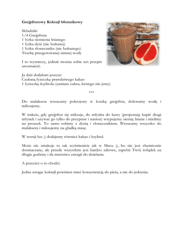 Grejpfrutowy Koktajl błonnikowy Składniki 1/4 Grejpfruta 1 łyżka siemienia lnianego 1 łyżka dyni (nie łuskanej) 1 łyżka słonecznika (nie łuskanego) Trochę przegotowanej zimnej wody I to wystarczy, jednak można sobie ten przepis urozmaicić. Ja dziś dodałam jeszcze: Czubatą łyżeczkę prawdziwego kakao 1 łyżeczkę ksylitolu (zamiast cukru, którego nie jemy) *** Do malaksera wrzucamy pokrojony w kostkę grejpfrut, dolewamy wodę i miksujemy. W trakcie, gdy grejpfrut się miksuje, do młynka do kawy (proponuję kupić drugi młynek i używać go tylko do przypraw i nasion) wsypujemy siemię lniane i mielimy na proszek. To samo robimy z dynią i słonecznikiem. Wrzucamy wszystko do malaksera i miksujemy na gładką masę. W wersji lux ;) dodajemy również kakao i ksylitol. Może nie smakuje to tak wyśmienicie jak w Macu ;), bo nie jest chemicznie dosmaczane, ale przede wszystkim jest bardzo zdrowe, zapełni Twój żołądek na długie godziny i da mnóstwo energii do działania. A przecież o to chodzi. Jedna uwaga: koktajl powinien mieć konsystencję do picia, a nie do jedzenia.