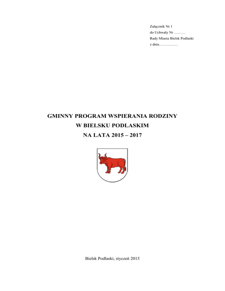 Załącznik Nr 1 do Uchwały Nr ……… Rady Miasta Bielsk Podlaski z dnia…………… GMINNY PROGRAM WSPIERANIA RODZINY W BIELSKU PODLASKIM NA LATA 2015 – 2017 Bielsk Podlaski, styczeń 2015 SPIS TREŚCI: Wprowadzenie str. 2 1. Uwarunkowania prawne str. 4 2. Diagnoza sytuacji rodziny w Gminie Miejskiej Bielsk Podlaski str. 5 3. Zasoby gminy str. 7 4. Analiza SWOT str. 14 5. Cele Programu Wspierania Rodziny str. 15 6. Zadania gminy str. 18 7. Planowany budżet Programu str. 20 8. Monitoring i ewaluacja str. 21 Podsumowanie str. 22 1 Wprowadzenie Rodziny znajdujące się w trudnej sytuacji materialnej i społecznej, zwłaszcza wielodzietne i niepełne, mają prawo do szczególnej pomocy ze strony władz publicznych. Ochrona prawna rodziny stanowi jedną z zasad konstytucyjnych, która znajduje rozwinięcie i konkretyzację w przepisach ustaw szczegółowych, przede wszystkim w Kodeksie rodzinnym i opiekuńczym, Kodeksie postępowania cywilnego, Kodeksie cywilnym, Kodeksie karnym i Kodeksie postępowania karnego. Przepisy prawne wspierające rodzinę występują również w innych unormowaniach prawnych, m.in. w prawie pracy. Rodzina to pierwsze i podstawowe środowisko wychowawcze dziecka, które powinno zapewnić mu prawidłowy rozwój biologiczny i psychospołeczny oraz bezpieczeństwo emocjonalne, a także przygotować do pełnienia przyszłych ról społecznych. Rodzina jest pierwszą instytucją wychowawczą, która kształtuje jego osobowość, postawy, system wartości i aktywność oraz przekazuje tradycje, wzory zachowań i zasady współżycia społecznego. Dlatego jeśli w rodzinie pojawiają się dysfunkcje lub innego rodzaju zagrożenia, patologia czy wykluczenie społeczne instytucje i służby ustawowo zobligowane do wspierania rodziny mają obowiązek podjęcia określonych działań, aby wpłynąć na przywrócenie prawidłowego jej funkcjonowania. Od 1 stycznia 2012 roku obowiązuje ustawa o wspieraniu rodziny i systemie pieczy zastępczej (Dz. U. z 2013 r., poz. 135 z późn. zm.), która określa zasady i formy wspierania rodziny przeżywającej trudności w wypełnianiu funkcji opiekuńczo – wychowawczych oraz zasady i formy sprawowania pieczy zastępczej. Celem ustawowych rozwiązań jest troska o zapewnienie każdemu dziecku stabilnego, szczęśliwego, rodzinnego środowiska wychowawczego oraz wsparcie rodziny przeżywającej trudności w powrocie do prawidłowego funkcjonowania, a także zapewnienie czasowej opieki i wychowania dzieciom w przypadku niemożności sprawowania jej przez rodziców. Ustawa nałożyła na gminy obowiązek opracowania i realizacji 3-letnich gminnych programów wspierania rodziny, których zadaniem jest określenie planowanych działań dotyczących wspierania rodzin przeżywających trudności w wypełnianiu funkcji rodzicielskich i opiekuńczo - wychowawczych, mających na celu przywrócenie im zdolności do wypełniania tych zadań oraz tworzenia systemu opieki nad dzieckiem. Obowiązek wspierania rodziny spoczywa na jednostkach samorządu terytorialnego, które realizują go na zasadach pomocniczości we współpracy ze środowiskiem lokalnym, 2 sądami, policją, instytucjami oświatowymi i służbą zdrowia, kościołami, organizacjami społecznymi, itp. Podmiotem realizującym zadania określone w ustawie o wspieraniu rodziny i systemie pieczy zastępczej na poziomie miasta Bielsk Podlaski jest Miejski Ośrodek Pomocy Społecznej. Podstawowym zadaniem MOPS jest organizowanie i wykonywanie zadań związanych z zaspokojeniem potrzeb jednostek i rodzin pozostających w trudnej sytuacji życiowej, materialnej i społecznej poprzez rozpoznawanie tych potrzeb, bezpośrednie i pośrednie udzielanie świadczeń w formie pieniężnej, rzeczowej, usługowej oraz wszelkiego rodzaju poradnictwa i pracy socjalnej. Pomoc powinna koncentrować się na wspomaganiu osób i rodzin wymagających wsparcia w osiągnięciu możliwie pełnej aktywności społecznej, a także wzmocnieniu lub odzyskaniu zdolności do pełnego i samodzielnego funkcjonowania w społeczeństwie. Obowiązujący system pomocy społecznej nałożył na gminy obowiązek zabezpieczenia podstawowych potrzeb rodzin i dzieci, natomiast zadania specjalistyczne, takie jak poradnictwo rodzinne, zapewnienie opieki i wychowania dzieci poza rodziną oraz finansowanie pieczy zastępczej powierzył zarówno gminom, jak i powiatom. Program Wspierania Rodziny w Bielsku Podlaskim na lata 2015 – 2017 opracowany został w oparciu o założenia ustawy o wspieraniu rodziny i systemie pieczy zastępczej z dnia 9 czerwca 2011 r. (tekst jednolity Dz. U. z 2013 r., poz. 135 z późn. zm.). Program będzie uzupełnieniem zadań realizowanych na rzecz rodziny w mieście Bielsk Podlaski, a zapisanych w: Strategii Integracji i Rozwiązywania Problemów Społecznych Miasta Bielsk Podlaski na lata 2014 – 2022. Zawarto w niej m.in. następujące cele i kierunki działania: Cel strategiczny I Kierunki działania: 1. Zwiększenie dostępu do usług specjalistów: logopedy, terapeuty, psychologa dziecięcego i innych. 2. Edukacja rodziców poprzez pracę socjalną, asystenturę rodziny. 6. Wspieranie działań w zakresie organizacji wypoczynku letniego dla dzieci z rodzin dysfunkcyjnych. 7. Kontynuacja prowadzenia świetlic dla dzieci, dożywiania, wypoczynku i zajęć dla dzieci, stypendiów socjalnych, klubu dziecięcego. 3 10. Prowadzenie punktów informacyjno – konsultacyjnych, zespołów interdyscyplinarnych. Programie Przeciwdziałania Przemocy w Rodzinie oraz Ochrony Ofiar Przemocy w Rodzinie dla Gminy Miejskiej Bielsk Podlaski na lata 2011 – 2015. Zawarto w nim: Cel I Budowanie lokalnego systemu przeciwdziałania przemocy (działalność edukacyjna, profilaktyczna, zespół interdyscyplinarny). Cel II Prowadzenie poradnictwa i interwencji w zakresie przeciwdziałania przemocy w rodzinach (procedura Niebieskiej Karty, punkt konsultacyjno-informacyjny). Program Wspierania Rodziny w Bielsku 