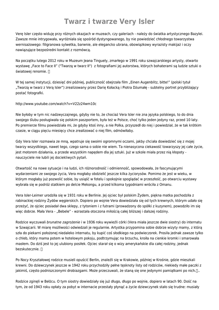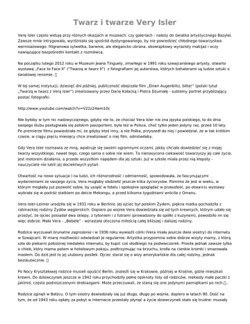 „Twarzą w twarz z Verą Isler”) zrealizowany przez Darię Kołacką i Piotra Dżumałę - subtelny portret przybliżający