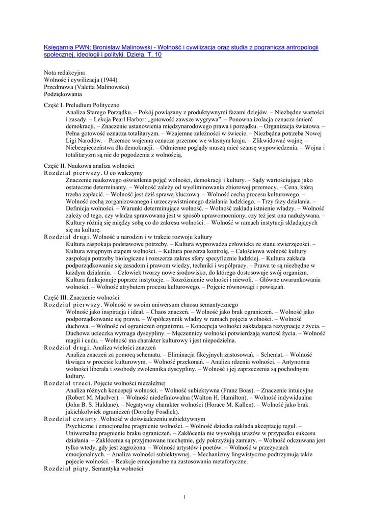 Księgarnia PWN: Bronisław Malinowski - Wolność i cywilizacja oraz studia z pogranicza antropologii społecznej, ideologii i polityki. Dzieła. T. 10 Nota redakcyjna Wolność i cywilizacja (1944) Przedmowa (Valetta Malinowska) Podziękowania Część I. Preludium Polityczne Analiza Starego Porządku. – Pokój powiązany z produktywnymi fazami dziejów. – Niezbędne wartości i zasady. – Lekcja Pearl Harbor: „gotowość zawsze wygrywa”. – Ponowna izolacja oznacza śmierć demokracji. – Znaczenie ustanowienia międzynarodowego prawa i porządku. – Organizacja światowa. – Pełna gotowość oznacza totalitaryzm. – Wzajemne zależności w świecie. – Niezbędna potrzeba Nowej Ligi Narodów. – Przemoc wojenna oznacza przemoc we własnym kraju. – Zlikwidować wojnę. – Niebezpieczeństwa dla demokracji. – Odmienne poglądy muszą mieć szansę wypowiedzenia. – Wojna i totalitaryzm są nie do pogodzenia z wolnością. Część II. Naukowa analiza wolności R o z d z i a ł p ie r w s z y. O co walczymy Znaczenie naukowego oświetlenia pojęć wolności, demokracji i kultury. – Sądy wartościujące jako ostateczne determinanty. – Wolność zależy od wyeliminowania zbiorowej przemocy. – Cena, którą trzeba zapłacić. – Wolność jest dziś sprawą kluczową. – Wolność cechą procesu kulturowego. – Wolność cechą zorganizowanego i urzeczywistnionego działania ludzkiego. – Trzy fazy działania. – Definicja wolności. – Warunki determinujące wolność. – Wolność zakłada istnienie władzy. – Wolność zależy od tego, czy władza sprawowana jest w sposób uprawomocniony, czy też jest ona nadużywana. – Kultury różnią się między sobą co do zakresu wolności. – Wolność w ramach instytucji składających się na kulturę. R o z d z i a ł d r u g i. Wolność u narodzin i w trakcie rozwoju kultury Kultura zaspokaja podstawowe potrzeby. – Kultura wyprowadza człowieka ze stanu zwierzęcości. – Kultura wstępnym etapem wolności. – Kultura poszerza kontrolę. – Całościowa wolność kultury zaspokaja potrzeby biologiczne i rozszerza zakres sfery specyficznie ludzkiej. – Kultura zakłada podporządkowanie się zasadom i prawom wiedzy, techniki i współpracy. – Prawa te są niezbędne w każdym działaniu. – Człowiek tworzy nowe środowisko, do którego dostosowuje swój organizm. – Kultura funkcjonuje poprzez instytucje. – Rozróżnienie wolności i niewoli. – Główne uwarunkowania wolności. – Wolność atrybutem procesu kulturowego. – Pojęcie równowagi i powiązań. Część III. Znaczenie wolności R o z d z i a ł p i e r w s z y . Wolność w swoim uniwersum chaosu semantycznego Wolność jako inspiracja i ideał. – Chaos znaczeń. – Wolność jako brak ograniczeń. – Wolność jako podporządkowanie się prawu. – Współczynnik władzy w ramach pojęcia wolności. – Wolność duchowa. – Wolność od ograniczeń organizmu. – Koncepcja wolności zakładająca rezygnację z życia. – Duchowa ucieczka wymaga dyscypliny. – Męczennicy wolności potwierdzają wartość życia. – Wolność magii i cudu. – Wolność ma charakter kulturowy i jest niepodzielna. R o z d z i a ł d r u g i. Analiza wielości znaczeń Analiza znaczeń za pomocą schematu. – Eliminacja fikcyjnych zastosowań. – Schemat. – Wolność tkwiąca w procesie kulturowym. – Wolność przekonań. – Analiza rdzenia wolności. – Antynomia wolności liberała i swobody zwolennika dyscypliny. – Wolność i jej zaprzeczenia są pochodnymi kultury. R o z d z i a ł t r z e c i . Pojęcie wolności niezależnej Analiza różnych koncepcji wolności. – Wolność subiektywna (Franz Boas). – Znaczenie intuicyjne (Robert M. MacIver). – Wolność niedefiniowalna (Walton H. Hamilton). – Wolność indywidualna (John B. S. Haldane). – Negatywny charakter wolności (Horace M. Kallen). – Wolność jako brak jakichkolwiek ograniczeń (Dorothy Fosdick). R o z d z i a ł c z w a r t y . Wolność w doświadczeniu subiektywnym Psychiczne i emocjonalne pragnienie wolności. – Wolność dziecka zakłada akceptację reguł. – Uniwersalne pragnienie braku ograniczeń. – Zakłócenia nie wywołują urazów w przypadku sukcesu działania. – Zakłócenia są przyjmowane niechętnie, gdy pokrzyżują zamiary. – Wolność odczuwana jest tylko wtedy, gdy jest zagrożona. – Wolność artystów i poetów. – Wolność w przeżyciach emocjonalnych. – Analiza wolności subiektywnej. – Mechanizmy lingwistyczne podtrzymują takie pojecie wolności. – Reakcje emocjonalne na zastosowania metaforyczne. R o z d z i a ł p ią ty. Semantyka wolności 1 Potrzeba precyzyjnej definicji. – Odrzucenie różnych zastosowań lingwistycznych. – Wolność marzeń, magii i mistycyzmu. – Podsumowanie analizy krytycznej. – Zwodniczość subiektywności. – Stany emocjonalne wyrażane w działaniach. – Myślenie na chybił trafił jako surowiec dla krystalizacji zamiaru. – Procesy myślowe wyrażające się w otwartym działaniu mogą być poddane analizie kulturowej. – Błędne koncepcje semantyczne. – Błędne przekonanie o nieograniczonym wyborze. – Wolność indywidualna. – Rzeczywiste ograniczenia wolności są zdeterminowane przez istotę kultury. – Ograniczenia o charakterze narodowym i kolektywnym. – Ograniczenia ze strony katastrof spowodowanych przez przyrodę. – Ograniczenia ze strony katastrof spowodowanych przez człowieka. – Walka o wolność. – Wolność musi istnieć we wszystkich trzech integralnych fazach działania. – Wolność zamiaru. – Wolność działania. – Wolność zaprzeczona przez kulturę. Część IV. Wolność jako dar kultury R o z d z i a ł p i e r w s z y . Wstępna faza wolności Przypomnienie założeń. – Wolność zwierzęca jako zaspokajanie potrzeb biologicznych. – Wolność zwierzęca ma te same trzy fazy, co wolność kulturowa. – 
