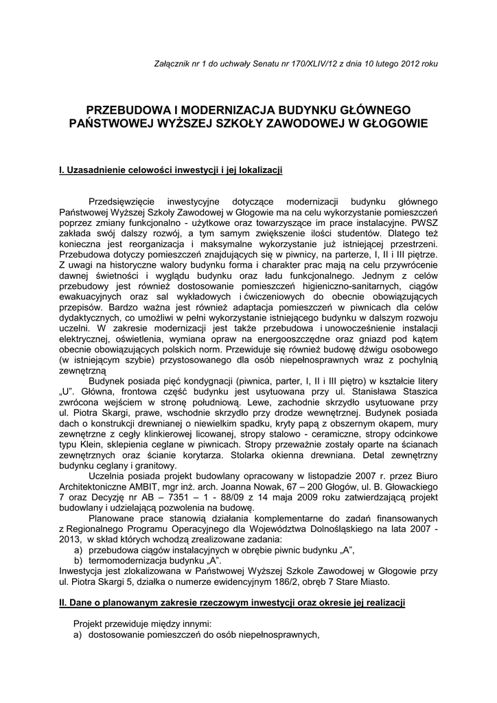 Załącznik nr 1 do uchwały Senatu nr 170/XLIV/12 z dnia 10 lutego 2012 roku PRZEBUDOWA I MODERNIZACJA BUDYNKU GŁÓWNEGO PAŃSTWOWEJ WYŻSZEJ SZKOŁY ZAWODOWEJ W GŁOGOWIE I. Uzasadnienie celowości inwestycji i jej lokalizacji Przedsięwzięcie inwestycyjne dotyczące modernizacji budynku głównego Państwowej Wyższej Szkoły Zawodowej w Głogowie ma na celu wykorzystanie pomieszczeń poprzez zmiany funkcjonalno - użytkowe oraz towarzyszące im prace instalacyjne. PWSZ zakłada swój dalszy rozwój, a tym samym zwiększenie ilości studentów. Dlatego też konieczna jest reorganizacja i maksymalne wykorzystanie już istniejącej przestrzeni. Przebudowa dotyczy pomieszczeń znajdujących się w piwnicy, na parterze, I, II i III piętrze. Z uwagi na historyczne walory budynku forma i charakter prac mają na celu przywrócenie dawnej świetności i wyglądu budynku oraz ładu funkcjonalnego. Jednym z celów przebudowy jest również dostosowanie pomieszczeń higieniczno-sanitarnych, ciągów ewakuacyjnych oraz sal wykładowych i ćwiczeniowych do obecnie obowiązujących przepisów. Bardzo ważna jest również adaptacja pomieszczeń w piwnicach dla celów dydaktycznych, co umożliwi w pełni wykorzystanie istniejącego budynku w dalszym rozwoju uczelni. W zakresie modernizacji jest także przebudowa i unowocześnienie instalacji elektrycznej, oświetlenia, wymiana opraw na energooszczędne oraz gniazd pod kątem obecnie obowiązujących polskich norm. Przewiduje się również budowę dźwigu osobowego (w istniejącym szybie) przystosowanego dla osób niepełnosprawnych wraz z pochylnią zewnętrzną Budynek posiada pięć kondygnacji (piwnica, parter, I, II i III piętro) w kształcie litery „U”. Główna, frontowa część budynku jest usytuowana przy ul. Stanisława Staszica zwrócona wejściem w stronę południową. Lewe, zachodnie skrzydło usytuowane przy ul. Piotra Skargi, prawe, wschodnie skrzydło przy drodze wewnętrznej. Budynek posiada dach o konstrukcji drewnianej o niewielkim spadku, kryty papą z obszernym okapem, mury zewnętrzne z cegły klinkierowej licowanej, stropy stalowo - ceramiczne, stropy odcinkowe typu Klein, sklepienia ceglane w piwnicach. Stropy przeważnie zostały oparte na ścianach zewnętrznych oraz ścianie korytarza. Stolarka okienna drewniana. Detal zewnętrzny budynku ceglany i granitowy. Uczelnia posiada projekt budowlany opracowany w listopadzie 2007 r. przez Biuro Architektoniczne AMBIT, mgr inż. arch. Joanna Nowak, 67 – 200 Głogów, ul. B. Głowackiego 7 oraz Decyzję nr AB – 7351 – 1 - 88/09 z 14 maja 2009 roku zatwierdzającą projekt budowlany i udzielającą pozwolenia na budowę. Planowane prace stanowią działania komplementarne do zadań finansowanych z Regionalnego Programu Operacyjnego dla Województwa Dolnośląskiego na lata 2007 2013, w skład których wchodzą zrealizowane zadania: a) przebudowa ciągów instalacyjnych w obrębie piwnic budynku „A”, b) termomodernizacja budynku „A”. Inwestycja jest zlokalizowana w Państwowej Wyższej Szkole Zawodowej w Głogowie przy ul. Piotra Skargi 5, działka o numerze ewidencyjnym 186/2, obręb 7 Stare Miasto. II. Dane o planowanym zakresie rzeczowym inwestycji oraz okresie jej realizacji Projekt przewiduje między innymi: a) dostosowanie pomieszczeń do osób niepełnosprawnych, b) c) d) e) f) modernizację instalacji elektrycznej oraz montaż nowych opraw oświetleniowych, montaż instalacji alarmowej, modernizację instalacji wodno-kanalizacyjnej, modernizację pomieszczeń sanitarnych, odnowienie istniejących posadzek oraz częściowe odtworzenie brakujących powierzchni, g) odrestaurowanie istniejącego lastryko, h) zamurowanie niektórych otworów drzwiowych, wyburzenie ścianek działowych, i) wymianę stolarki drzwiowej oraz odrestaurowanie drzwi wahadłowych, j) tynkowanie, uzupełnienie ubytków w tynku, gruntowanie ścian i sufitów oraz malowanie, k) aranżację, poprawę wyglądu korytarzy, szpachlowanie, gruntowanie i malowanie ze zmianą kolorystyki, l) montaż instalacji oświetlenia ewakuacyjnego, m) montaż cokołów, n) cyklinowanie i lakierowanie parkietów, o) montaż dźwigu osobowego w istniejącym szybie windowym. Planowany okres realizacji inwestycji: od stycznia 2013 do grudnia 2013. Prace można wykonywać w trakcie roku akademickiego ze względu na to, że większość pomieszczeń przeznaczonych do modernizacji stanowią pomieszczenia obecnie nienadające się do użytku. Pomieszczenia są bardzo zniszczone i następująca ich degradacja doprowadzi do konieczności wydatkowania coraz to większych kwot na ich modernizację i zagospodarowanie. Działania podjęte niezwłocznie pozwolą na dostosowanie ich do obowiązujących norm, standardów i przepisów (budowlanych, bhp, p.poż. oraz sanitarnych zgodnie z aktualnymi posiadanymi i zatwierdzonymi ekspertyzami). Ww. działania pozwolą na powiększenie bazy dydaktycznej uczelni. III. Ocena efektywności inwestycji, w tym ekonomicznej efektywności. Realizacja opisanego w programie inwestycyjnym zadania dzięki pozyskaniu sal dydaktycznych pozwoli na bardziej racjonalne planowanie zajęć dydaktycznych i tym samym zmniejszenie kosztów. W związku z zagospodarowaniem niewykorzystanych pomieszczeń zwiększy się również potencjał umożliwiający dalszy rozwój uczelni na bazie posiadanych nieruchomości, a także zostaną osiągnięte wymagane standardy. Wszystkie działania związane z modernizacją budynku A mają na celu powstrzymanie degradacji istniejących pomieszczeń i braku konieczności rozbudowy lub wynajmowania pomieszczeń od innych podmiotów w sytuacji dalszego planowanego rozwoju PWSZ w Głogowie. IV. Dane o planowanych efektach rzeczowych inwestycji W efekcie wykonanych prac zostanie wyremontowanych około 2497, 88 m² powierzchni użytkowej budynku (w tym obecnie nieużytkowane pomieszczenia w piwnicy o powierzchni użytkowej ok. 1039, 20 m²) o łącznej kubaturze 9.474,