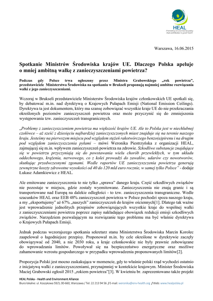 Warszawa, 16.06.2015 Spotkanie Ministrów Środowiska krajów UE. Dlaczego Polska apeluje o mniej ambitną walkę z zanieczyszczeniami powietrza? Podczas gdy Polsce trwa ogłoszony przez Ministra Grabowskiego „rok powietrza”, przedstawiciele Ministerstwa Środowiska na spotkaniu w Brukseli proponują najmniej ambitne rozwiązania walki z jego zanieczyszczeniami. Wczoraj w Brukseli przedstawiciele Ministerstw Środowiska krajów członkowskich UE spotkali się, by debatować m.in. nad dyrektywą o Krajowych Pułapach Emisji (National Emission Ceilings). Dyrektywa ta jest dokumentem, który ma szansę zobowiązać wszystkie kraje UE do nie przekraczania określonych poziomów zanieczyszczeń powietrza oraz może przyczynić się do zmniejszenia występowania tzw. zanieczyszczeń transgranicznych. „Problemy z zanieczyszczeniem powietrza ma większość krajów UE. Ale to Polska jest w niechlubnej czołówce – aż sześć z dziesięciu najbardziej zanieczyszczonych miast znajduje się na terenie naszego kraju. Jesteśmy na pierwszym miejscu pod względem stężeń rakotwórczego benzo(a)pirenu i na drugim pod względem zanieczyszczenia pyłami – mówi Weronika Piestrzyńska z organizacji HEAL, zajmującej się m.in. wpływem zanieczyszczeń powietrza na zdrowie. Szkodliwe substancje znajdujące się w powietrzu przyczyniają się do powstawania wielu chorób przewlekłych, w tym układu oddechowego, krążenia, nerwowego, co z kolei prowadzi do zawałów, udarów czy nowotworów, skutkując przedwczesnymi zgonami. Wedle raportów UE zanieczyszczenia powietrza generują zewnętrzne koszty zdrowotne wysokości od 40 do 120 mld euro rocznie, w samej tylko Polsce” - dodaje Łukasz Adamkiewicz z HEAL. Ale emitowane zanieczyszczenia to nie tylko „sprawa” danego kraju. Część szkodliwych związków nie pozostaje w miejscu, gdzie zostały wyemitowane. Zanieczyszczenia nie znają granic i są transportowane nad Europą na dalekie odległości - to tzw. zanieczyszczenia transgraniczne. Wedle szacunków HEAL oraz EEB 48% zanieczyszczeń powietrza w Polsce pochodzi spoza naszego kraju, a my „eksportujemy” aż 67% „naszych” zanieczyszczeń do krajów ościennych[1]. Dlatego tak ważne jest wprowadzenie jednolitych przepisów zobowiązujących wszystkie kraje do wspólnej walki z zanieczyszczeniami powietrza poprzez zapisy nakładające obowiązek redukcji emisji szkodliwych związków. Narzędziem pozwalającym na rozwiązanie tego problemu ma być właśnie dyrektywa o Krajowych Pułapach Emisji. Jednak podczas wczorajszego spotkania sekretarz stanu Ministerstwa Środowiska Marcin Korolec zaapelował o łagodniejsze przepisy. Proponował m.in. by cele określone w dyrektywie zaczęły obowiązywać od 2040, a nie 2030 roku, a kraje członkowskie nie były prawnie zobowiązane do wprowadzania limitów. Powoływał się na bezpieczeństwo energetyczne oraz możliwe zahamowanie wzrostu gospodarczego w przypadku wprowadzenia proponowanych limitów[2]. Propozycja Polski jest mocno zaskakująca w momencie, gdy to właśnie polski rząd wychodzi ostatnio z inicjatywą walki z zanieczyszczeniami, przynajmniej w kontekście krajowym. Minister Środowiska Maciej Grabowski ogłosił 2015 „rokiem powietrza”[3]. W kwietniu br. zaprezentowano także projekt HEAL Polska - Health and Environment Alliance Biuro lokalne: ul. Koszykowa 59/3, 00-660, Warszawa / Tel: 22 213 94 56 / E-mail: [email protected] / Web: www.healpolska.pl Krajowego Programu Ochrony Powietrza, wedle którego zmniejszenie emisji zanieczyszczeń nie wpływa negatywnie na wzrost gospodarczy[4]. Polska była – obok Rumunii - jednym z dwóch krajów, który podczas wczorajszego spotkania apelował o mniej ambitne zapisy dyrektywy i zniesienie zapisu o obowiązujących limitach emisji. Podczas gdy trwają negocjacje nad ustaleniem deklarowanych limitów emisji zanieczyszczeń dla krajów UE, każdego roku zanieczyszczenia powietrza powodują 430 tys. przedwczesnych zgonów w Europie, w tym ponad 40 tys. w Polsce[5]. Wedle Światowej Organizacji Zdrowia stanowią one największe środowiskowe zagrożenie zdrowia publicznego współcześnie żyjących ludzi. Kontakt: Weronika Piestrzyńska, HEAL [email protected] + 48 782 466 881 O HEAL: Health and Environment Alliance jest wiodącą europejską organizacją typu non-profit analizującą wpływ środowiska na zdrowie obywateli Unii Europejskiej. Przy wsparciu ponad 70 organizacji członkowskich uczestniczy w różnorodnych procesach decyzyjnych, przedstawiając niezależne ekspertyzy i dowody naukowe opracowane przez podmioty zajmujące się ochroną zdrowia. Członkowie HEAL to międzynarodowe i europejskie organizacje, a także grupy krajowe i lokalne z 25 krajów – zarówno w państwach członkowskich UE, jak i szerszym regionie europejskim, zgodnie z definicją Światowej Organizacji Zdrowia. Linki: [1] Infografika Health and Environment Alliance [HEAL] i European Environmental Bureau [EEB] http://healpolska.pl/wp-content/uploads/2015/06/Zanieczyszczenia-transgraniczne-infografika.png [2] Link do wystąpienia Sekretarza Stanu w Ministerstwie Środowiska, Marcina Korolca w dn. 15.06.2015 [1.09.00] http://video.consilium.europa.eu/webcast.aspx?ticket=775-979-15909 [3]https://www.premier.gov.pl/blog/maciej-h-grabowski/2015-rokiem-powietrza.html [4] Dotyczy lat 1988-2013, projekt Krajowego Programu Ochrony Powietrza, Ministerstwo Środowiska, 2015, s. 18 https://www.mos.gov.pl/g2/big/2015_03/a3c37385dab33035ed9b1c3d6a32c391.pdf [5] Cost-benefit Analysis of Final Policy Scenarios for the EU Clean Air Package HEAL Polska - Health and Environment Alliance Biuro lokalne: ul. Koszykowa 59/3, 00-660, Warszawa / Tel: 22 213 94 56 / E-mail: [email protected] / Web: www.healpolska.pl
