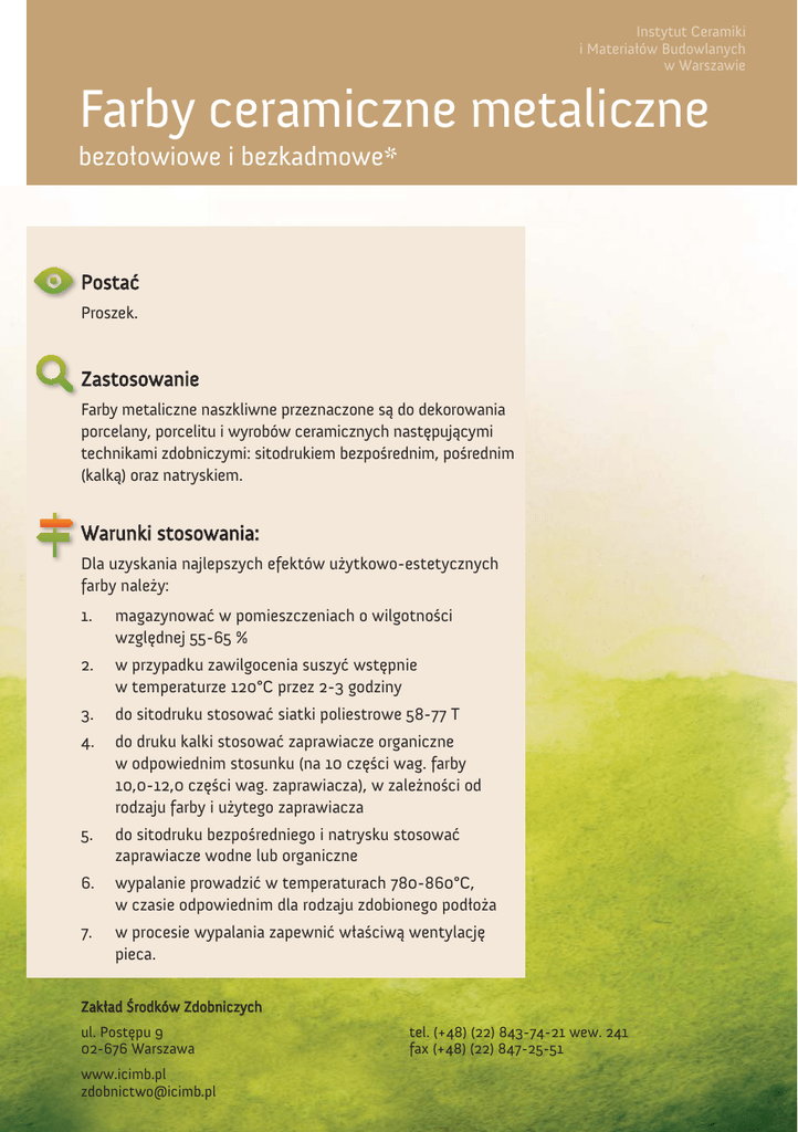 Instytut Ceramiki i Materiałów Budowlanych w Warszawie Farby ceramiczne metaliczne bezołowiowe i bezkadmowe* Postać Proszek. Zastosowanie Farby metaliczne naszkliwne przeznaczone są do dekorowania porcelany, porcelitu i wyrobów ceramicznych następującymi technikami zdobniczymi: sitodrukiem bezpośrednim, pośrednim (kalką) oraz natryskiem. Warunki stosowania: Dla uzyskania najlepszych efektów użytkowo-estetycznych farby należy: 1. magazynować w pomieszczeniach o wilgotności względnej 55-65 % 2. w przypadku zawilgocenia suszyć wstępnie w temperaturze 120°C przez 2-3 godziny 3. do sitodruku stosować siatki poliestrowe 58-77 T 4. do druku kalki stosować zaprawiacze organiczne w odpowiednim stosunku (na 10 części wag. farby 10,0-12,0 części wag. zaprawiacza), w zależności od rodzaju farby i użytego zaprawiacza 5. do sitodruku bezpośredniego i natrysku stosować zaprawiacze wodne lub organiczne 6. wypalanie prowadzić w temperaturach 780-860°C, w czasie odpowiednim dla rodzaju zdobionego podłoża 7. w procesie wypalania zapewnić właściwą wentylację pieca. Zakład Środków Zdobniczych ul. Postępu 9 02-676 Warszawa www.icimb.pl [email protected] tel. (+48) (22) 843-74-21 wew. 241 fax (+48) (22) 847-25-51 Farby ceramiczne metaliczne bezołowiowe i bezkadmowe* 8M-G110 8M-G30 8M-G40 8M-G60 8M-G100 8M-G80 8M-G70 8M-G90 8M-B10 8M-B20 8M-N20 8M-T10 8M-Z10 8M-Z20 8M-Z3 8M-P10 8M-S20 * na wszystkich farbach jest widoczny efekt metaliczny Kolor farby Symbol miedziany miedziany miedziany miedziany srebrny złoty beżowy zielono-złoty turkusowo-srebrny złoty jasny złoty stary żółto złoty zielono- złoty niebiesko- srebrny niebiesko- srebrny zielono-srebrny niebiesko-srebrny 8M-G90 8M-G70 8M-G100 8M-G80 8M-S20 8M-G60 8M-B10 8M-Z20 8M-T10 8M-G30 8M-G40 8M-G110 8M-Z30 8M-N30 8M-N40 8M-Z50 8M-N20 Przedstawione, przykładowe barwy mają jedynie charakter orientacyjny. Ich odwzorowanie zależne jest od zastosowanego monitora lub drukarki. O kolorystyce dekoracji decyduje temperatura wypalania, atmosfera w piecu i rodzaj podłoża, na które jest naniesiona. BZ-18