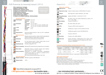 CF113 PUR 10 x d PVC iguPUR PUR TPE PUR Przewody do transmisji danych | CF113 z Do największych obciążeń z Płaszcz zewnętrzny z PUR z Ekranowany, skręcany parami z Odporny na działanie oleju i chłodziwa z Wytrzymały na nacięcia z Nie zawiera PVC i halogenów z Nie podtrzymujący palenia z Odporny na działanie hydrolizy i drobnoustrojów Struktura przewodu Żyła Izolacja żyły Skręt żyły Oznakowanie żyły niskie samonośnie brak 1 2 3 4 5 6 7 1 2 3 4 5 6 7 1 2 3 4 najwyższe najwyższe 400 m + Odporność na oleje Odporny na oleje (w oparciu o DIN EN 50363-10-2), klasa 3 Offshore MUD-odporność w oparciu o NEK 606 – stan z 2009 Nie podtrzymujący palenia Bez silikonu Zgodnie z IEC 60332-1-2, CEI 20-35, FT1, VW-1 Bez halogenu UL/CSA Styl 10493 i 20233, 300 V, 80°C NFPA W oparciu o NFPA 79-2012 rozdział 12.9 EAC Certyfikowany w oparciu o TC RU C-DE.ME77.B.01254 CTP Certyfikowany zgodnie z normą C-DE.PB49.B.00416 CEI W oparciu o CEI 20-35 Specjalny przewód wykonany z bardzo cienkich niepowlekanych drucików miedzianych, bardzo odporny na zginanie. Mechanicznie wysokowartościowa mieszanka TPE. Bez ołowiu W oparciu o 2011/65/EC (RoHS-II) Clean room Po 2 żyły skręcone parami z krótkim skokiem skrętu, pary żył również skręcone z krótkim skokiem skrętu. Kod koloru według DIN 47100. CE Zgodnie z ISO-Klasą 1. Materiał płaszcza zewn. zgodny z CF77. UL.05.12.D, sprawdzony przez IPA według normy ISO 14644-1 W oparciu o 2006/95/EC min. 10 x d min. 8 x d min. 5 x d -25 °C do +80 °C -40 °C do +80 °C (w oparciu o EN 60811-504) -50 °C do +80 °C (w oparciu o DIN EN 50305) 10 m/s 5 m/s Samonośne długości przesuwu i maks. do 100 m w aplikacjach ślizgowych, Klasa 5 CF113 PUR 10 x d Właściwości i certyfikaty Odporność UV Wysoka Bez silikonu, który może zakłócić lakierowanie (w oparciu o PV 3.10.7 – stan z 1992). W oparciu o EN 50267-2-1 Informacje dynamiczne Promień gięcia e-prowadnik elastyczne stałe Temperatura e-prowadnik elastyczne stałe v maks. samonośne ślizgowe a maks. 80 m/s2 Droga przesuwu Ta seria zostanie zastąpiona przez CF211.PUR! Klasa 6.5.3 Wymagania Droga przesuwu Odporność na olej Gwarantowana żywotność zgodnie z warunkami gwarancji (str. 22-25) Płaszcz wewnętrzny Mieszanka PUR, dopasowana do wymagań pracy w e-prowadniku. Ekstremalnie odporny na zginanie cynowany splot miedziany. Gęstość liniowa ok. 70%, optyczna ok. 90%. Płaszcz zewnętrzny Dopasowana do wymagań e-prowadnika, niskoadhezyjna mieszanka silnie odporna na ścieranie na podstawie PUR (w oparciu o DIN VDE 0282 część 10). Kolor: Szary antracytowy (porównywalny z RAL 7016) Informacje elektryczne Napięcie nominalne 300/300 V (w oparciu o DIN VDE 0245) Ekran całości M z p odel rod wy ukc cofy wa ji ny Ilustracja przykładowa. Napięcie próbne 1500 V Pobierz EPLAN, konfigurator Podwójne cykle* 5 milionów 7,5 miliona 10 milionów v maks. [m/s] Temperatura, od/do [°C] samonośne ślizgowe a maks. Droga przesuwu [m/s2] [m] 80 ≤ 100 -25 / -15 -15 / +70 +70 / +80 10 5 R min. R min. R min. [Faktor x d] [Faktor x d] [Faktor x d] 12,5 13,5 10 11 14,5 12 12,5 13,5 14,5 * Możliwa większa liczba podwójnych cykli ruchu – proszę zapytać o indywidualne obliczenia. Typowy zakres zastosowania z Do największych obciążeń z Prawie nieograniczona olejoodporność z Zastosowanie wewnątrz i na zewnątrz ze średnim promieniowaniem UV z Samonośne drogi przesuwów i do 100 m w aplikacjach ślizgowych z Centra obróbcze/obrabiarki, Urządzenia do obsługi regałów wysokiego składowania, Przemysł pakujący, systemy szybkiej manipulacji, sektor chłodniczy www.igus.pl/CF113 1 040 typów prosto z magazynu bez kosztów cięcia. ... (do 10 cięć tego samego typu) ... bez minimalnej ilości zamówienia ... igus® Sp. z o. o. Polska | tel: 22 863 57 70 faks: 22 863 61 69 | [email protected] | www.chainflex.pl 157 CF113 PUR 10 x d PVC iguPUR PUR TPE PUR Przewody do transmisji danych | CF113 Klasa 6.5.3 Wymagania Droga przesuwu Odporność na olej niskie samonośnie brak 1 2 3 4 5 6 7 1 2 3 4 5 6 7 1 2 3 4 najwyższe najwyższe 400 m + CF113 PUR 10 x d Ta seria zostanie zastąpiona przez CF211.PUR! Ilustracja przykładowa. Program dostaw Nr art. CF113.02.02.02 2) 11) CF113.02.03.02 11) CF113.02.04.02 11) CF113.02.05.02 11) CF113.02.06.02 11) CF113.02.08.02 11) CF113.02.14.02 11) CF113.05.02.02 2) 11) CF113.05.03.02 11) CF113.05.04.02 11) CF113.05.05.02 1.6) 11) CF113.05.06.02 11) Ilość żył i przekrój nominalny żył [mm²] (4 x 0,25)C (3 x (2 x 0,25))C (4 x (2 x 0,25))C (5 x (2 x 0,25))C (6 x (2 x 0,25))C (8 x (2 x 0,25))C (14 x (2 x 0,25))C (4 x 0,5)C (3 x (2 x 0,5))C (4 x (2 x 0,5))C (5 x (2 x 0,5))C (6 x (2 x 0,5))C Średnica zewnętrzna maks. [mm] Indeks miedziowy [kg/km] Ciężar [kg/km] 27 44 49 62 68 81 125 55 68 77 92 105 88 100 112 131 144 183 249 132 148 169 194 217 7,5 8,5 9,0 9,5 10,0 11,5 13,5 8,5 10,5 11,0 12,0 12,5 PLN/m 21,60 28,25 34,15 39,80 43,35 54,15 76,85 26,60 31,15 39,45 45,75 53,05 Przykład zamówienia: CF113.02.06.02 – W wymaganej długości (co 0,5 m) CF113 chainflex® Serie .02 Nominalny przekrój żyły .06 Ilość par .02 oznakowanie par zł Zamów Online www.chainflex.pl/CF113 Czas dostawy 24 godz. lub dziś Czas dostawy oznacza czas do momentu wysyłki towaru 1.6) Czas dostawy: 6 tygodni 11) Model wycofywany z produkcji (alternatywa: CF211.PUR) Żyły przewodów chainflex® oznaczonych 2) ułożone są w czwórkę gwiazdową. Wskazówka: Podane średnice zewnętrzne są wartościami maksymalnymi i w rzeczywistości mogą mieć niższe wartości. G= z żyłą uziemiającą żółto-zieloną x= bez żyły uziemiającej Pobierz EPLAN, konfigurator www.igus.pl/CF113 1 040 typów prosto z magazynu bez kosztów cięcia. ... 158 (do 10 cięć tego samego typu) ... bez minimalnej ilości zamówienia ... igus® Sp. z o. o. Polska | tel: 22 863 57 70 faks: 22 863 61 69 | [email protected] | www.chainflex.pl 159