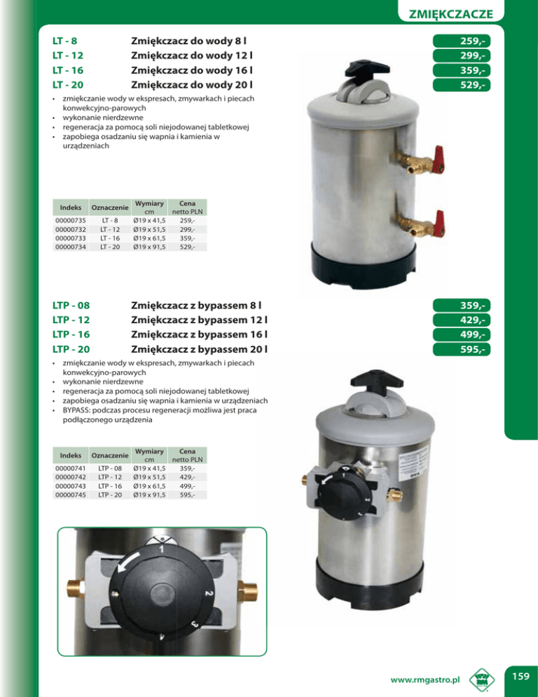 ZMIĘKCZACZE LT - 8 LT - 12 LT - 16 LT - 20 Zmiękczacz do wody 8 l Zmiękczacz do wody 12 l Zmiękczacz do wody 16 l Zmiękczacz do wody 20 l 259,299,359,529,- • zmiękczanie wody w ekspresach, zmywarkach i piecach konwekcyjno-parowych • wykonanie nierdzewne • regeneracja za pomocą soli niejodowanej tabletkowej • zapobiega osadzaniu się wapnia i kamienia w urządzeniach Indeks Oznaczenie 00000735 00000732 00000733 00000734 LT - 8 LT - 12 LT - 16 LT - 20 LTP - 08 LTP - 12 LTP - 16 LTP - 20 Wymiary Cena cm netto PLN Ø19 x 41,5 259,Ø19 x 51,5 299,Ø19 x 61,5 359,Ø19 x 91,5 529,- Zmiękczacz z bypassem 8 l Zmiękczacz z bypassem 12 l Zmiękczacz z bypassem 16 l Zmiękczacz z bypassem 20 0l 359,429,499,595,595, • zmiękczanie wody w ekspresach, zmywarkach i piecach konwekcyjno-parowych • wykonanie nierdzewne • regeneracja za pomocą soli niejodowanej tabletkowej • zapobiega osadzaniu się wapnia i kamienia w urządzeniach ach • BYPASS: podczas procesu regeneracji możliwa jest praca podłączonego urządzenia Indeks Oznaczenie 00000741 00000742 00000743 00000745 LTP - 08 LTP - 12 LTP - 16 LTP - 20 Wymiary Cena cm netto PLN Ø19 x 41,5 359,Ø19 x 51,5 429,Ø19 x 61,5 499,Ø19 x 91,5 595,- www.rmgastro.pl 159 ZMIĘKCZACZE Junior Grafit • • • • Zmiękczacz półautomatyczny 799,- skuteczna ochrona przed osadami kamienia znaczne zredukowanie środka myjącego mniejsze koszty użycia energii idealny do zmywarek, pieców konw.-parowych, ekspresów do kawy, kostkarek do lodu Zasilanie el. Moc Cena V/Hz kW netto PLN 00000751 Junior Grafit 230 V / 50 Hz 0,8 799,Indeks Oznaczenie Dane techniczne: ilość uzdatnionej wody w trakcie godziny regeneracji [litry]* 1500 zużycie soli [kg] 1 natężenie przepływu [l/min] 0-30 ciśnienie robocze [bar] 1,5 - 6,0 czas regeneracji [min] 66 średnica przyłącza [cal] 3/4 temperatura maksymalna wody [°C] 20 zbiornik soli [kg] 10 *przy twardości wody 10 °d A-8 Zmiękczacz automatyczny • zmiękczanie wody w ekspresach, zmywarkach i piecach konwekcyjno-parowych • zapobiega osadzaniu się wapnia i kamienia w urządzeniach • regeneracja za pomocą soli niejodowanej tabletkowej • regeneracja odbywa się automatycznie w zaprogramowane dni o ustawionej godzinie • pojemnik na 10 kg soli 160 Indeks Oznaczenie 00007455 A-8 Wymiary Cena cm netto PLN 22,5 x 43,5 x 55 890,- www.rmgastro.pl 890,- ZMIĘKCZACZE ISI 8 ISI 12 Zmiękczacz automatyczny 8 l Zmiękczacz automatyczny 12 l 1 950,2 270,- • zmiękczanie wody w ekspresach, zmywarkach i piecach konwekcyjno-parowych • zapobiega osadzaniu się wapnia i kamienia w urządzeniach • wewnętrzny zbiornik wykonany ze stali nierdzewnej • elektromechaniczna jednostka sterująca • ustawianie regeneracji na dni tygodnia • możliwość codziennej regeneracji • maksymalny, zalecany przepływ 800 l/h • regeneracja za pomocą soli niejodowanej tabletkowej • przyłącze 3/4” z wewnętrzym gwintem detal przyłączy detal panela sterującego Indeks Oznaczenie 00008735 00008736 ISI 8 ISI 12 Wymiary Zasilanie el. Moc Cena cm V/Hz kW netto PLN 24,5 x 45 x 44 230 V / 50 Hz 0,06 1 950,28,5 x 40 x 55 230 V / 50 Hz 0,06 2 270,- Temperatura doprowadzonej wody 8 - 25 °C, ciśnienie 2 - 8 bar. Twardość wody wyrażana jest najczęściej w następujących jednostkach: °f - stopnie francuskie °d - stopnie niemieckie mmol/l - ilość jonów wapnia w litrze wody Ilość zmiękczanej wody w zależności od jej twardości (°f) Tw [°f ] Tw [°d] Tw [mmol/l] 20° 11° 2 30° 16,5° 3 40° 22° 4 60° 33° 4 80° 44° 8 ISI 8 1 680 l 1120 l 840 l 672 l 560 l ISI 12 2 520 l 1 680 l 1 260 l 1 008 l 840 l Model żywica [l] sól/regen. [kg] pojemność [l] ISI 8 5,6 1 8 ISI 12 8,5 1,5 12 Przelicznik stopni twardości wody: 1 °d = 1,79 °f www.rmgastro.pl 161 ZMIĘKCZACZE Purity 450 Steam System filtracyjny 1 869,- • wkład wymienny do Purity 450 Steam Indeks Oznaczenie Opis 00008737 Purity 450 Steam 00008738 W - 450 S Purity Pc 300 komplet wkład Wymiary cm Ø25 x 41 Cena netto PLN 1 869,405,- System filtracyjny Brita Purity C300 624,- • wkład wymienny do systemu filtracyjnego Purity Pc 300 głowica Indeks Oznaczenie Opis 00006004 Purity Pc 300 00006006 G - Pc 300 00006005 W - Pc 300 ELP 162 wkład komplet = głowica + wkład głowica wkład Wymiary cm 12,3 x 12 x 47,6 Elektroniczny licznik przepływu Indeks Oznaczenie 00006007 ELP Cena netto PLN 624,145,479,- 199,- Cena netto PLN 199,- Żywica do LT, LTP - 1 litr 14,- Sól tabletkowa - op. 25 kg 35,- www.rmgastro.pl ZMIĘKCZACZE ASZ • • • • • • • • • • • • • Automatyczna stacja zmiękczania wody 2 990,- nowoczesny kompaktowy wygląd całkowicie zautomatyzowana praca wysoka jakość i niezawodność niskie koszty eksploatacyjne (mniejsze zużycie soli i wody do regeneracji) wysoko wydajne złoże zmiękczające ? podczas regeneracji można korzystać z twardej wody wykonany z mocnego tworzywa – odporny na korozje elektroniczne, objętościowe sterowanie kontrola stanu, historia oraz diagnostyka pracy urządzenia na wyświetlaczu LCD możliwość regulacji twardości wody zmiękczonej w standardzie wyposażony w zawór by-pass, obejście urządzenia np. na czas przeglądu blokada klawiatury podtrzymanie pamięci, w przypadku braku prądu Indeks Oznaczenie 00008739 ASZ Wymiary Cena cm netto PLN 31 x 36 x 133 2 990,- Dane techniczne: maksymalne natężenie przepływu 60,00 litrów/min wydajność przy twardości 100dh 5,3 m³ wydajność przy twardości 150dh 3,8 m³ wydajność przy twardości 200dh 2,6 m³ pojemność zbiornika soli 50 kg maksymalny spadek ciśnienia 0,5 bar średnica przyłącza 1”, 3/4”, 1/2” zasilanie elektryczne 230 V / 50 Hz ciśnienie, wymagane/ dopuszczane 1.4/8,6 bar temperatura dopuszczalna 5-39°C Profesjonalny automatyczny zmiękczacz wody przeznaczony do zasilania całej kuchni oraz małej lub średniej restauracji. Skutecznie usuwa związki wapnia i magnezu z wody, których obec