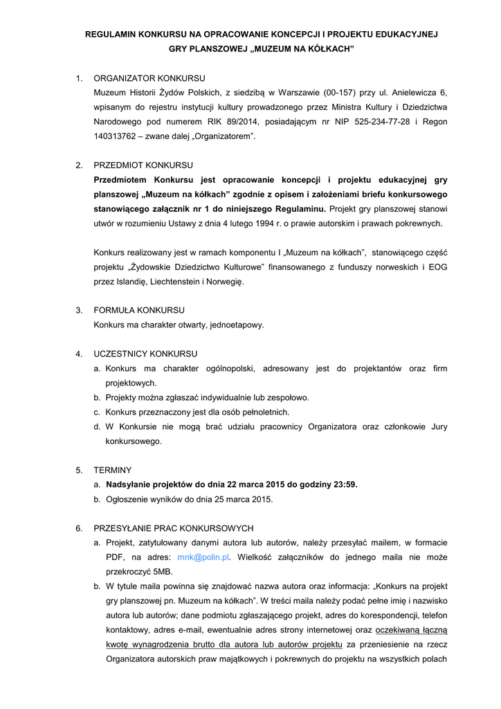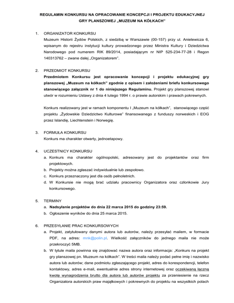 REGULAMIN KONKURSU NA OPRACOWANIE KONCEPCJI I PROJEKTU EDUKACYJNEJ GRY PLANSZOWEJ „MUZEUM NA KÓŁKACH” 1. ORGANIZATOR KONKURSU Muzeum Historii Żydów Polskich, z siedzibą w Warszawie (00-157) przy ul. Anielewicza 6, wpisanym do rejestru instytucji kultury prowadzonego przez Ministra Kultury i Dziedzictwa Narodowego pod numerem RIK 89/2014, posiadającym nr NIP 525-234-77-28 i Regon 140313762 – zwane dalej „Organizatorem”. 2. PRZEDMIOT KONKURSU Przedmiotem Konkursu jest opracowanie koncepcji i projektu edukacyjnej gry planszowej „Muzeum na kółkach” zgodnie z opisem i założeniami briefu konkursowego stanowiącego załącznik nr 1 do niniejszego Regulaminu. Projekt gry planszowej stanowi utwór w rozumieniu Ustawy z dnia 4 lutego 1994 r. o prawie autorskim i prawach pokrewnych. Konkurs realizowany jest w ramach komponentu I „Muzeum na kółkach”, stanowiącego część projektu „Żydowskie Dziedzictwo Kulturowe” finansowanego z funduszy norweskich i EOG przez Islandię, Liechtenstein i Norwegię. 3. FORMUŁA KONKURSU Konkurs ma charakter otwarty, jednoetapowy. 4. UCZESTNICY KONKURSU a. Konkurs ma charakter ogólnopolski, adresowany jest do projektantów oraz firm projektowych. b. Projekty można zgłaszać indywidualnie lub zespołowo. c. Konkurs przeznaczony jest dla osób pełnoletnich. d. W Konkursie nie mogą brać udziału pracownicy Organizatora oraz członkowie Jury konkursowego. 5. TERMINY a. Nadsyłanie projektów do dnia 22 marca 2015 do godziny 23:59. b. Ogłoszenie wyników do dnia 25 marca 2015. 6. PRZESYŁANIE PRAC KONKURSOWYCH a. Projekt, zatytułowany danymi autora lub autorów, należy przesyłać mailem, w formacie PDF, na adres: [email protected]. Wielkość załączników do jednego maila nie może przekroczyć 5MB. b. W tytule maila powinna się znajdować nazwa autora oraz informacja: „Konkurs na projekt gry planszowej pn. Muzeum na kółkach”. W treści maila należy podać pełne imię i nazwisko autora lub autorów; dane podmiotu zgłaszającego projekt, adres do korespondencji, telefon kontaktowy, adres e-mail, ewentualnie adres strony internetowej oraz oczekiwaną łączną kwotę wynagrodzenia brutto dla autora lub autorów projektu za przeniesienie na rzecz Organizatora autorskich praw majątkowych i pokrewnych do projektu na wszystkich polach eksploatacji wskazanych z pkt 12 Regulaminu oraz za uszczegółowienie projektu wykonawczego. 7. FORMA ZGŁOSZENIA Zgłoszenie do Konkursu składa się z przesłanych plików w formacie PDF: a. projektu graficznego gry i opakowania gry; b. zasad gry; c. tekstu wyjaśniającego inspirację autora lub autorów gry; d. specyfikacji technicznej gry; e. projektu wykonawczego gry; f. szacunkowej kalkulacji kosztów wykonania 100 egzemplarzy gry. 8. KRYTERIA OCENY PROJEKTÓW: Prace oceniane będą zgodnie z następującymi kryteriami: 1) oryginalne wzornictwo, walory estetyczne – maksymalnie 30 punktów; 2) powiązanie koncepcji gry ze specyfiką projektu „Muzeum na kółkach” poprzez twórcze odniesienie do nazwy projektu oraz nieschematyczną interpretację jego tematyki i elementów – maksymalnie 20 punktów; 3) oryginalna koncepcja gry (niepowielająca innych gier) i jej grywalność (np. liczba graczy; interakcja pomiędzy graczami; przewidywana długości rozgrywki, zmienność poziomu trudności gry) – maksymalnie 20 punktów; 4) wysokość wynagrodzenia za przeniesienie autorskich praw majątkowych oraz za uszczegółowienie projektu wykonawczego – maksymalnie 15 punktów, punkty za niniejsze kryterium zostaną przyznane zgodnie ze wzorem: Cmin C= ---------------*15 pkt Cbad gdzie: Cmin – oznacza najniższe zaproponowane wynagrodzenie, Cbad – oznacza zaproponowane wynagrodzenie przez poszczególnego autora lub autorów projektu, C – oznacza liczbę punktów przyznanych w badanej kategorii. Otrzymana liczba punktów zostanie zaokrąglona do dwóch miejsc po przecinku zgodnie z matematycznymi zasadami zaokrąglania tj.: a. ułamek kończący się cyfrą od 1 do 4 zaokrąglić należy w dół; b. ułamek kończący się cyfrą od 5 do 9 zaokrąglić należy w górę. 5) racjonalność kosztów produkcji – maksymalnie 15 punktów. Maksymalna liczba punktów możliwa do uzyskania wynosi 100. Punkty przyznane przez poszczególnych członków Jury w poszczególnych kryteriach zostaną zsumowane w ramach danego kryterium, a następnie zostanie ustalona średnia arytmetyczna. Tak ustalona liczba punktów w ramach poszczególnych kryteriów zostanie zsumowana. W przypadku uzyskania równych ilości punktów przez dwa lub więcej projektów, decyduje większa liczba punktów w kryterium racjonalności kosztów produkcji, a w razie równości głosów – w kryterium „oryginalne wzornictwo, walory estetyczne”. 9. JURY KONKURSU Oceny projektów zgłoszonych do Konkursu oraz wyboru zwycięskiego projektu dokonuje Jury w następującym składzie: Łucja Koch – Kierowniczka Działu Edukacji Łukasz Adamski – Zastępca Kierownika Projektu Wystawy Stałej Dagmara Mańka Wizor – Starsza Specjalistka ds. Edukacji Grzegorz Tomczewski – Specjalista ds. Współpracy z mediami Monika Sadkowska – Koordynatorka Merytoryczna Komponentu „Muzeum na kółkach” Kinga Lewandowska – Specjalista ds. Organizacji Komponentu „Muzeum na kółkach” Zosia Biernacka – Asystentka Komponentu „Muzeum na kółkach” 10. NAGRODA a. Spośród zgłoszonych prac do Konkursu Jury wybierze jednego Zwycięzcę Konkursu. b. Ze Zwycięzcą Konkursu zostanie podpisana umowa, na podstawie której Organizator zapłaci na rzecz Zwycięzcy wynagrodzenie w zamian za przeniesienie na Organizatora autorskich praw majątkowych i praw pokrewnych w zakresie wskazanym w niniejszym Regulaminie oraz za uszczegółowienie projektu wykonawczego gry. c. W przypadku uchylania się Zwycięzcy Konkursu od zawarcia umowy, o której mowa w pkt. 12 c Regulaminu, Jury Konkursu może wyłonić jako Zwycięzcę Konkursu