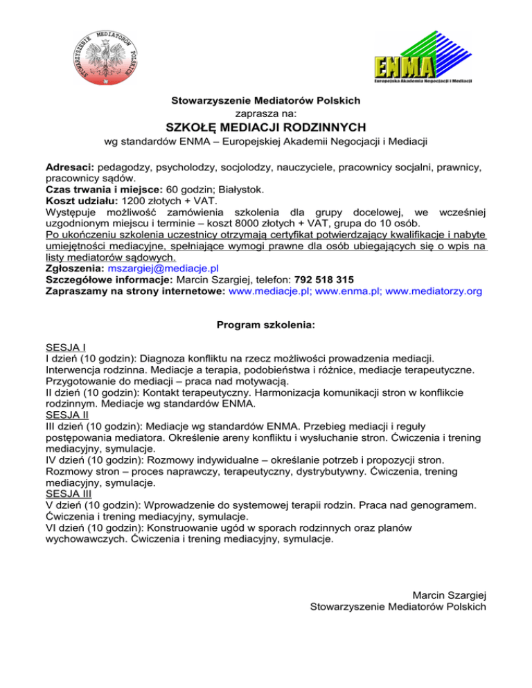 Stowarzyszenie Mediatorów Polskich zaprasza na: SZKOŁĘ MEDIACJI RODZINNYCH wg standardów ENMA – Europejskiej Akademii Negocjacji i Mediacji Adresaci: pedagodzy, psycholodzy, socjolodzy, nauczyciele, pracownicy socjalni, prawnicy, pracownicy sądów. Czas trwania i miejsce: 60 godzin; Białystok. Koszt udziału: 1200 złotych + VAT. Występuje możliwość zamówienia szkolenia dla grupy docelowej, we wcześniej uzgodnionym miejscu i terminie – koszt 8000 złotych + VAT, grupa do 10 osób. Po ukończeniu szkolenia uczestnicy otrzymają certyfikat potwierdzający kwalifikacje i nabyte umiejętności mediacyjne, spełniające wymogi prawne dla osób ubiegających się o wpis na listy mediatorów sądowych. Zgłoszenia: [email protected] Szczegółowe informacje: Marcin Szargiej, telefon: 792 518 315 Zapraszamy na strony internetowe: www.mediacje.pl; www.enma.pl; www.mediatorzy.org Program szkolenia: SESJA I I dzień (10 godzin): Diagnoza konfliktu na rzecz możliwości prowadzenia mediacji. Interwencja rodzinna. Mediacje a terapia, podobieństwa i różnice, mediacje terapeutyczne. Przygotowanie do mediacji – praca nad motywacją. II dzień (10 godzin): Kontakt terapeutyczny. Harmonizacja komunikacji stron w konflikcie rodzinnym. Mediacje wg standardów ENMA. SESJA II III dzień (10 godzin): Mediacje wg standardów ENMA. Przebieg mediacji i reguły postępowania mediatora. Określenie areny konfliktu i wysłuchanie stron. Ćwiczenia i trening mediacyjny, symulacje. IV dzień (10 godzin): Rozmowy indywidualne – określanie potrzeb i propozycji stron. Rozmowy stron – proces naprawczy, terapeutyczny, dystrybutywny. Ćwiczenia, trening mediacyjny, symulacje. SESJA III V dzień (10 godzin): Wprowadzenie do systemowej terapii rodzin. Praca nad genogramem. Ćwiczenia i trening mediacyjny, symulacje. VI dzień (10 godzin): Konstruowanie ugód w sporach rodzinnych oraz planów wychowawczych. Ćwiczenia i trening mediacyjny, symulacje. Marcin Szargiej Stowarzyszenie Mediatorów Polskich