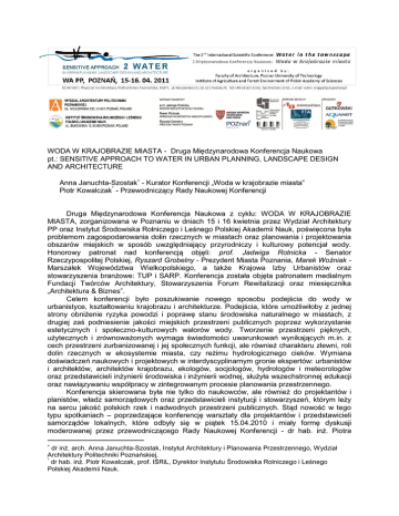 WODA W KRAJOBRAZIE MIASTA - Druga Międzynarodowa Konferencja Naukowa pt.: SENSITIVE APPROACH TO WATER IN URBAN PLANNING, LANDSCAPE DESIGN AND ARCHITECTURE Anna Januchta-Szostak - Kurator Konferencji „Woda w krajobrazie miasta” Piotr Kowalczak* - Przewodniczący Rady Naukowej Konferencji Druga Międzynarodowa Konferencja Naukowa z cyklu: WODA W KRAJOBRAZIE MIASTA, zorganizowana w Poznaniu w dniach 15 i 16 kwietnia przez Wydział Architektury PP oraz Instytut Środowiska Rolniczego i Leśnego Polskiej Akademii Nauk, poświęcona była problemom zagospodarowania dolin rzecznych w miastach oraz planowania i projektowania obszarów miejskich w sposób uwzględniający przyrodniczy i kulturowy potencjał wody. Honorowy patronat nad konferencją objęli: prof. Jadwiga Rotnicka - Senator Rzeczypospolitej Polskiej, Ryszard Grobelny - Prezydent Miasta Poznania, Marek Woźniak Marszałek Województwa Wielkopolskiego, a także Krajowa Izby Urbanistów oraz stowarzyszenia branżowe: TUP i SARP. Konferencja została objęta patronatem medialnym Fundacji Twórców Architektury, Stowarzyszenia Forum Rewitalizacji oraz miesięcznika „Architektura & Biznes”. Celem konferencji było poszukiwanie nowego sposobu podejścia do wody w urbanistyce, kształtowaniu krajobrazu i architekturze. Podejścia, które umożliwiłoby z jednej strony obniżenie ryzyka powodzi i poprawę stanu środowiska naturalnego w miastach, z drugiej zaś podniesienie jakości miejskich przestrzeni publicznych poprzez wykorzystanie estetycznych i społeczno-kulturowych walorów wody. Tworzenie przestrzeni pięknych, użytecznych i zrównoważonych wymaga świadomości uwarunkowań wynikających m.in. z cech przestrzeni zurbanizowanej i jej społecznych funkcji, ale również charakteru zlewni, roli dolin rzecznych w ekosystemie miasta, czy reżimu hydrologicznego cieków. Wymiana doświadczeń naukowych i projektowych w interdyscyplinarnym gronie ekspertów: urbanistów i architektów, architektów krajobrazu, ekologów, socjologów, hydrologów i meteorologów oraz przedstawicieli inżynierii środowiska i inżynierii wodnej, służyła wszechstronnej edukacji oraz nawiązywaniu współpracy w zintegrowanym procesie planowania przestrzennego. Konferencja skierowana była nie tylko do naukowców, ale również do projektantów i planistów, władz samorządowych oraz przedstawicieli instytucji i stowarzyszeń, którym leży na sercu jakość polskich rzek i nadwodnych przestrzeni publicznych. Stąd nowość w tego typu spotkaniach – poprzedzające konferencję warsztaty dla projektantów i przedstawicieli samorządów lokalnych, które odbyły się w piątek 15.04.2010 i miały formę dyskusji moderowanej przez przewodniczącego Rady Naukowej Konferencji - dr hab. inż. Piotra dr inż. arch. Anna Januchta-Szostak, Instytut Architektury i Planowania Przestrzennego, Wydział Architektury Politechniki Poznańskiej. * dr hab. inż. Piotr Kowalczak, prof. IŚRiL, Dyrektor Instytutu Środowiska Rolniczego i Leśnego Polskiej Akademii Nauk. Kowalczaka, prof. IŚRiL PAN. W ramach warsztatów przedstawiono dobre praktyki zagospodarowania nadbrzeży w Bydgoszczy, Koninie i Międzychodzie. Dyskutowano również nad możliwościami i problemami zagospodarowania wód opadowych w obszarach zurbanizowanych oraz zagrożeniami powodziowymi nasilającymi się w efekcie procesów urbanizacji i globalnych zmian klimatycznych. Zwrócono uwagę na potrzebę integracji działań prowadzonych w ramach miejskiej polityki przestrzennej z wymogami dyrektyw unijnych w zakresie gospodarki wodnej i ich implementację w polskich przepisach prawnych oraz konieczność poprawy efektywności organizacyjnej procesów planistycznych. Organizatorzy położyli duży nacisk na międzynarodowy transfer wiedzy w zakresie badań naukowych i dobrych praktyk oraz ich wdrażanie w Polsce. Doświadczeniami w zakresie planowania przestrzennego i projektowania urbanistycznego w Holandii i w Polsce podzielili się goście konferencji: Gijs van den Boomen z KuiperCompagnons (Rotterdam), Huub Droogh z Rothuizen van Doorn ’t Hooft RDH (Breda / Poznań), Kees Stegenga z Werkplaats voor Stedenbouw w Tilburgu oraz Adrianus C. van Terheijden z Bredy. Spośród 49 zgłoszonych na konferencję referatów, 23 zaprezentowano w ramach czterech sesji naukowych: 1. WODA JAKO ELEMENT STRUKTUR URBANISTYCZNYCH (moderatorzy: dr hab. inż. arch. Wojciech Kosiński, prof. PK, Wydział Architektury Politechniki Krakowskiej; dr inż. arch. Anna Januchta-Szostak, Wydział Architektury Politechniki Poznańskiej) 2. RZEKA W MIEŚCIE – SZANSA CZY ZAGROŻENIE? (moderatorzy: prof. zw. dr hab. Zbigniew Kundzewicz, IŚRiL, Polska Akademia Nauk; dr hab. inż. arch. Jerzy Suchanek, prof. PP, Dziekan Wydziału Architektury Politechniki Poznańskiej) 3. WODA JAKO TWORZYWO ZRÓWNOWAŻONYCH PRZESTRZENI PUBLICZNYCH (moderatorzy: prof. dr hab. inż. arch. Wojciech Bonenberg i dr inż. arch. Anna JanuchtaSzostak z Wydziału Architektury Politechniki Poznańskiej) 4. PERCEPCJA WODY W KRAJOBRAZIE MIASTA (moderatorzy: dr hab. inż. arch. Alina Drapella-Hermansdorfer, Wydział Architektury Politechniki Wrocławskiej; dr hab. inż. arch. Teresa Bardzińska-Bonenberg, prof. PP, Wydział Architektury Politechniki Poznańskiej). W trakcie sesji konferencyjnych omówiono szereg przykładów polskich i światowych ilustrujących efekty i metody transformacji miejskich przestrzeni nadwodnych oraz zmiany podejścia do gospodarki wodnej w miastach w myśl wytycznych Ramowej Dyrektywy Wodnej i Dyrektywy Powodziowej. W podsumowaniu podkreślono praktyczne znaczenie zarówno warsztatów, jak i konferencji. Wskazano na konieczność kontynuowania dialogu pomiędzy przedstawicielami architektury i urbanistyki a nauk związanych z gospodarowaniem wodą i kształtowaniem środowiska oraz wskazano na korzyści wynikające ze współpracy projektantów i przedstawicieli administracji samorządowej oraz regionalnych zarządów g