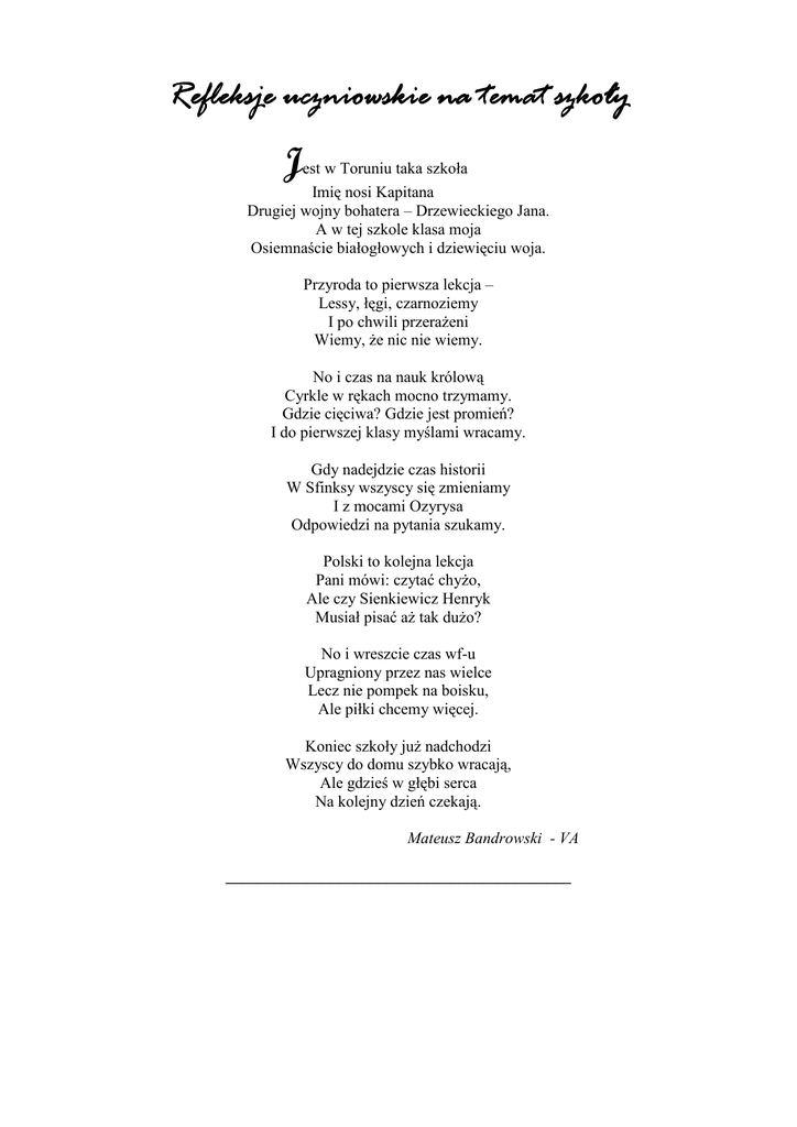 Refleksje uczniowskie na temat szkoły Jest w Toruniu taka szkoła Imię nosi Kapitana Drugiej wojny bohatera – Drzewieckiego Jana. A w tej szkole klasa moja Osiemnaście białogłowych i dziewięciu woja. Przyroda to pierwsza lekcja – Lessy, łęgi, czarnoziemy I po chwili przeraŜeni Wiemy, Ŝe nic nie wiemy. No i czas na nauk królową Cyrkle w rękach mocno trzymamy. Gdzie cięciwa? Gdzie jest promień? I do pierwszej klasy myślami wracamy. Gdy nadejdzie czas historii W Sfinksy wszyscy się zmieniamy I z mocami Ozyrysa Odpowiedzi na pytania szukamy. Polski to kolejna lekcja Pani mówi: czytać chyŜo, Ale czy Sienkiewicz Henryk Musiał pisać aŜ tak duŜo? No i wreszcie czas wf-u Upragniony przez nas wielce Lecz nie pompek na boisku, Ale piłki chcemy więcej. Koniec szkoły juŜ nadchodzi Wszyscy do domu szybko wracają, Ale gdzieś w głębi serca Na kolejny dzień czekają. Mateusz Bandrowski - VA ___________________________________________ Szkoło moja ukochana, To dla Ciebie wstaję z rana, Szybko zjadam swe śniadanie I zakładam me ubranie. Kiedy idę korytarzem Widzę uśmiechnięte twarze; Z przyjaciółmi się spotykam I wraz z nimi czasem brykam. Podczas lekcji chłonę wiedzę I rozszerzam horyzonty MnoŜę, dzielę i dodaję Oraz mierzę róŜne kąty. Nauczyciele dzielą się z nami Wiadomościami oraz pasjami. Wspierają, uczą i oceniają więc radości dostarczają. Zuzanna Urban - kl. 5a Na twarzy naszej pani juŜ od rana miły uśmiech gości. Dzięki temu w klasie panuje atmosfera radości. Wszystko pięknie, jasno nam pani tłumaczy. Prosta prostopadła, ortografia – wiemy, co to znaczy. Szóstki? Piątki? Nic wielkiego! Gdy się ma nauczyciela takiego! Zuzanna Anyszka –kl. 5a Nasi nauczyciele Na świecie jest zawodów wiele Lecz najlepsi są nauczyciele. Pani od matematyki Nie rozgniewały nasze wybryki. Ciągle tylko okręgi rysuje, Czasem wstawi jakąś dwóję. Pani od polskiego duŜo dyktuje. Tłumaczy, Ŝe „uje” się nie kreskuje. Angielski całkiem dobrze znamy, W koszykówkę nieźle gramy. Wiemy, ile człowiek ma zębów, Dzięki Pani od przyrody odróŜniamy buk od dębu. W świat techniki Pani Iwona wprowadziła nas, Wiemy jak bezpiecznie do szkoły dojść na czas. Na niemiecki czekamy tydzień cały, Bo z Panią Agnieszką jest wspaniały. Pani Tamara wie, Ŝe śpiewać kaŜdy moŜe Trochę lepiej lub trochę gorzej. Biblię sobie przyswajamy, Tajemnice róŜańca znamy. Daty i bitwy - prosta sprawa Z Panią Jęczmionką historia to dobra zabawa. Uwielbiamy naszych nauczycieli. Wiemy, Ŝe oni bardzo by chcieli Aby kaŜdy, kto chodzi do szkoły, Był zawsze mądry i wesoły. Zuzanna Kuffel - kl. 5a „Trójka” Moja szkoła „Trójką” się zowie. Są w niej super nauczyciele i zdolni uczniowie. Od poniedziałku do piątku pracujemy w mozole. Zbieramy makulaturę w kroplach potu na czole. Wygrywamy konkursy i zawody sportowe. Jedynki, dwójki i trójki wcale nam nie w głowie! Lepszej szkoły nie znajdziecie – Tak jest w „Trójce” na Legionów 210. Agata Nowak - kl.Va ______________________________ W mojej szkole Tu zdobędę odpowiedzi na prawie wszystkie moje pytania. Tu moŜe przyjaciela znajdę na całe Ŝycie. Nowe wciąŜ poznaję zasady, wzory, równania. Muszę je zrozumieć, zapamiętać, zapisać w zeszycie. Tu się uczę, śmieję, jem droŜdŜówkę popijając mlekiem. Tu jestem uczniem, kolegą, dzieckiem, człowiekiem. Wiktor Johansson – kl. 5a ___________________________________________________________ Witaj szkoło! Gdy przechodzę przez próg szkoły Znów nie jestem tak wesoła Myślę sobie… Radość: Widzę znowu mych przyjaciół. Ciekawość: Co mnie dzisiaj spotka? Obawa: Chcę znać ocenę za ostatni test, to jest właśnie mały stres. śal: Bo za rok się rozstaniemy. Jednak nikt tego zburzyć nie zdoła, Bo to właśnie jest wspaniała szkoła. Patrycja Mamroł – kl.6b W naszej szkole leń – Słowo zakazane. KaŜdy pilnie uczy się, A złych ocen nie ma wcale. Pani czasami za szybko dyktuje, Ale to się wyreguluje. Trochę przyspieszymy, Pismo wyrobimy I… W końcu za panią nadąŜymy. MoŜe to i zwariowane, Ale tak juŜ jest, śeby skończyć wszystkie szkoły, Trzeba uczyć się. Jeśli jesteś leniem I nie chcesz się uczyć, Nie zdasz do gimnazjum. A jaBędę śmiała się. Julia Mazur - 5d Kiedy byłam bardzo mała Nauczycielką zostać chciałam. Teraz wiem – to cięŜka praca, Ale trud się ten opłaca. Nauczyciel wciąŜ się trudzi, By wychować dobrych ludzi. Rosną nowe pokolenia I kaŜde z nich nauczycieli docenia. KaŜdy pamięta swą Panią I czasami tęskni za Nią. Agnieszka Olejarz – 5a _____________________________________________________________ Kolor brązowy przypomina mi konika, który po łące wesoło bryka. Lecz nie o tym wiersz miał być, więc do pisania zabieram się- hyc! Gdy do szkoły mam wstać rano, Wołam: - Jeszcze chwilę, mamo! Lecz gdy do szkoły wchodzę, to się zaraz rozpogodzę. Szkoła to nie tylko nauka, ale takŜe moje koleŜanki. W naszych kącikach się spotykamy, tajemnice sobie powierzamy. Dzięki szkole uczę się wspaniale, i świetnymi ocenami wszędzie się chwalę. Szkoła kaŜdego dnia uczy mnie wiele, więc polecam wam ją, moi przyjaciele! Martyna Kacprzak - kl. 5a __________________________________ W naszej szkole jest wesoło wszyscy o tym wiedzą wkoło. My się tutaj nie nudzimy bardzo pilnie się uczymy. Nasza Pani się uśmiecha, Wie, co ją za chwilę czeka. Angielskiego się uczymy mając przy tym dziwne miny. My o dzwonku juŜ myślimy, a tu jeszcze trzy godziny trzeba będzie spędzić w szkole. W naszej szkole jest wesoło… Patryk Szkuta – kl. 5a ___________________________________ Szkoła jest po to Ŝeby się uczyć. Przedmiotów jest bardzo wiele. Lecz w szkole jest takŜe wesoło bo są tu koledzy i nauczyciele. Nauczyciel jest jak przewodnik. Przewodnik po całym świecie. I mówi ciekawie o tym jak Ŝycie czas