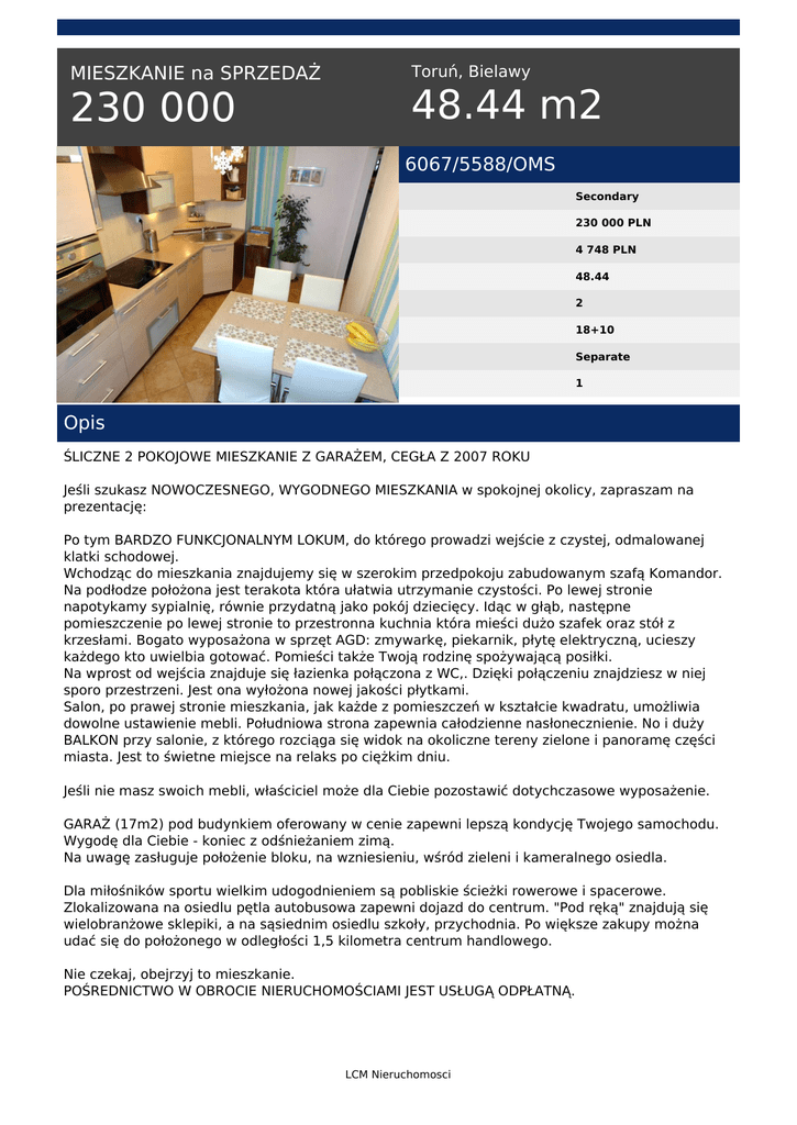 MIESZKANIE na SPRZEDAŻ 230 000 Toruń, Bielawy 48.44 m2 6067/5588/OMS Secondary 230 000 PLN 4 748 PLN 48.44 2 18+10 Separate 1 Opis ŚLICZNE 2 POKOJOWE MIESZKANIE Z GARAŻEM, CEGŁA Z 2007 ROKU Jeśli szukasz NOWOCZESNEGO, WYGODNEGO MIESZKANIA w spokojnej okolicy, zapraszam na prezentację: Po tym BARDZO FUNKCJONALNYM LOKUM, do którego prowadzi wejście z czystej, odmalowanej klatki schodowej. Wchodząc do mieszkania znajdujemy się w szerokim przedpokoju zabudowanym szafą Komandor. Na podłodze położona jest terakota która ułatwia utrzymanie czystości. Po lewej stronie napotykamy sypialnię, równie przydatną jako pokój dziecięcy. Idąc w głąb, następne pomieszczenie po lewej stronie to przestronna kuchnia która mieści dużo szafek oraz stół z krzesłami. Bogato wyposażona w sprzęt AGD: zmywarkę, piekarnik, płytę elektryczną, ucieszy każdego kto uwielbia gotować. Pomieści także Twoją rodzinę spożywającą posiłki. Na wprost od wejścia znajduje się łazienka połączona z WC,. Dzięki połączeniu znajdziesz w niej sporo przestrzeni. Jest ona wyłożona nowej jakości płytkami. Salon, po prawej stronie mieszkania, jak każde z pomieszczeń w kształcie kwadratu, umożliwia dowolne ustawienie mebli. Południowa strona zapewnia całodzienne nasłonecznienie. No i duży BALKON przy salonie, z którego rozciąga się widok na okoliczne tereny zielone i panoramę części miasta. Jest to świetne miejsce na relaks po ciężkim dniu. Jeśli nie masz swoich mebli, właściciel może dla Ciebie pozostawić dotychczasowe wyposażenie. GARAŻ (17m2) pod budynkiem oferowany w cenie zapewni lepszą kondycję Twojego samochodu. Wygodę dla Ciebie - koniec z odśnieżaniem zimą. Na uwagę zasługuje położenie bloku, na wzniesieniu, wśród zieleni i kameralnego osiedla. Dla miłośników sportu wielkim udogodnieniem są pobliskie ścieżki rowerowe i spacerowe. Zlokalizowana na osiedlu pętla autobusowa zapewni dojazd do centrum. "Pod ręką" znajdują się wielobranżowe sklepiki, a na sąsiednim osiedlu szkoły, przychodnia. Po większe zakupy można udać się do położonego w odległości 1,5 kilometra centrum handlowego. Nie czekaj, obejrzyj to mieszkanie. POŚREDNICTWO W OBROCIE NIERUCHOMOŚCIAMI JEST USŁUGĄ ODPŁATNĄ. LCM Nieruchomosci Oświadczenie Biuro Pośrednictwa LCM Nieruchomości działa zgodnie z zasadami Standardów Zawodowych Pośredników w Obrocie Nieruchomościami, zamieszcza w ofertach informacje prawdziwe wg wszelkiej wiedzy i starania, nie łamie regulaminów serwisów nieruchomościowych, w tym nie publikuje celowo nieaktualnych i nieistniejących ofert, oraz stanowczo odcina się od praktyk nieetycznych i wprowadzających inne firmy oraz potencjalnych klientów w błąd. ZAPEWNIAMY BEZPŁATNE I PROFESJONALNE DORADZTWO W ZAKRESIE POZYSKIWANIA KREDYTÓW HIPOTECZNYCH NA ZAKUP NIERUCHOMOŚCI Powyższe informacje zostały sporządzone na podstawie oświadczeń i nie są ofertą w rozumieniu przepisów Kodeksu Cywilnego. Mają one jedynie charakter informacyjny. Joanna Bucewicz tel. 793941092 email: [email protected] LCM Nieruchomosci Powered by TCPDF (www.tcpdf.org)