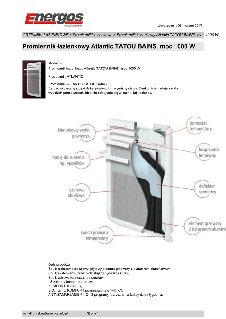Utworzono : 03 marzec 2017 GRZEJNIKI ŁAZIENKOWE > Promienniki łazienkowe > Promiennik łazienkowy Atlantic TATOU BAINS moc 1000 W Promiennik łazienkowy Atlantic TATOU BAINS moc 1000 W Model : Promiennik łazienkowy Atlantic TATOU BAINS moc 1000 W Producent : ATLANTIC Promiennik ATLANTIC TATOU BAINS Bardzo skuteczny dzięki dużej powierzchni wymiany ciepła. Znakomicie nadaje się do wysokich pomieszczeń. Idealnie odnajduje się w kuchni lub łazience. Opis produktu: • niskotemperaturowy, płytowy element grzewczy z dyfuzorem aluminiowym, • system ASP przeciwdziałający cyrkulacji kurzu, • cyfrowy termostat temperatury: - 3 zakresy temperatur pracy: KOMFORT 10-28�C, EKO (temp. KOMFORT pomniejszona o 1-4�C), ANTYZAMARZANIE 7�C,- 3-programy fabryczne na każdy dzień tygodnia, kontakt : - [email protected] Strona 1 Utworzono : 03 marzec 2017 GRZEJNIKI ŁAZIENKOWE > Promienniki łazienkowe > Promiennik łazienkowy Atlantic TATOU BAINS moc 1000 W Promiennik łazienkowy Atlantic TATOU BAINS moc 1000 W kontakt : - [email protected] Strona 2 Utworzono : 03 marzec 2017 GRZEJNIKI ŁAZIENKOWE > Promienniki łazienkowe > Promiennik łazienkowy Atlantic TATOU BAINS moc 1000 W Promiennik łazienkowy Atlantic TATOU BAINS moc 1000 W - wskaźnik zużycia energii, - sensor otwarcia okna, - wielofunkycjny wyświetlacz LCD, - amplituda <0,1�C, - tolerancja <1,5�C, - blokada ustawień termostatu np. przed dziećmi, - możliwość bezpośredniej instalacji programatora CHRONOPASS, - kompatybilny z systemem sterowania PASS Program, • 2 uchwyty umożliwiające suszenie ręczników (do montażu), • bezpiecznik termiczny załączany automatycznie, • obudowa - stal wysokogatunkowa (DC 04 + ZE 25/25), • czołowy wylot powietrza, • stelaż naścienny (stal galwanizowana), • kolor biały (RAL 9016, lakier epoxy-polyester). Dane techniczne: Producent � Atlantic - 2 lata gwarancji Napięcie znamionowe � 230 V~ 50/60 Hz Moc grzewcza [W] � 1000 Wymiary : szer. x wys. x gł. [mm] � 470 x 775 x 95 Dł.przewodu [mm] � 1000 Kolor � biały kontakt : - [email protected] Strona 3 Utworzono : 03 marzec 2017 GRZEJNIKI ŁAZIENKOWE > Promienniki łazienkowe > Promiennik łazienkowy Atlantic TATOU BAINS moc 1000 W Promiennik łazienkowy Atlantic TATOU BAINS moc 1000 W kontakt : - [email protected] Strona 4 Utworzono : 03 marzec 2017 GRZEJNIKI ŁAZIENKOWE > Promienniki łazienkowe > Promiennik łazienkowy Atlantic TATOU BAINS moc 1000 W Promiennik łazienkowy Atlantic TATOU BAINS moc 1000 W Cena : 835,00 zł Brutto ( 678,86 zł Netto) Dostępność: Produkt dostępny w naszym sklepie od 03 kwiecień 2009 kontakt : - [email protected] Strona 5
