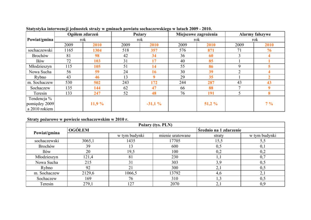 Statystyka interwencji jednostek straży w gminach powiatu sochaczewskiego w latach 2009 - 2010. Ogółem zdarzeń Pożary Miejscowe zagrożenia rok rok rok Powiat/gmina 2009 2009 2009 2010 2010 2010 sochaczewski 1165 518 576 1304 357 871 Brochów 81 42 36 98 34 60 Iłów 72 31 40 103 17 85 Młodzieszyn 115 51 55 105 14 86 Nowa Sucha 56 24 30 59 16 39 Rybno 43 13 29 46 9 35 m. Sochaczew 530 243 244 502 172 287 Sochaczew 135 62 66 144 47 88 Teresin 133 52 76 247 48 191 Tendencja % pomiędzy 2009 11,9 % -31,1 % 51,2 % a 2010 rokiem Alarmy fałszywe rok 2009 2010 71 76 3 4 1 1 9 5 2 4 1 2 43 43 7 9 5 8 7% Straty pożarowe w powiecie sochaczewskim w 2010 r. Pożary (tys. PLN) Powiat/gmina sochaczewski Brochów Iłów Młodzieszyn Nowa Sucha Rybno m. Sochaczew Sochaczew Teresin OGÓŁEM 3065,1 39 20 121,4 215 92 2129,6 169 279,1 w tym budynki 1435 13 19,5 81 31 21 1066,5 76 127 mienie uratowane 17705 600 100 230 303 300 13792 310 2070 Średnio na 1 zdarzenie straty 15,5 0,5 0,2 1,1 3,9 2,1 4,6 1,3 2,1 w tym budynki 5,5 0,1 0,2 0,7 0,5 0,5 2,1 0,5 0,9 Straty w miejscowych zagrożeniach w powiecie sochaczewskim w 2010 r. Miejscowe zagrożenia (tys. PLN) w tym budynki mienie uratowane powiat/gmina OGÓŁEM sochaczewski 4004,7 14,2 181 Brochów 45 0 0 Iłów 129 0 35 Młodzieszyn 1009 0 15 Nowa Sucha 109 0 0 Rybno 200 0 0 m. Sochaczew 496,2 14,2 76 Sochaczew 1803 0 55 Teresin 213,5 0 0 Osoby poszkodowane w zdarzeniach w 2010 r. Ofiary śmiertelne inne Ofiary śmiertelne dzieci Rodzaj rok rok zdarzenia 2009 2009 2010 2010 Pożary 0 0 0 0 Miejscowe 10 0 18 0 zagrożenia RAZEM: 10 18 0 0 Średnio na 1 zdarzenie 35,1 0,5 1,8 9,5 2 4,7 1 14 1,6 Ranni inni rok 2009 2010 9 2 Ranne dzieci rok 2009 2010 0 0 151 166 10 4 160 168 10 4 Główne przyczyny powstawania pożarów w 2010 r. Podpalenia (umyślne) w tym Powiat/gmina akty terroru sochaczewski 357 71 Brochów 34 4 Iłów 17 1 Młodzieszyn 14 3 Nowa Sucha 16 1 Rybno 9 0 m. Sochaczew 172 44 Sochaczew 47 6 Teresin 48 12 Pożary jako następstwa innych miejscowych zagrożeń 1 0 0 0 0 0 1 0 0 Inne przyczyny Nieustalone 54 1 2 4 6 7 21 6 7 231 28 15 9 12 8 101 33 25 Główne przyczyny powstawania miejscowych zagrożeń w 2010 r. Powiat/gmina sochaczewski Brochów Iłów Młodzieszyn Nowa Sucha Rybno m. Sochaczew Sochaczew Teresin Niewłaściwe Nietypowe Niezachowanie zabezpieczenie Huragany, Gwałtowne zachowania zasad hodowlanych Gwałtowne Inne silne przybory się zwierząt, OGÓŁEM opady bezpieczeństwa zwierząt, Nieustalone owadów przyczyny wiatry, wód, zatory atmosferyczne ruchu środków owadów, tornada lodowe stwarzające transportu gadów, zagrożenie ptaków 871 42 252 58 129 7 72 72 239 60 0 3 18 3 1 9 5 26 85 5 26 13 11 1 2 4 21 86 5 11 11 17 0 10 7 29 39 5 10 3 7 0 5 0 10 35 4 7 0 7 1 3 0 11 287 13 64 4 46 2 21 39 94 88 5 18 1 22 1 14 10 17 191 5 113 8 16 1 8 7 31