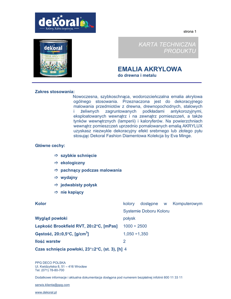 strona 1 KARTA TECHNICZNA PRODUKTU EMALIA AKRYLOWA do drewna i metalu Zakres stosowania: Nowoczesna, szybkoschn ca, wodorozcie czalna emalia akrylowa ogólnego stosowania. Przeznaczona jest do dekoracyjnego malowania przedmiotów z drewna, drewnopochodnych, stalowych i eliwnych zagruntowanych podk adami antykorozyjnymi, eksploatowanych wewn trz i na zewn trz pomieszcze , a tak e tynków wewn trznych (lamperii) i kaloryferów. Na powierzchniach wewn trz pomieszcze uprzednio pomalowanych emali AKRYLUX uzyskasz niezwykle dekoracyjny efekt srebrnego lub z otego py u stosuj c Dekoral Fashion Diamentowa Kolekcja by Eva Minge. G ówne cechy: szybkie schni cie ekologiczny pachn cy podczas malowania wydajny jedwabisty po ysk nie kapi cy Kolor kolory dost pne w Komputerowym Systemie Doboru Koloru Wygl d pow oki po ysk Lepko 1000 ÷ 2500 G sto Ilo Brookfield RVT, 20 2 C, [mPas] , 20 0,5 C, [g/cm3] warstw 1,050 ÷1,350 2 Czas schni cia pow oki, 23 2 C, (st. 3), [h] 4 PPG DECO POLSKA Ul. Kwidzy ska 8, 51 416 Wroc aw Tel. (071) 78-80-700 Dodatkowe informacje i aktualna dokumentacja dost pna pod numerem bezp atnej infolinii 800 11 33 11 [email protected] www.dekoral.pl strona 2 Nanoszenie drugiej warstwy, [h] po 4 Sposób nanoszenia p dzel, wa ek lub natrysk Wydajno do 14 m2/l przy jednej warstwie Rozcie czalnik woda Sposób u ycia 1.Przygotowanie pod o a Z pod o a przeznaczonego do malowania usu wszelkie zabrudzenia, nierówno ci, odt u i wysusz. Pod o a drewniane i drewnopochodne eksploatowane na zewn trz zagruntuj DREWNOCHRON IMPREGNATEM bezbarwnym. Jako farb podk adow zalecamy zastosowa GRUNTOMAL marki Dekoral. Wewn trz pomieszcze emalia mo e by nanoszona bezpo rednio na surowe drewno. Pod o e stalowe i eliwne eksploatowane na zewn trz zagruntuj Podk adem Antykorozyjnym marki Dekoral. Tynki wewn trzne zagruntuj GRUNTOMALEM marki Dekoral. Przy renowacji wymalowa , stare pow oki zmatuj papierem ciernym i odpyl. Usu pow oki z uszczone i sp kane. 2. Malowanie Przed u yciem wyrób nale y dok adnie wymiesza . W razie potrzeby rozcie czy wod max 2% obj. Zalecana ilo warstw - 2. Drug warstw nanosi po minimum 4 godzinach. Dla kolorów o niestandardowym kryciu, wskazanych w bazie danych przy maszynach koloruj cych, nale y u y wskazanego podk adu. W celu uzyskania efektu dekoracyjnego roz wietlenia malowanych elementów, odpowiednio przygotowane pod o e pomaluj emali AKRYLUX na dowolnie wybrany kolor a nast pnie zastosuj Dekoral Fashion Diamentowa Kolekcja (zgodnie z instrukcj na opakowaniu). 3. Dodatkowe informacje Malowa przy temperaturze pod o a od +10 °C do +25 °C. Narz dzia po zako czeniu prac malarskich nale y umy starannie pod bie c wod . Podczas malowania i przez kilka dni utrzymuje si subtelny przyjemny zapach. Produkt wodorozcie czalny, nieodporny na mróz. Przechowywa w temp. powy ej 0°C. 4. Wskazówki BHP i PPO W trakcie prac malarskich i po ich zako czeniu pomieszczenia wywietrz do zaniku charakterystycznego zapachu Chroni przed dzie mi. PPG DECO POLSKA Ul. Kwidzy ska 8, 51 416 Wroc aw Tel. (071) 78-80-700 Dodatkowe informacje i aktualna dokumentacja dost pna pod numerem bezp atnej infolinii 800 11 33 11 [email protected] www.dekoral.pl strona 3 W razie po kni cia niezw oczne zasi gnij porady lekarza poka opakowanie lub etykiet . Stosowa si do zalece podanych na opakowaniu. Szczegó owe informacje zamieszczone s w Karcie Charakterystyki. Norma: Atesty: PKWiU: Data wa no ci: ZN-PPGDP-191 Posiada Atest Higieniczny PZH Posiada Certyfikat na zgodno Bezpiecze stwo Zabawek. pierwiastków z norm Migracja PN-EN 71-3 okre lonych 24.30.11-50.00 36 miesi cy od daty produkcji Limit zawarto ci LZO wg Dyrektywy 2004/42/WE (kat. A/d/FW):130 g/l (2010). Produkt zawiera max 130 g/l. Opakowanie handlowe 0,8 L PPG DECO POLSKA Ul. Kwidzy ska 8, 51 416 Wroc aw Tel. (071) 78-80-700 Dodatkowe informacje i aktualna dokumentacja dost pna pod numerem bezp atnej infolinii 800 11 33 11 [email protected] www.dekoral.pl