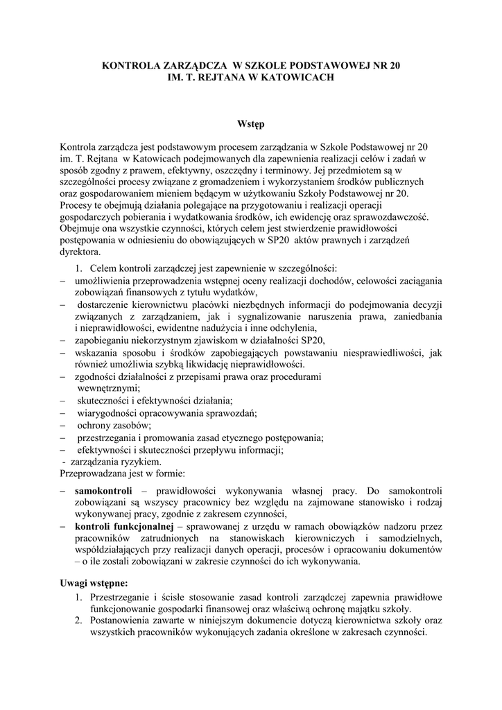 kontrola zarządcza w szkole podstawowej nr 20