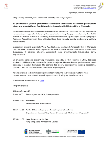 SPC House of Media, organizator programu ul. Madalińskiego 20/1A, 02-513 Warszawa tel.: 22 646 42 66, [email protected] Informacja prasowa, 25 lutego 2014 Eksporterzy kosmetyków poznawali sekrety chińskiego rynku 30 przedstawicieli polskich producentów kosmetyków uczestniczyło w szkoleniu poświęconym eksportowi kosmetyków do Chin, które odbyło się w dniach 20-21 lutego 2014 w Warszawie. Polscy producenci od dłuższego czasu próbują wejść na gigantyczny rynek Chin. Od 2 lat na jednych z najważniejszych regionalnych targów, Cosmoprof Asia w Hong Kongu, prezentuje się duży Polski Pawilon Narodowy. Sukcesy w sprzedaży produktów do krajów sąsiadujących czy do Specjalnych Regionów Administracyjnych Chin, takich jak Hong Kong, rozpaliły apetyty producentów na Chiny kontynentalne. Uczestników szkolenia przywitali: Wang Yu, attache ds. handlowych Ambasady Chin w Warszawie oraz Stanisław Leśniewski, który odpowiada za polsko-chińskie relacje handlowe w Ministerstwie Gospodarki. W otwarciu szkolenia uczestniczyli także przedstawiciele Ministerstwa Spraw Zagranicznych. W programie szkolenia znalazły się wystąpienia ekspertów z Chin, Niemiec i Litwy, dotyczące struktury chińskiego rynku kosmetyków, procedur rejestracji kosmetyków w tym kraju oraz metod sprzedaży i kanałów dystrybucji. Nie zabrakło też bloków poświęconych chińskiej gospodarce, polityce i kulturze czy biznesowemu savoir-vivre w tym regionie. Kolejne szkolenie na temat eksportu polskich kosmetyków na najtrudniejsze światowe rynki, organizowane w ramach Branżowego Programu Promocji, odbędzie się w lutym 2015. Zdjęcia ze szkolenia dostępne są tutaj. Program szkolenia: 20 lutego (czwartek) 9:30 – 10:00 Rejestracja uczestników, kawa powitalna 10:00 – 10:20 Powitanie Ambasada ChRL w Warszawie 10:20 – 10:50 Polska-Chiny – relacje gospodarcze i wymiana handlowa Departament Promocji i Współpracy Dwustronnej, Ministerstwo Gospodarki 10:50 – 11:50 Hong Kong – drzwi do Chin Hong Kong Trade Development Council Projekt jest współfinansowany przez Unię Europejską ze środków Europejskiego Funduszu Rozwoju Regionalnego. SPC House of Media, organizator programu ul. Madalińskiego 20/1A, 02-513 Warszawa tel.: 22 646 42 66, [email protected] 11:50 – 12:05 Przerwa kawowa 12:05 – 13:00 Case study: historia wejścia na rynek chiński RTJ Tastes (wystąpienie on-line) 13:00 – 15:00 Gospodarka, polityka i kultura Chin - wprowadzenie Zakład Azji Wschodniej, Uniwersytet Łódzki 15:00 – 15:45 Lunch 15:45 – 17:15 Biznesowy savoir-vivre w Chinach Collegium Civitas 17:15 – 17:30 Przerwa kawowa 17:30 – 18:00 Transport kosmetyków do Chin Universal Express 18:00 – 18:30 Media w Chinach Prezentacja dotycząca rynku medialnego w Chinach, ze szczególnym uwzględnieniem mediów branżowych i kobiecych 21 lutego (piątek) 09:00 – 09:15 Rejestracja, kawa powitalna 09:15 – 10:00 Rynek kosmetyków w Chinach Euromonitor 10:00 – 11:30 Podstawy handlowych regulacji prawnych w Chinach Intergate Außenhandelsberatung & -services 11:30 – 11:45 Przerwa kawowa 11:45 – 13:15 Procedury rejestracji kosmetyków w Chinach Intergate Außenhandelsberatung & -services 13:15 – 14:15 Lunch 14:15 – 15:00 Stworzenie marki w Chinach Intergate Außenhandelsberatung & -services Projekt jest współfinansowany przez Unię Europejską ze środków Europejskiego Funduszu Rozwoju Regionalnego. SPC House of Media, organizator programu ul. Madalińskiego 20/1A, 02-513 Warszawa tel.: 22 646 42 66, [email protected] 15:00 – 16:30 Wejście na rynek chiński Lezhitao Trading (Shanghai) Co. Ltd 16:30 – 16:45 Przerwa kawowa 16:45 – 18:15 Sprzedaż kosmetyków w Chinach Lezhitao Trading (Shanghai) Co. Ltd Projekt jest współfinansowany przez Unię Europejską ze środków Europejskiego Funduszu Rozwoju Regionalnego.