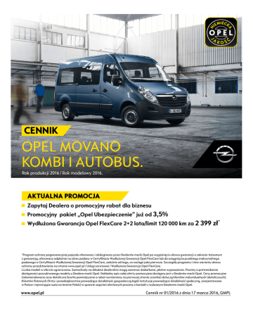 CENNIK OPEL MOVANO KOMBI I AUTOBUS. Rok produkcji 2016 / Rok modelowy 2016. AKTUALNA PROMOCJA Zapytaj Dealera o promocyjny rabat dla biznesu Promocyjny pakiet „Opel Ubezpieczenie” już od 3,5% Wydłużona Gwarancja Opel FlexCare 2+2 lata/limit 120 000 km za 2 399 zł* * Program ochrony pogwarancyjnej pojazdu oferowany i obsługiwany przez Dealerów marki Opel po wygaśnięciu okresu gwarancji o zakresie tożsamym z gwarancją, oferowany odpłatnie na okres podany w Certyfikacie Wydłużonej Gwarancji Opel FlexCare lub do osiągnięcia przebiegu maksymalnego podanego w Certyfikacie Wydłużonej Gwarancji Opel FlexCare, zależnie od tego, co nastąpi jako pierwsze. Szczegóły programu i inne warianty okresu ochrony przedstawiamy na stronie www.opel.pl / Usługi serwisowe / Wydłużona Gwarancja Opel FlexCare. Liczba modeli w ofercie ograniczona. Samochody na składzie dealerskim mogą zawierać dodatkowe, płatne wyposażenie. Prosimy o potwierdzenie dostępności poszukiwanego modelu u Dealera marki Opel. Dokładny opis całej oferty promocyjnej dostępny jest u Dealerów marki Opel. Ceny promocyjne (rekomendowane ceny detaliczne brutto pomniejszone o rabat wymieniony na pierwszej stronie cennika) dotyczą klientów indywidualnych (detalicznych). Klientów flotowych (firmy i przedsiębiorstwa prowadzące działalność gospodarczą bądź instytucje prowadzące działalność społeczną, zarejestrowane w Polsce i rejestrujące auto na terenie Polski) w sprawie zapytań ofertowych prosimy o kontakt z wybranym Dealerem marki Opel. www.opel.pl Cennik nr 01/2016 z dnia 17 marca 2016, GMPL Cennik – Opel Movano Kombi/Autobus rok produkcji 2016, rok modelowy 2016 Modele i wersje 2.3 CDTI BiTurbo 145 KM S/S 2.3 CDTI BiTurbo 170 KM S/S 2.3 CDTI BiTurbo 145 KM S/S 2.3 CDTI BiTurbo 163 KM S/S L1H1 FWD 3,0t Kombi 9-os. M6 145 840 149 790 – – L1H1 FWD 3,3t Kombi 9-os. M6 148 340 152 290 – – L2H2 FWD 3,3t Kombi 9-os. M6 151 140 155 090 – – L2H2 FWD 3,5t Kombi 9-os. M6 153 140 157 090 – – L3H2 FWD 3,9t Autobus 17-os. M6 – – 190 840 192 190 L – dostępne długości nadwozia: 1 = krótka, 2 = średnia, 3 = długa H – dostępne wysokości nadwozia: 1 = niska, 2 = średnia FWD = napęd na przednie koła Wszystkie ceny zawarte w niniejszym cenniku są rekomendowanymi cenami detalicznymi brutto, zawierającymi opłatę za transport samochodu, podatek VAT oraz podatek akcyzowy zależny od typu homologacji i od pojemności silnika. Liczba modeli w ofercie ograniczona. Promocja dostępna do wyczerpania zapasów. Samochody na składzie dealerskim mogą zawierać dodatkowe, płatne wyposażenie. Prosimy o potwierdzenie dostępności poszukiwanego modelu u Dealera marki Opel. Dokładny opis całej oferty promocyjnej dostępny jest u Dealerów marki Opel. Ceny promocyjne dotyczą klientów indywidualnych (detalicznych). Klientów flotowych (firmy i przedsiębiorstwa prowadzące działalność gospodarczą bądź instytucje prowadzące działalność społeczną, zarejestrowane w Polsce i rejestrujące auto na terenie Polski) w sprawie zapytań ofertowych prosimy o kontakt z wybranym Dealerem marki Opel. Dane techniczne silników Kombi i Autobus Kombi 2.3 CDTI BiTurbo 145 KM S/S Kombi 2.3 CDTI BiTurbo 170 KM S/S Autobus 2.3 CDTI BiTurbo 145 KM S/S Autobus 2.3 CDTI BiTurbo 163 KM S/S 6-biegowa manualna 6-biegowa manualna 6-biegowa manualna 6-biegowa manualna 2 299 2 299 2 299 2 299 Moc maksymalna, kW/KM przy obr./min 107 / 145 przy 3 500 125/ 170 przy 4 750-6 000 107 / 145 przy 3 500 120 / 165 przy 3 500 Maks. moment obrotowy, Nm przy obr./min 350 przy 1 500-2 750 350 przy 1 500-2 750 350 przy 1 500-2 750 360 przy 1 500-3 000 Skrzynie biegów Pojemność skokowa, cm3 Norma emisji spalin Euro 6 Euro 6 Euro 6 Euro 6 Zużycie paliwa, cykl mieszany, l/100 km* 6,6–6,3 6,6–6,3 b.d. b.d. Emisja CO2, cykl mieszany, g/km* 197–193 197–193 b.d. b.d. Obowiązkowe przeglądy okresowe co 40 000 km lub 2 lata co 40 000 km lub 2 lata co 30 000 km lub 1 rok co 30 000 km lub 1 rok * Wszystkie informacje były aktualne w momencie publikacji materiału. Zastrzegamy sobie prawo do zmian specyfikacji produktów w dowolnym czasie. Aktualnych informacji o ofercie udzielają Dealerzy marki Opel. Wszystkie dane dotyczą modeli podstawowych z wyposażeniem seryjnym. Wartości zużycia paliwa i emisji spalin dla silników spełniających normy Euro 6 zostały określone według dyrektyw WE 715/2007 i WE 692/2008 oraz 80/1268/EWG i 2004/3/WE, na podstawie oficjalnych testów w warunkach laboratoryjnych, i mierzone są dla pojazdów gotowych do jazdy, zgodnie z tymi regulacjami. Faktyczne wartości mogą różnić się od podanych w zależności od zachowania kierowcy, warunków atmosferycznych, nawierzchni, jak i innych czynników natury nietechnicznej. Dodatkowe wyposażenie może spowodować wyższe spalanie i emisję CO 2 , zwiększenie masy własnej pojazdu, a co za tym idzie nacisku na osie i jednoczesne ograniczenie ładowności pojazdu i dopuszczalnej masy całkowitej przyczepy. Może również prowadzić do zmniejszenia maksymalnej prędkości i uzyskiwanych przyśpieszeń. Zmierzone osiągi dotyczą pojazdu z kierowcą o masie 75 kg i obciążeniem 125 kg. Wymiary, masy, pojemności Nadwozie Przestrzeń ładunkowa (wg ECIE, w zależności od wersji) Długość całkowita (mm): L1: 5 048, L2: 5 548, L3: 6 198 Długość przestrzeni ład. (Kombi z 3 rzędem siedzeń, mm): L1: 948, L2: 1 448 Wysokość całkowita (mm, bez obciążenia): H1: 2 287, H2: 2 495 - 2 482, Bus: 2 488 Długość przestrzeni ład. (Kombi z 2 rzędem siedzeń, mm): L1: 1 757, L2: 2 257 Szerokość między nadkolami (Kombi, mm): 1 380 Szerokość ze złożonymi/rozłożonymi lusterkami (mm): 2 070/2 470 Wysokość wnętrza pojazdu (mm): H1: 1 650, H2: 1 850 Rozstaw osi (mm): 3 182/3 682/4 332 Rozstaw kół przód/tył (mm): 1 750/ 1 730 Masy (wg ECE) Dopuszczalna masa całkowita (w zależności od wersji, kg): 2 980 - 3 870 Śre