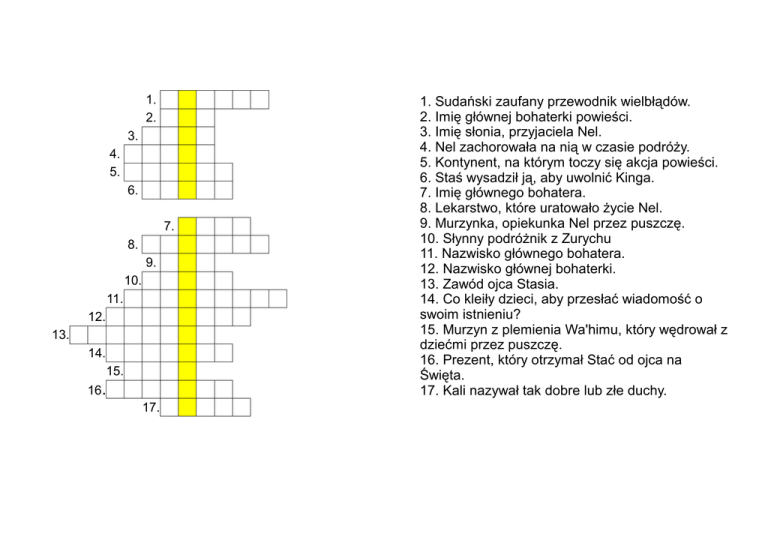 1. 2. 3. 4. 5. 6. 7. 8. 9. 10. 11. 12. 13. 14. 15. 16. 17. 1. Sudański zaufany przewodnik wielbłądów. 2. Imię głównej bohaterki powieści. 3. Imię słonia, przyjaciela Nel. 4. Nel zachorowała na nią w czasie podróży. 5. Kontynent, na którym toczy się akcja powieści. 6. Staś wysadził ją, aby uwolnić Kinga. 7. Imię głównego bohatera. 8. Lekarstwo, które uratowało życie Nel. 9. Murzynka, opiekunka Nel przez puszczę. 10. Słynny podróżnik z Zurychu 11. Nazwisko głównego bohatera. 12. Nazwisko głównej bohaterki. 13. Zawód ojca Stasia. 14. Co kleiły dzieci, aby przesłać wiadomość o swoim istnieniu? 15. Murzyn z plemienia Wa'himu, który wędrował z dziećmi przez puszczę. 16. Prezent, który otrzymał Stać od ojca na Święta. 17. Kali nazywał tak dobre lub złe duchy.