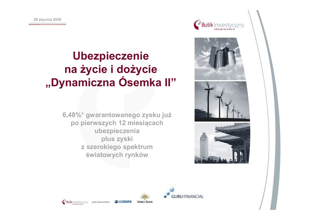 28 stycznia 2009 Ubezpieczenie na Ŝycie i doŜycie „Dynamiczna Ósemka II” 6,48%* gwarantowanego zysku juŜ po pierwszych 12 miesiącach ubezpieczenia plus zyski z szerokiego spektrum światowych rynków Charakterystyka ubezpieczenia „Dynamiczna Ósemka II” Ubezpieczenie inwestycyjne „Dynamiczna Ósemka II” to połączenie produktu strukturyzowanego oraz polisolokaty, które jest oferowane przez TU na śycie EUROPA SA w formie grupowego ubezpieczenia na Ŝycie i doŜycie. W razie zgonu Ubezpieczonego w okresie ubezpieczenia TU na śycie EUROPA SA wypłaci Uprawnionemu świadczenie ubezpieczeniowe. Ubezpieczony moŜe bez zbędnych formalności wskazać Uprawnionego, który w przypadku wystąpienia w/w zdarzenia otrzyma ustalone z góry świadczenie. Po zakończeniu ochrony ubezpieczeniowej TU na śycie EUROPA SA wypłaci Ubezpieczonemu z tytułu doŜycia do końca okresu ubezpieczenia świadczenie, które zostanie powiększone o PREMIĘ dla Ubezpieczonego, której wysokość zaleŜy od zachowania BNP Paribas Millennium 10 Europe Serie 3 ER Index. W obu przypadkach kwota Świadczenia ubezpieczeniowego zwolniona jest z podatku „Belki”. Charakterystyka Produktu ubezpieczeniowego (1/2) okres subskrypcji: 28.01.2009r. - 02.03.2009r. części składowe: 50 % Część Lokacyjna + 50 % Część Inwestycyjna okres ubezpieczenia dla Części Lokacyjnej: 12 miesięcy okres ubezpieczenia dla Części Inwestycyjnej: 36 miesięcy początek okresu ubezpieczenia: 09.03.2009r., jeŜeli zostanie złoŜona Deklaracja Przystąpienia do grupowego ubezpieczenia na Ŝycie i doŜycie oraz zapłacona Składka potencjalny zysk: nieograniczony partycypacja (udział) we wzroście Indeksu: 61%-81% minimalna Składka: 5 000 zł ryzyko walutowe: brak moŜliwość skorzystania w okresie subskrypcji z oferty Noble Bank SA – atrakcyjnie oprocentowana lokata bankowa (7% p.a.) zakładana ze środków przeznaczonych na zapłatę składki ubezpieczeniowej Strona 3 Charakterystyka Produktu ubezpieczeniowego (2/2) bezpieczeństwo kapitału: 100% gwarancji składki zainwestowanej na koniec okresu ubezpieczenia + gwarantowane odsetki z części lokacyjnej (6,48% p.a. co odpowiada lokacie bankowej z oprocentowaniem 8% p.a.) świadczenie ubezpieczeniowe z tytułu doŜycia dla Części Lokacyjnej (po 12 miesiącach okresu ubezpieczenia): 106,48% * Składki Lokacyjnej dla Części Inwestycyjnej (po 36 miesiącach okresu ubezpieczenia): 100% * Składka Zainwestowana plus PREMIA dla Ubezpieczonego, której wysokość zaleŜy od wzrostu BNP Paribas Millennium 10 Europe Serie 3 ER Index świadczenie ubezpieczeniowe z tytułu zgonu: do dnia 09.03.2010r. odpowiedzialności Ubezpieczyciela: 100,1% * (Składka Lokacyjna + Składka Zainwestowana) od dnia 10.03.2010r. odpowiedzialności Ubezpieczyciela: 100,1% * Składka Zainwestowana zwolnienie z podatku „Belki”: Świadczenie ubezpieczeniowe zwolnione z podatku od zysków kapitałowych** Strona 4 Czym jest BNP Paribas Millennium 10 Europe Serie 3 ER Index BNP Paribas Millennium 10 Europe Serie 3 ER Index jest to aktywnie zarządzany indeks o z góry ograniczonym ściśle ryzyku, o zmiennej strukturze, inwestujący na całym świecie na rynkach akcji, nieruchomości, surowców oraz na rynku walutowym, pozwalający zarabiać zarówno na wzrostach, jak i na spadkach na tych rynkach, dzięki moŜliwości zajęcia krótkiej pozycji na danym rynku. Wyjątkowość modelu zarządzania Indeksem polega na: szerokiej dywersyfikacji geograficznej (Europa, Chiny, Japonia, USA) szerokiej dywersyfikacji pod względem aktywów (akcje, surowce, nieruchomości i waluty) moŜliwości uzyskania zysku takŜe w sytuacji spadków na danym rynku, poprzez zajęcie krótkiej pozycji (obstawienie spadków) znacznym ograniczeniu ryzyka, co chroni Indeks przed nagłymi zmianami koniunktury oparciu strategii zarządzania na teorii, za której wynalezienie Harry M. Markowitz otrzymał nagrodę Nobla Strona 5 Spektrum moŜliwości inwestycyjnych BNP Paribas Millennium 10 Europe Serie 3 ER Index Klasa aktywów Rejon geograficzny Obligacje Nieruchomości Indeks IBOXX Sovereigns Europa EPRA TR Euro Zone EuroSTOXX 50 TR USA S&P 500 TR Japonia TOPIX TR Chiny China HSCEI Opis indeksu Indeks obligacji w EUR spółki branŜy nieruchomości w strefie Euro - deweloperzy, generalni wykonawcy, firmy świadczące usługi zarządu nieruchomościami, pośrednictwa i nadzoru budowlanego oraz spółki, dla których posiadanie znaczengo majątku w nieruchomościach wynika z charakteru działalności 50 największych spółek europejskich 500 największych spółek amerykańskich Akcje Waluty EUR/USD Świat Surowce Strona 6 DOW JONES AIG Commodity Index szeroki indeks giełdy japońskiej Szeroki indeks spółek chińskich notowanych w Hong Kongu Kurs walutowy EUR/USD Szeroki indeks 19 surowców zarówno zbóŜ, mięsa jak i surowców energetycznych oraz metali Dlaczego warto nabyć ubezpieczenie o charakterze inwestycyjnym z wypłatą PREMII powiększającej Świadczenie ubezpieczeniowe z tytułu doŜycia, której wysokość zaleŜy od zachowania BNP Paribas Millennium 10 Europe Serie 3 ER Index? Strona 7 Strategia inwestycyjna (1) w celu wygenerowania moŜliwie duŜego zysku przy jednoczesnym ograniczeniu ryzyka, strategia inwestycyjna zastosowana przez BNP Paribas ma za zadanie: uchwycenie najsilniejszych trendów rynkowych kontrolę ryzyka dywersyfikację alokacji aktywów Model alokacji aktywów oczekiwany zysk moŜliwości inwestycyjne oczekiwana zmienność Aktywa nr 1 Aktywa nr 2… korelacja między aktywami ZałoŜenia dotyczące zarządzania ryzykiem Strona 8 optymalny portfel Strategia inwestycyjna (2) Miesięczne zmiany składu portfela odbywają się na podstawie: szacowanych oczekiwanych stóp zwrotu z poszczególnych aktywów - na podstawie historycznych stóp zwrot szacowanej oczekiwanej zmienności stóp zwrotu poszczególnych aktywów - dla tego samego oczekiwanego zysku dokonany zostanie wybór aktyw