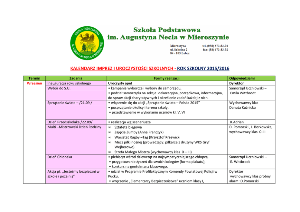Kalendarz imprez i uroczystości szkolnych 2015/2016