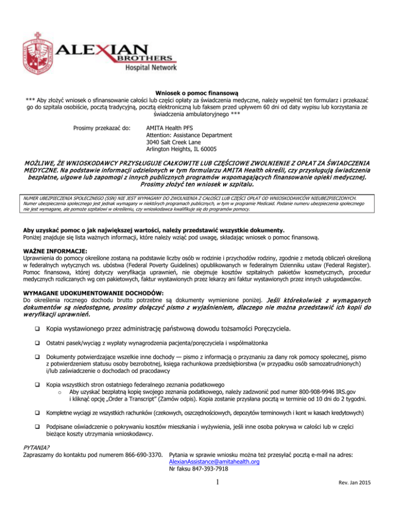 Wniosek o pomoc finansową *** Aby złożyć wniosek o sfinansowanie całości lub części opłaty za świadczenia medyczne, należy wypełnić ten formularz i przekazać go do szpitala osobiście, pocztą tradycyjną, pocztą elektroniczną lub faksem przed upływem 60 dni od daty wypisu lub korzystania ze świadczenia ambulatoryjnego *** Prosimy przekazać do: AMITA Health PFS Attention: Assistance Department 3040 Salt Creek Lane Arlington Heights, IL 60005 M OŻLI W E, ŻE W N I OSKODAW CY P RZYSŁUGUJE CAŁK OW I TE LUB CZĘŚCI OW E ZW OLN I EN I E Z OPŁAT ZA ŚW I ADCZEN I A M EDYCZN E. N a podstaw ie inform acji udzielonych w tym form ularzu AM I TA Health określi, czy przysługują św iadczenia bezpłatne, ulgow e lub zapom ogi z innych publicznych program ów w spom agających finansow anie opieki m edycznej. Prosim y złożyć ten w niosek w szpitalu. NUMER UBEZPIECZENIA SPOŁECZNEGO (SSN) NIE JEST WYMAGANY DO ZWOLNIENIA Z CAŁOŚCI LUB CZĘŚCI OPŁAT OD WNIOSKODAWCÓW NIEUBEZPIECZONYCH. Numer ubezpieczenia społecznego jest jednak wymagany w niektórych programach publicznych, w tym w programie Medicaid. Podanie numeru ubezpieczenia społecznego nie jest wymagane, ale pomoże szpitalowi w określeniu, czy wnioskodawca kwalifikuje się do programów pomocy. Aby uzyskać pomoc o jak największej wartości, należy przedstawić wszystkie dokumenty. Poniżej znajduje się lista ważnych informacji, które należy wziąć pod uwagę, składając wniosek o pomoc finansową. WAŻNE INFORMACJE: Uprawnienia do pomocy określone zostaną na podstawie liczby osób w rodzinie i przychodów rodziny, zgodnie z metodą obliczeń określoną w federalnych wytycznych ws. ubóstwa (Federal Poverty Guidelines) opublikowanych w federalnym Dzienniku ustaw (Federal Register). Pomoc finansowa, której dotyczy weryfikacja uprawnień, nie obejmuje kosztów szpitalnych pakietów kosmetycznych, procedur medycznych rozliczanych wg cen pakietowych, faktur wystawionych przez lekarzy ani faktur wystawionych przez innych usługodawców. WYMAGANE UDOKUMENTOWANIE DOCHODÓW: Do określenia rocznego dochodu brutto potrzebne są dokumenty wymienione poniżej. Jeśli którekolw iek z w ym aganych dokum entów są niedostępne, prosim y dołączyć pism o z w yjaśnieniem , dlaczego nie m ożna przedstaw ić ich kopii do w eryfikacji upraw nień. Kopia wystawionego przez administrację państwową dowodu tożsamości Poręczyciela. Ostatni pasek/wyciąg z wypłaty wynagrodzenia pacjenta/poręczyciela i współmałżonka Dokumenty potwierdzające wszelkie inne dochody — pismo z informacją o przyznaniu za dany rok pomocy społecznej, pismo z potwierdzeniem statusu osoby bezrobotnej, księga rachunkowa przedsiębiorstwa (w przypadku osób samozatrudnionych) i/lub zaświadczenie o dochodach od pracodawcy Kopia wszystkich stron ostatniego federalnego zeznania podatkowego o Aby uzyskać bezpłatną kopię swojego zeznania podatkowego, należy zadzwonić pod numer 800-908-9946 IRS.gov i kliknąć opcję „Order a Transcript” (Zamów odpis). Kopia zostanie przysłana pocztą w terminie od 10 dni do 2 tygodni. Kompletne wyciągi ze wszystkich rachunków (czekowych, oszczędnościowych, depozytów terminowych i kont w kasach kredytowych) Podpisane oświadczenie o pokrywaniu kosztów mieszkania i wyżywienia, jeśli inne osoba pokrywa w całości lub w części bieżące koszty utrzymania wnioskodawcy. PYTANIA? Zapraszamy do kontaktu pod numerem 866-690-3370. Pytania w sprawie wniosku można też przesyłać pocztą e-mail na adres: [email protected] Nr faksu 847-393-7918 1 Rev. Jan 2015 WNIOSEK O USTALENIE UPRAWNIEŃ DO POMOCY FINANSOWEJ IMIĘ I NAZWISKO PACJENTA: ________________________ IMIĘ I NAZWISKO WNIOSKODAWCY/PORĘCZYCIELA: _______________ NUMERY KONT: ____________________________________________________________________ Wnioskodawca - Imię i nazwisko ____________________________ Telefon Stacjonarny ______________ Komórkowy ___________ Adres _______________________________________________________________________________________________________ Numer ubezpieczenia społecznego (SSN) Wnioskodawcy: ________________________________ Data urodzenia ________________ Pracodawca Wnioskodawcy: ___________________________________________________ Numer Pracodawcy _________________ Adres Pracodawcy _____________________________________________________________________________________________ Dochód brutto Wnioskodawcy za ubiegły rok Dochód brutto Wnioskodawcy za ubiegłe trzy miesiące Imię i nazwisko współmałżonka _____________________________ Telefon Stacjonarny______________ Komórkowy ___________ Numer ubezpieczenia społecznego (SSN) Współmałżonka: ________________________________ Data urodzenia _______________ Pracodawca Współmałżonka: ___________________________________________________ Numer telefonu ____________________ Adres Pracodawcy _____________________________________________________________________________________________ Dochód brutto Współmałżonka za ubiegły rok Dochód brutto Współmałżonka za ubiegłe trzy miesiące Niezatrudniony/-a? - Data ostatniego dnia zatrudnienia? _____________ Czy u byłego pracodawcy wnioskodawca był ubezpieczony? ______ Jeśli wnioskodawca nie jest obecnie zatrudniony, proszę na odwrocie opisać źródła funduszy na koszty utrzymania. Proszę wymienić wszystkich członków rodziny mieszkających z wnioskodawcą. Imię i nazwisko Wiek Relacja Oświadczam, że informacje w tym wniosku są wedle mojej najlepszej wiedzy prawdziwe i poprawne. Będę ubiegać się o wszelką pomoc stanową, federalną lub lokalną, jaka może mi przysługiwać, aby uzyskać środki na zapłacenie tej należności wobec szpitala. Rozumiem, że szpital może zweryfikować podane tutaj informacje i upoważniam szpital do kontaktowania się z osobami trzecimi w celu weryfikacji prawdziwości i poprawności informacji podanych we wniosku. Rozumiem, że świadome podanie w